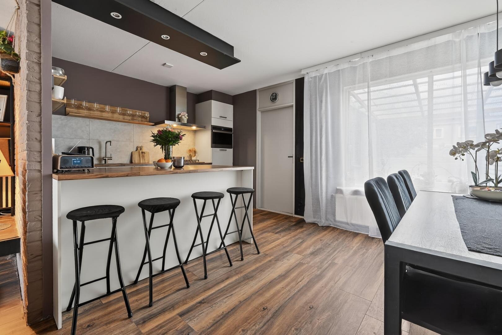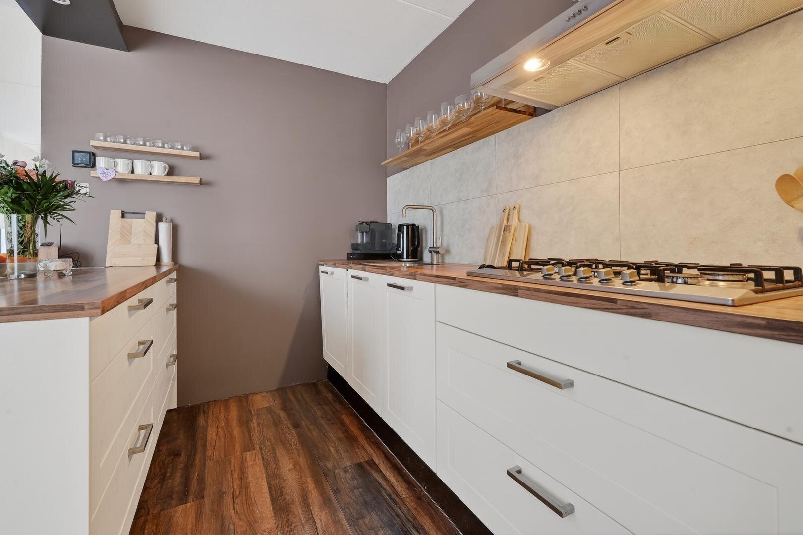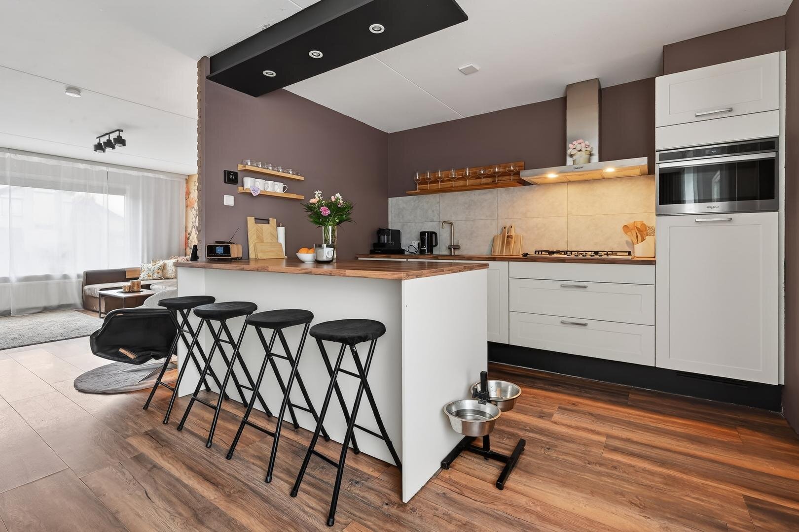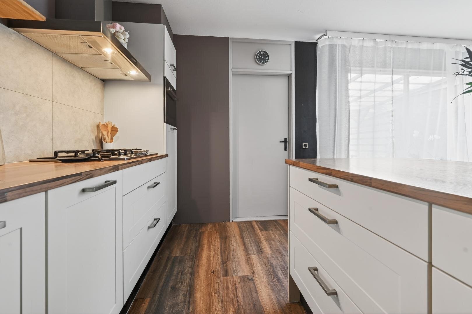 Begane grond: bij binnenkomst kom je in een ruime hal met een apart toilet. Vanuit de hal leidt een trap naar de eerste verdieping en is er een royale kast onder de trap, ideaal voor opbergruimte. Vanuit de hal heb je toegang tot de lichte woonkamer, waar een sfeervolle open haard het middelpunt vormt. De woonkamer gaat naadloos over in de eetkamer, die weer grenst aan de open keuken. Deze keuken is volledig uitgerust met moderne inbouwapparatuur zoals koelkast, vaatwasser, 5-pits gaskookplaat, combi-oven en elektrische boiler. Aansluitend aan de keuken vind je de praktische bijkeuken met witgoedaansluitingen, die tevens toegang biedt tot de achtertuin.