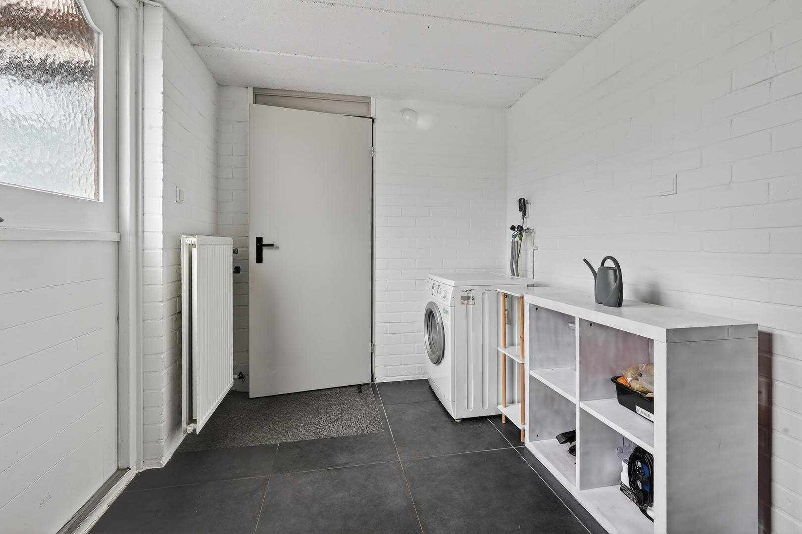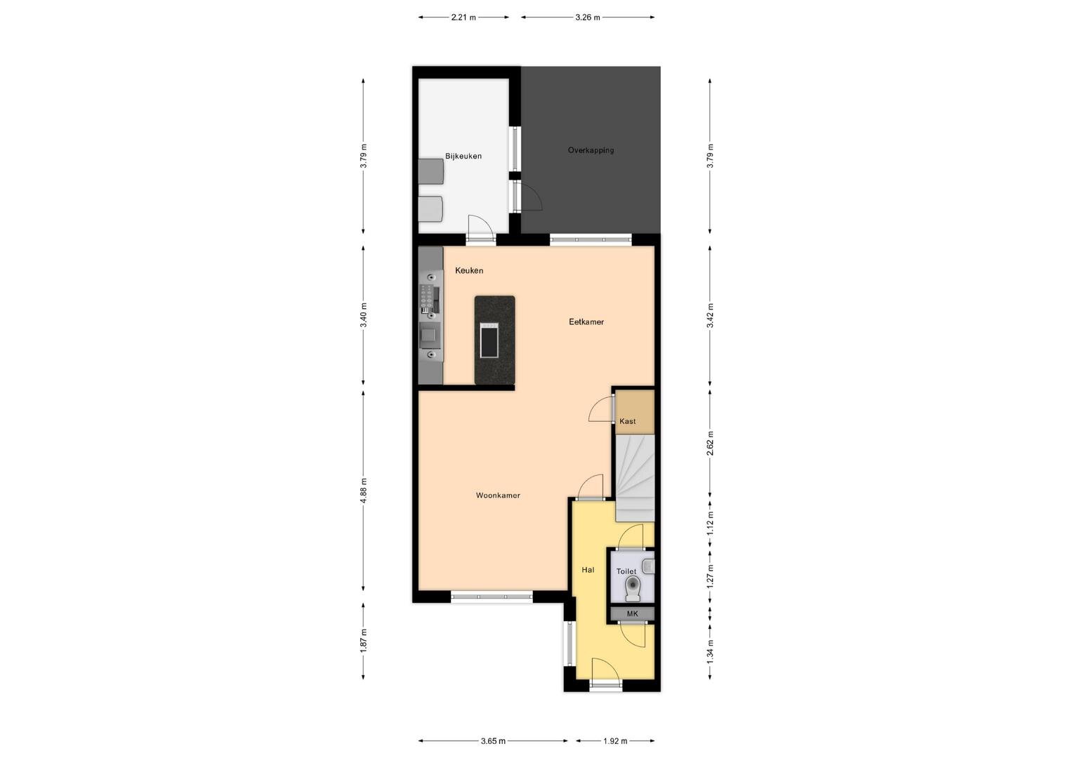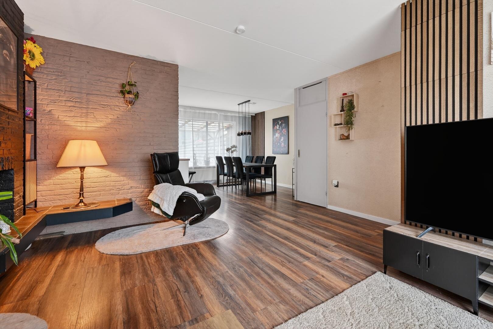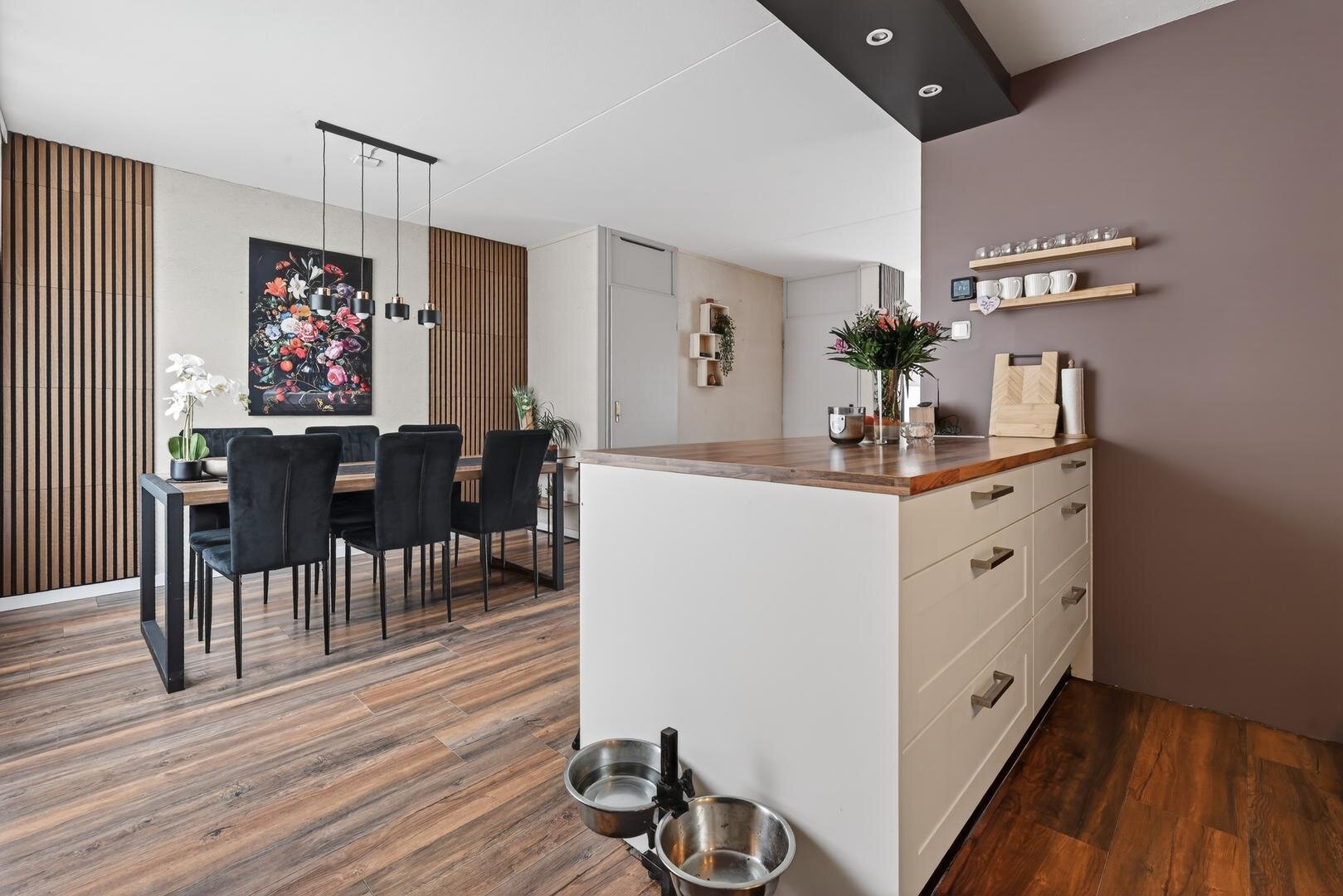 Begane grond: bij binnenkomst kom je in een ruime hal met een apart toilet. Vanuit de hal leidt een trap naar de eerste verdieping en is er een royale kast onder de trap, ideaal voor opbergruimte. Vanuit de hal heb je toegang tot de lichte woonkamer, waar een sfeervolle open haard het middelpunt vormt. De woonkamer gaat naadloos over in de eetkamer, die weer grenst aan de open keuken. Deze keuken is volledig uitgerust met moderne inbouwapparatuur zoals koelkast, vaatwasser, 5-pits gaskookplaat, combi-oven en elektrische boiler. Aansluitend aan de keuken vind je de praktische bijkeuken met witgoedaansluitingen, die tevens toegang biedt tot de achtertuin.