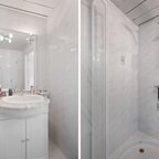 Eerste verdieping: via de overloop heeft u toegang tot de vier slaapkamers en de lichte badkamer, welke is voorzien van een douchecabine, een designradiator en een vaste wastafelmeubel.