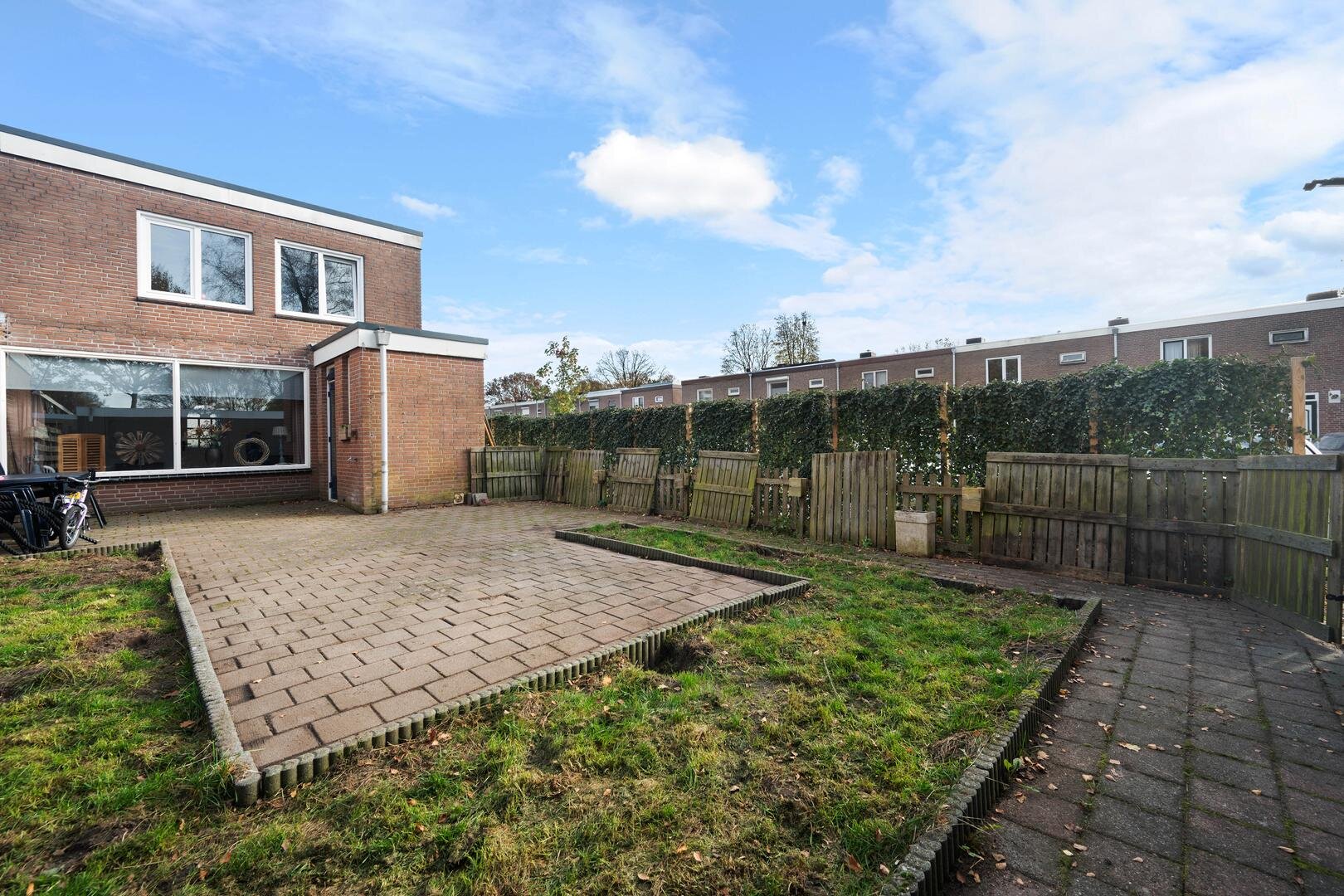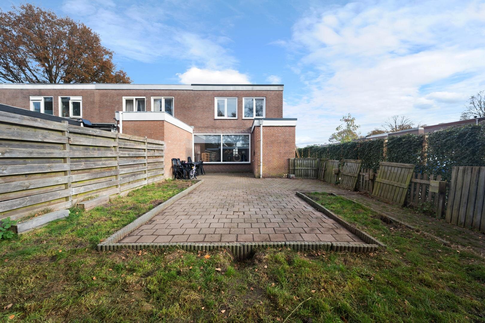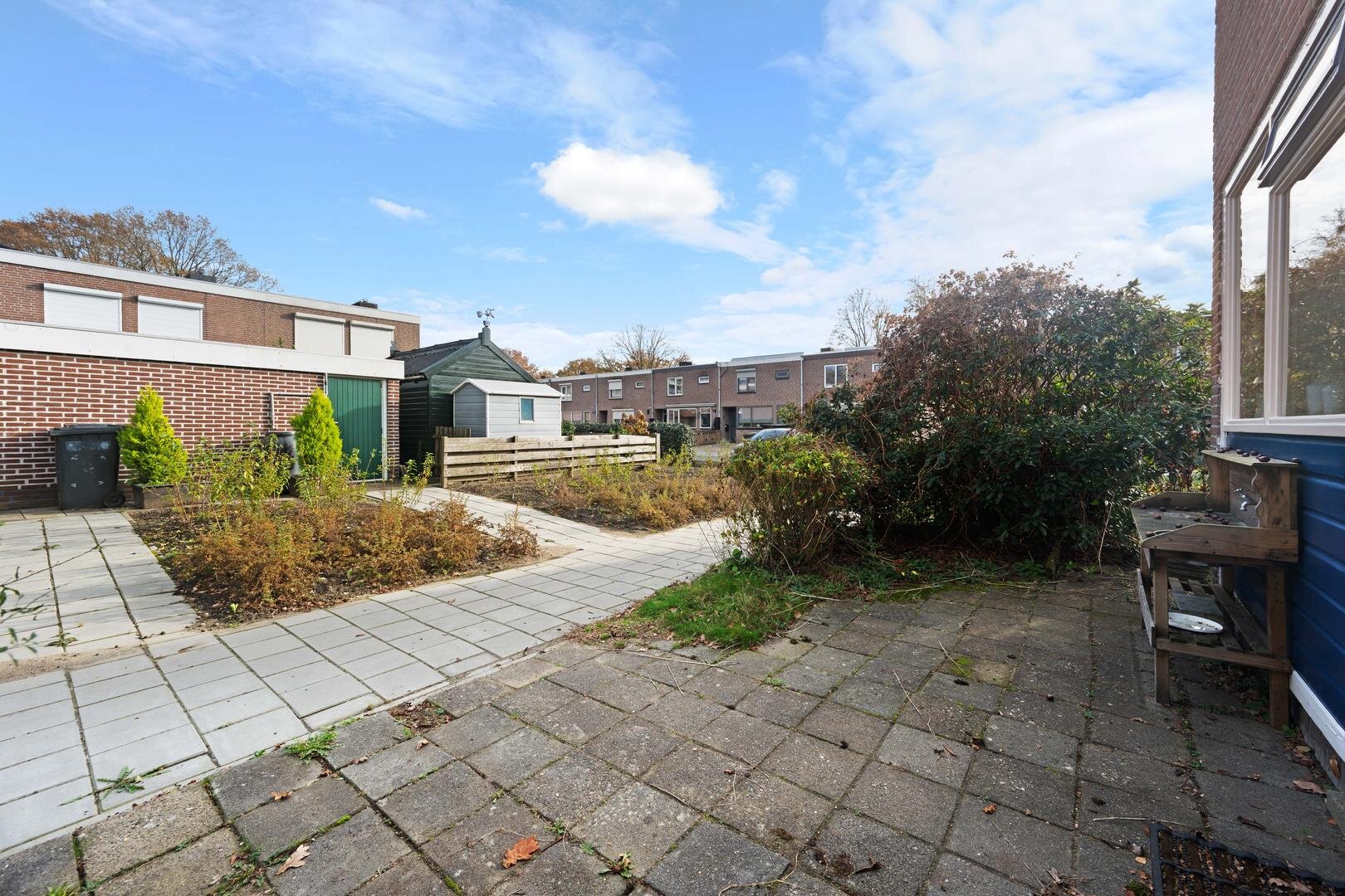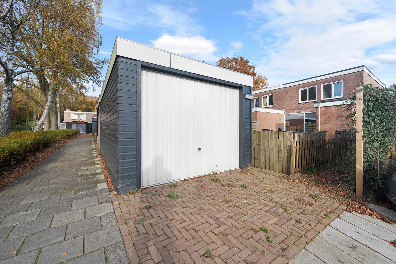 Tuin en bijgebouwen: de woning heeft een onderhoudsarme voortuin die geheel is bestraat, en een westelijk georiënteerde achtertuin die eveneens is bestraat met aparte borders en is voorzien van een houten garage. De ligging is prettig te noemen aan het eind van een doodlopend straatje, grenzend aan openbaar groen. Er is daardoor veel privacy aanwezig.
