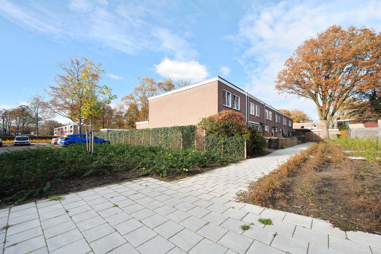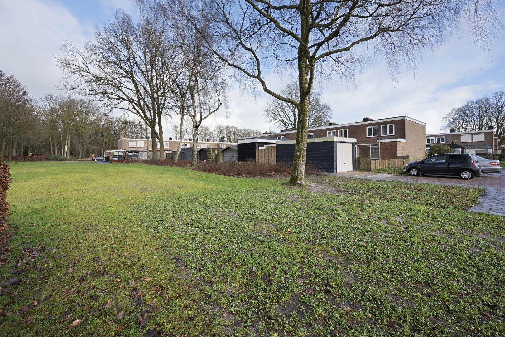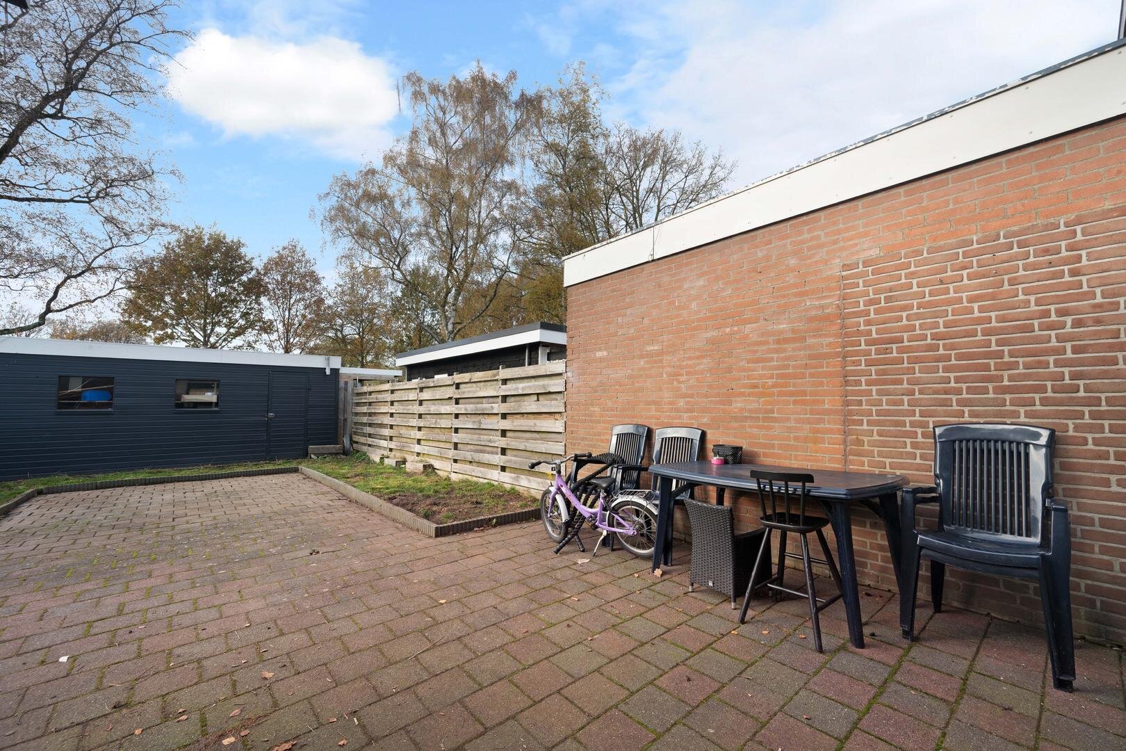 Tuin en bijgebouwen: de woning heeft een onderhoudsarme voortuin die geheel is bestraat, en een westelijk georiënteerde achtertuin die eveneens is bestraat met aparte borders en is voorzien van een houten garage. De ligging is prettig te noemen aan het eind van een doodlopend straatje, grenzend aan openbaar groen. Er is daardoor veel privacy aanwezig.