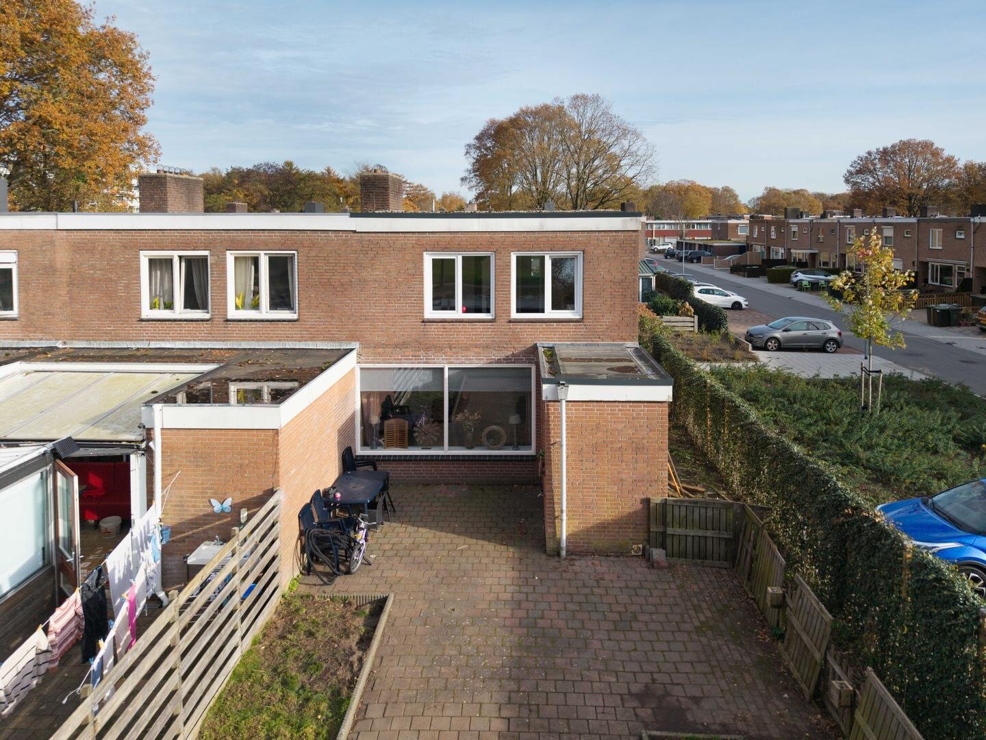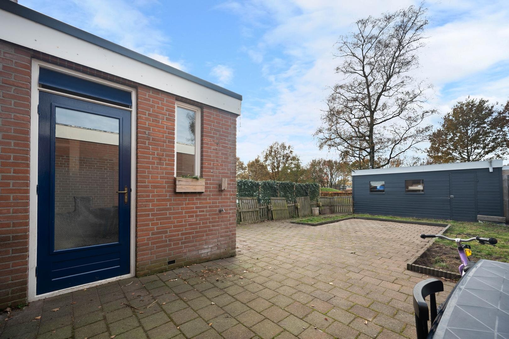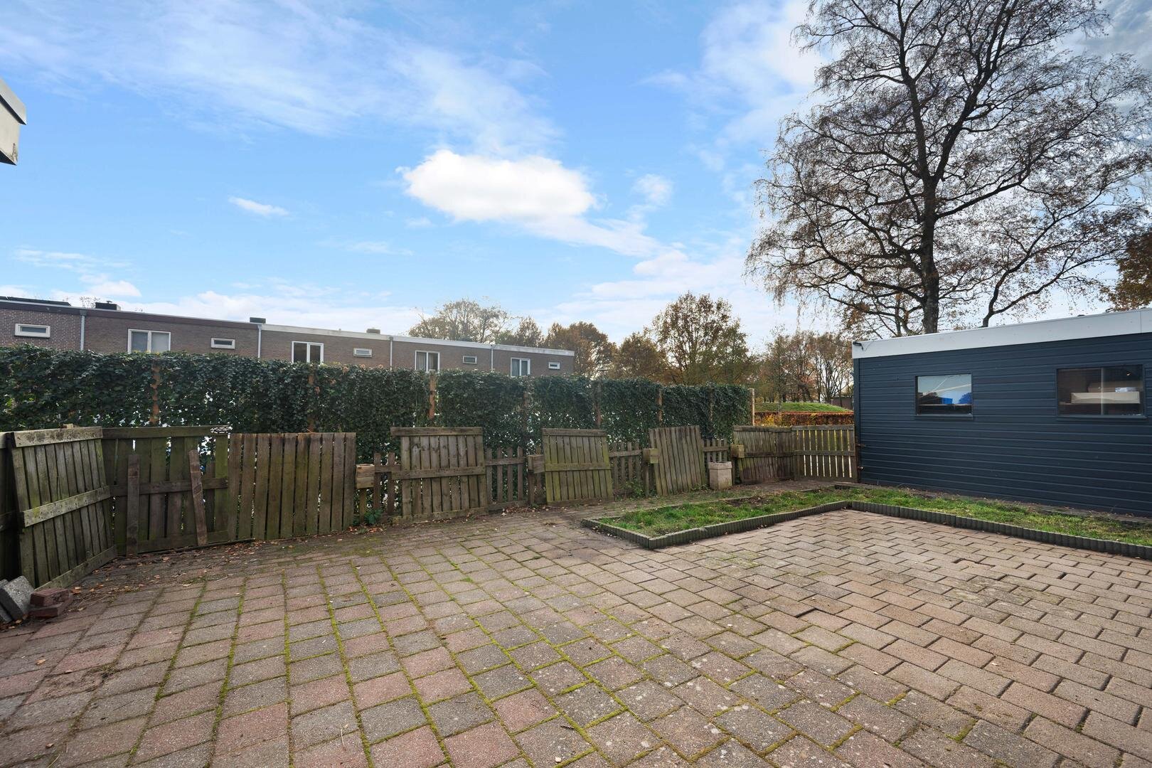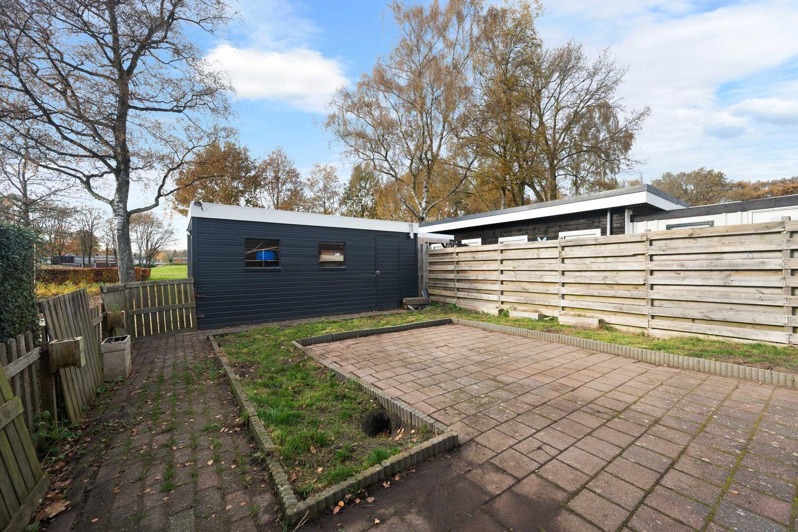 Tuin en bijgebouwen: de woning heeft een onderhoudsarme voortuin die geheel is bestraat, en een westelijk georiënteerde achtertuin die eveneens is bestraat met aparte borders en is voorzien van een houten garage. De ligging is prettig te noemen aan het eind van een doodlopend straatje, grenzend aan openbaar groen. Er is daardoor veel privacy aanwezig.
