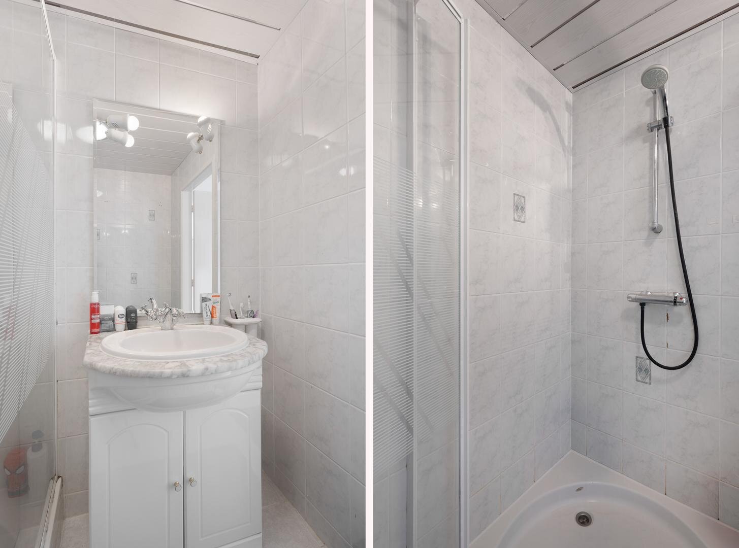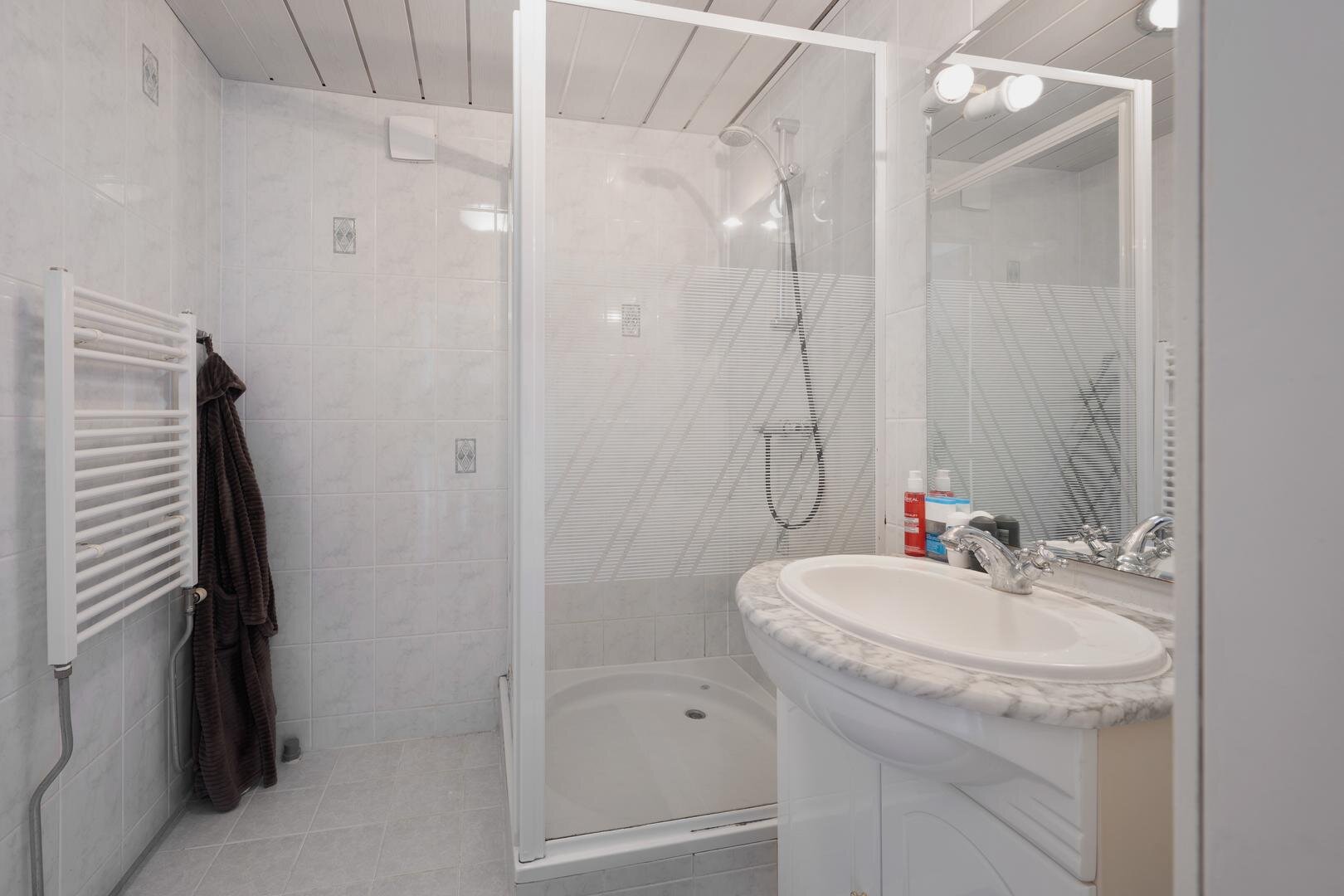 Eerste verdieping: via de overloop heeft u toegang tot de vier slaapkamers en de lichte badkamer, welke is voorzien van een douchecabine, een designradiator en een vaste wastafelmeubel.