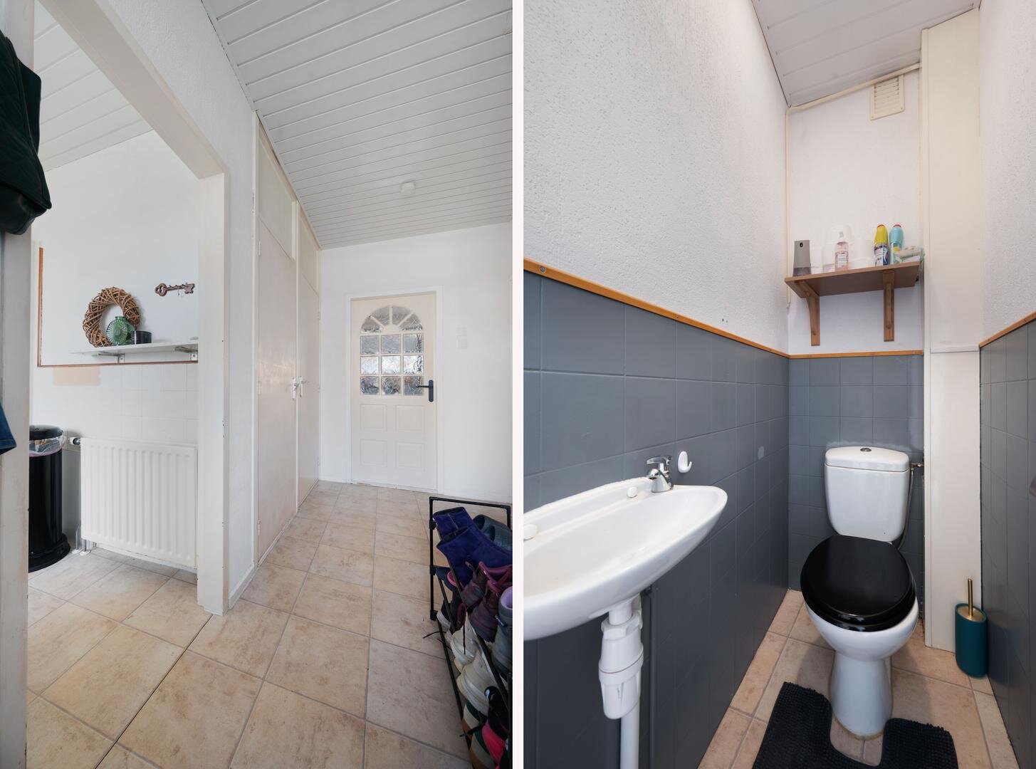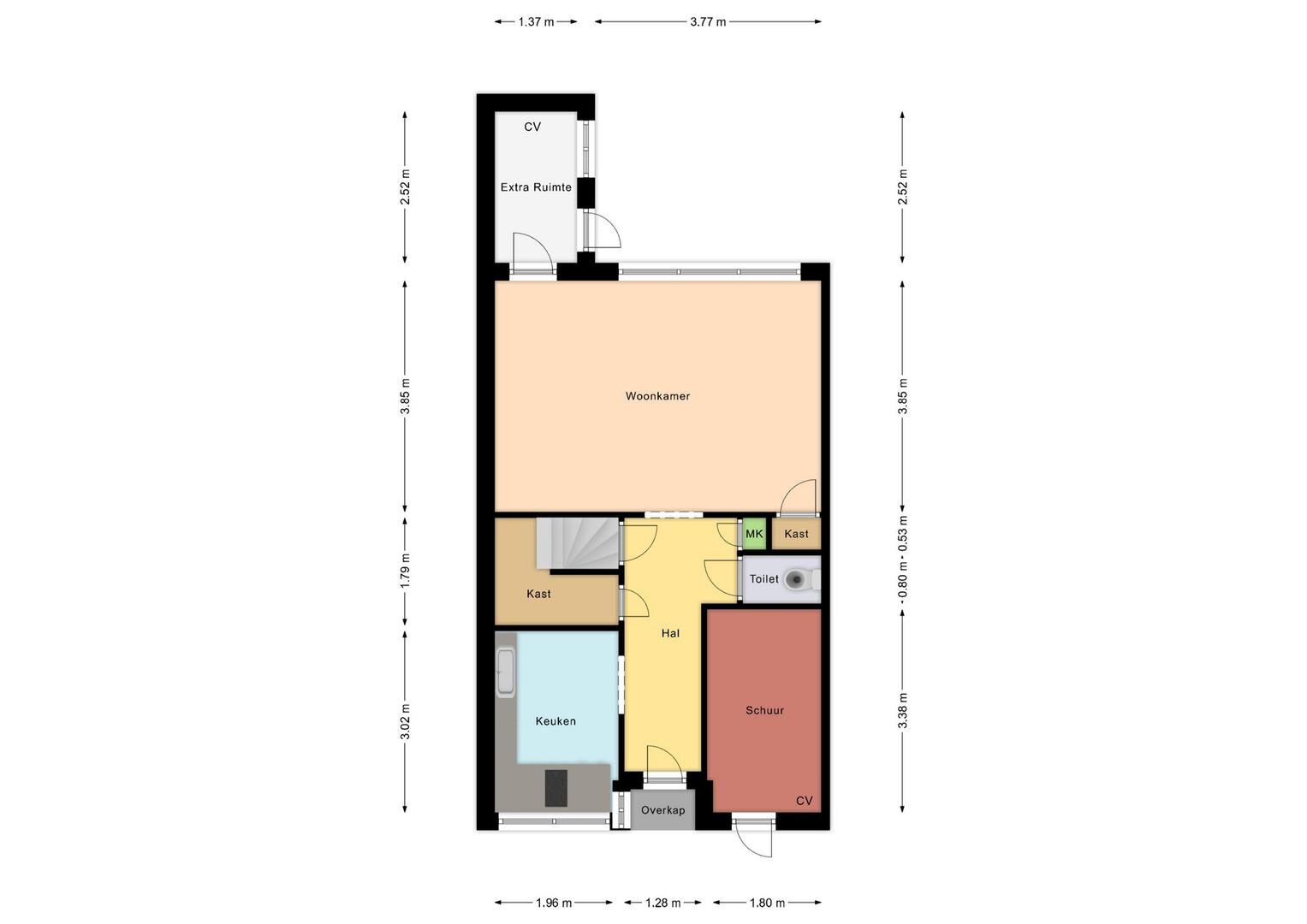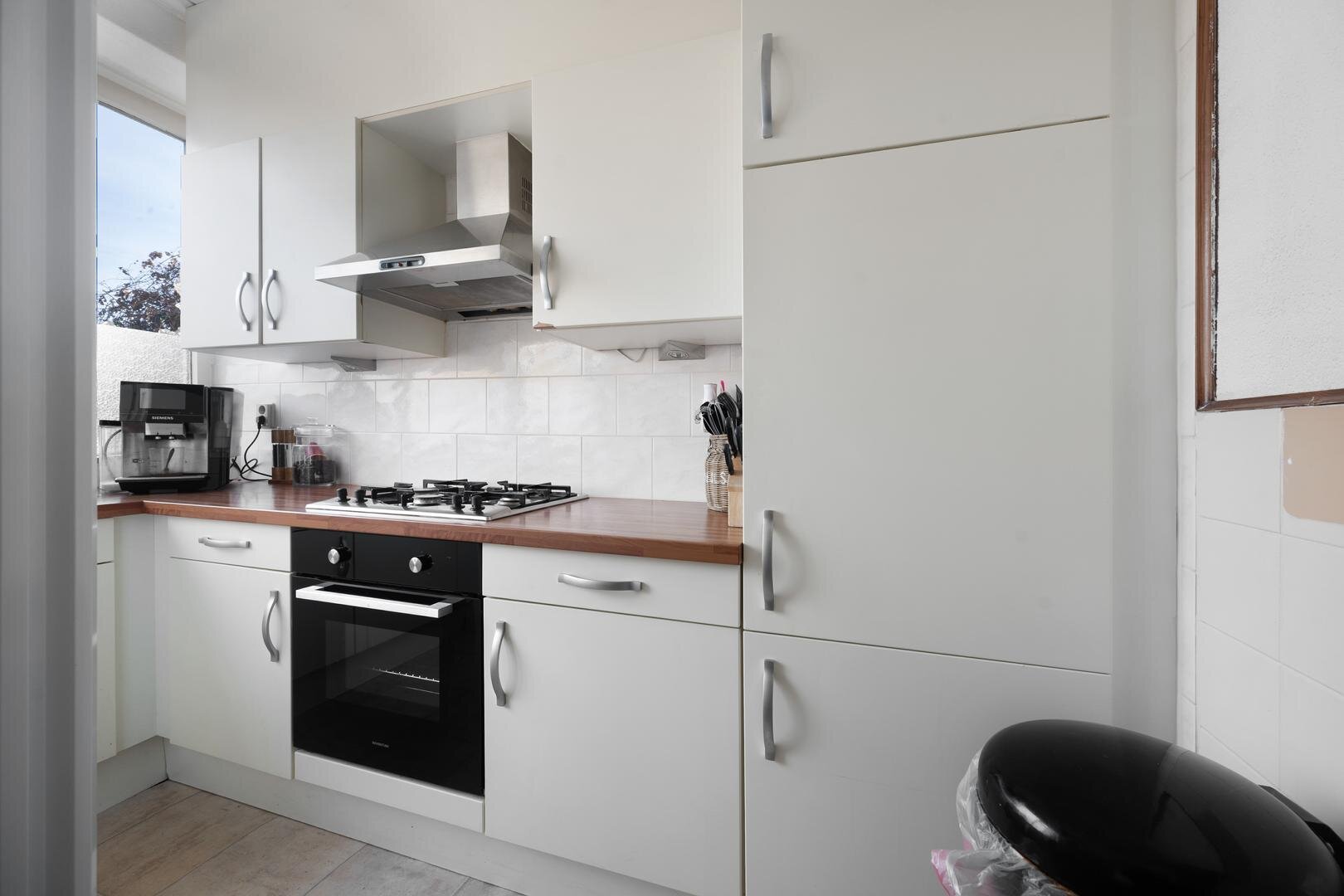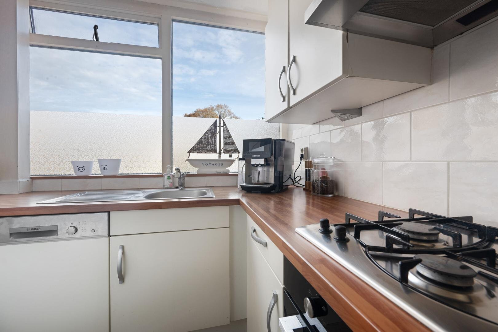 Begane grond: via de entree betreedt u de hal met aansluitend de meterkast en een toilet, gevolgd door een praktische voorraadkast, een dichte maar lichte keuken voorzien van een 4-pits gaskookplaat, rvs-afzuigschouw, vaatwasser en oven, een tuingerichte woonkamer met vaste kast en een bijkeuken met witgoedaansluiting en CV-ketel.