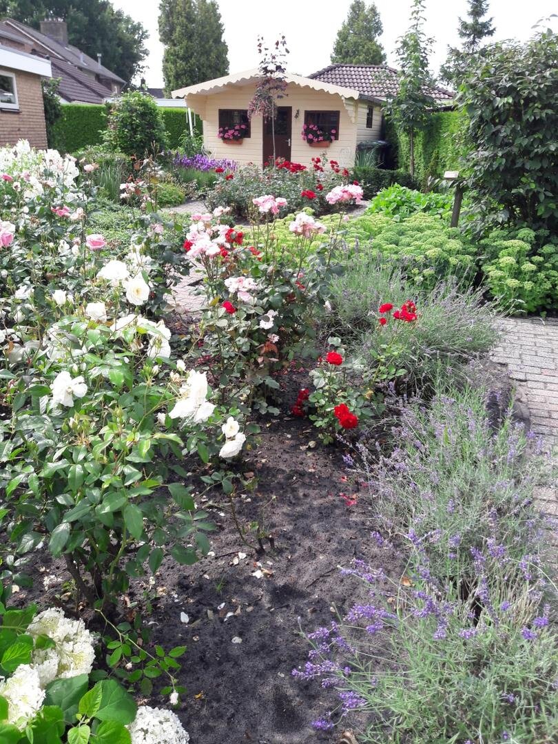 Tuin en bijgebouwen: de tuin, die op het zonnige zuidwesten ligt, is mooi aangelegd met een bloementuin, borders, bestrating en een gazon, en bevat tevens een aangebouwde stenen garage met elektrische deur, een overdekte aluminium veranda en een blokhut op betonplaat.