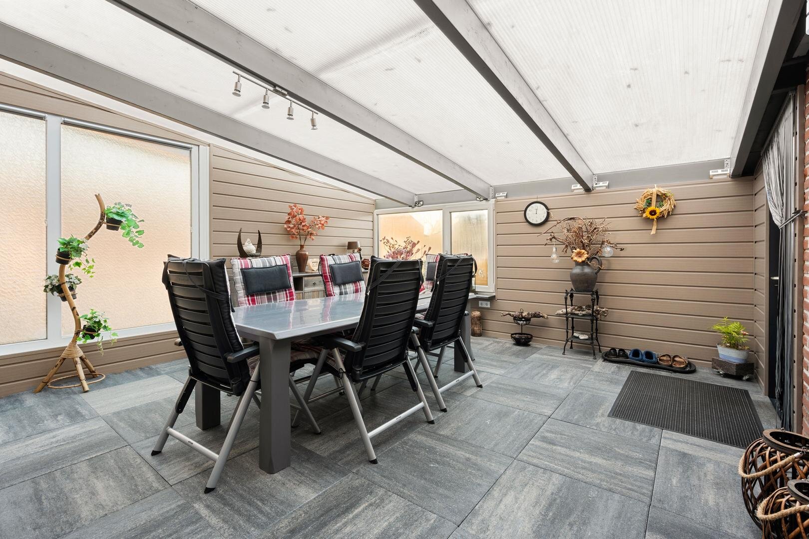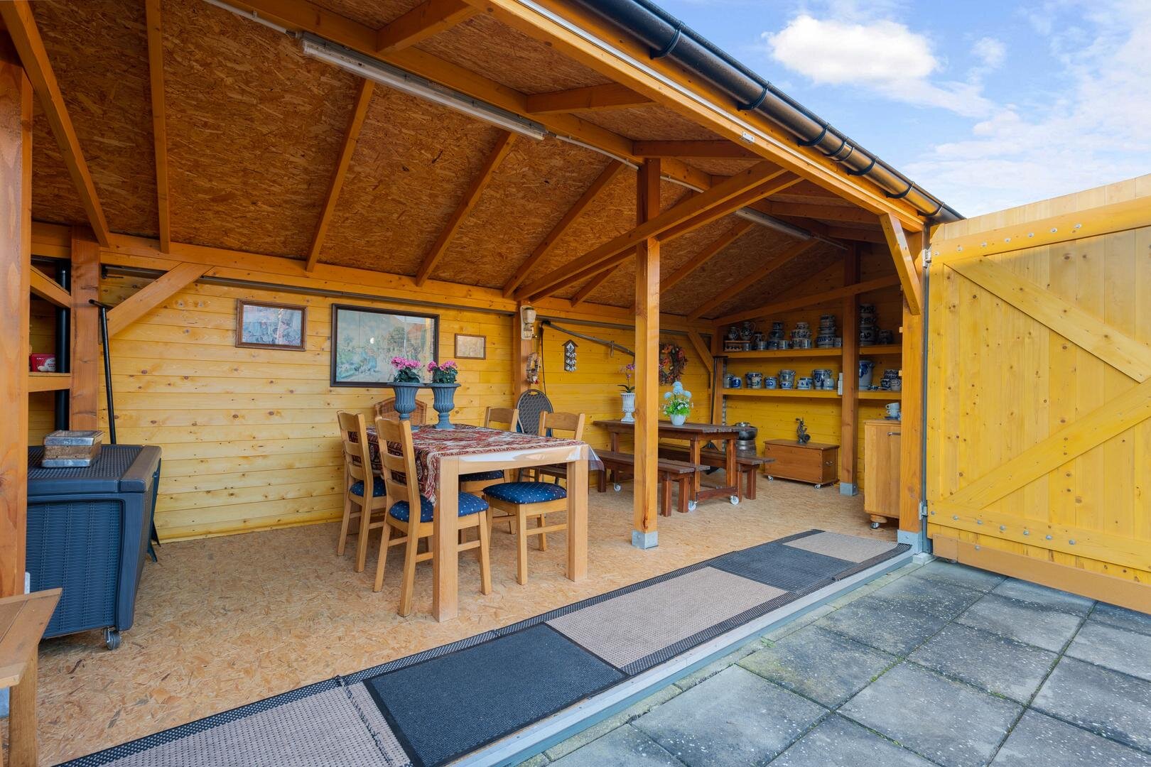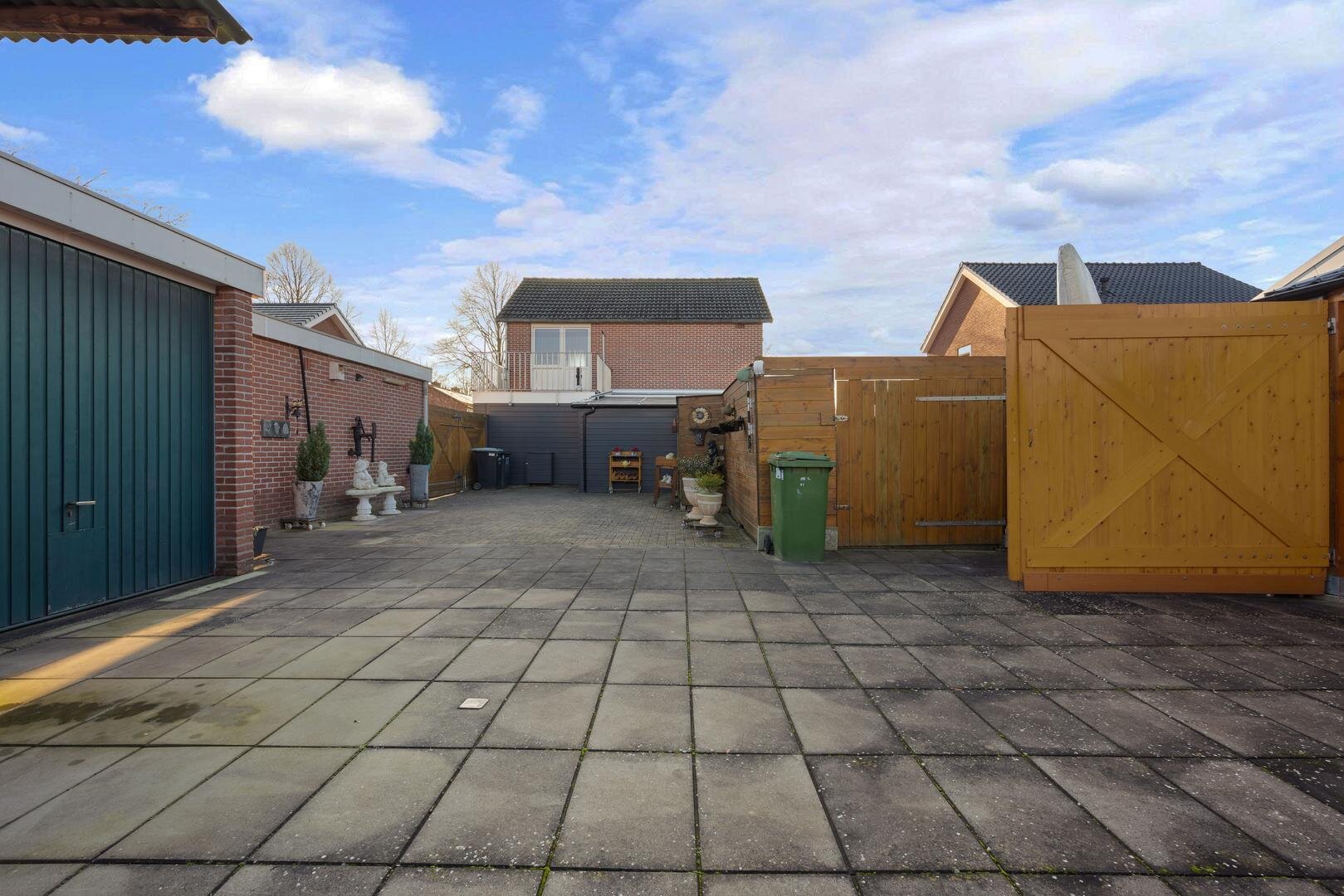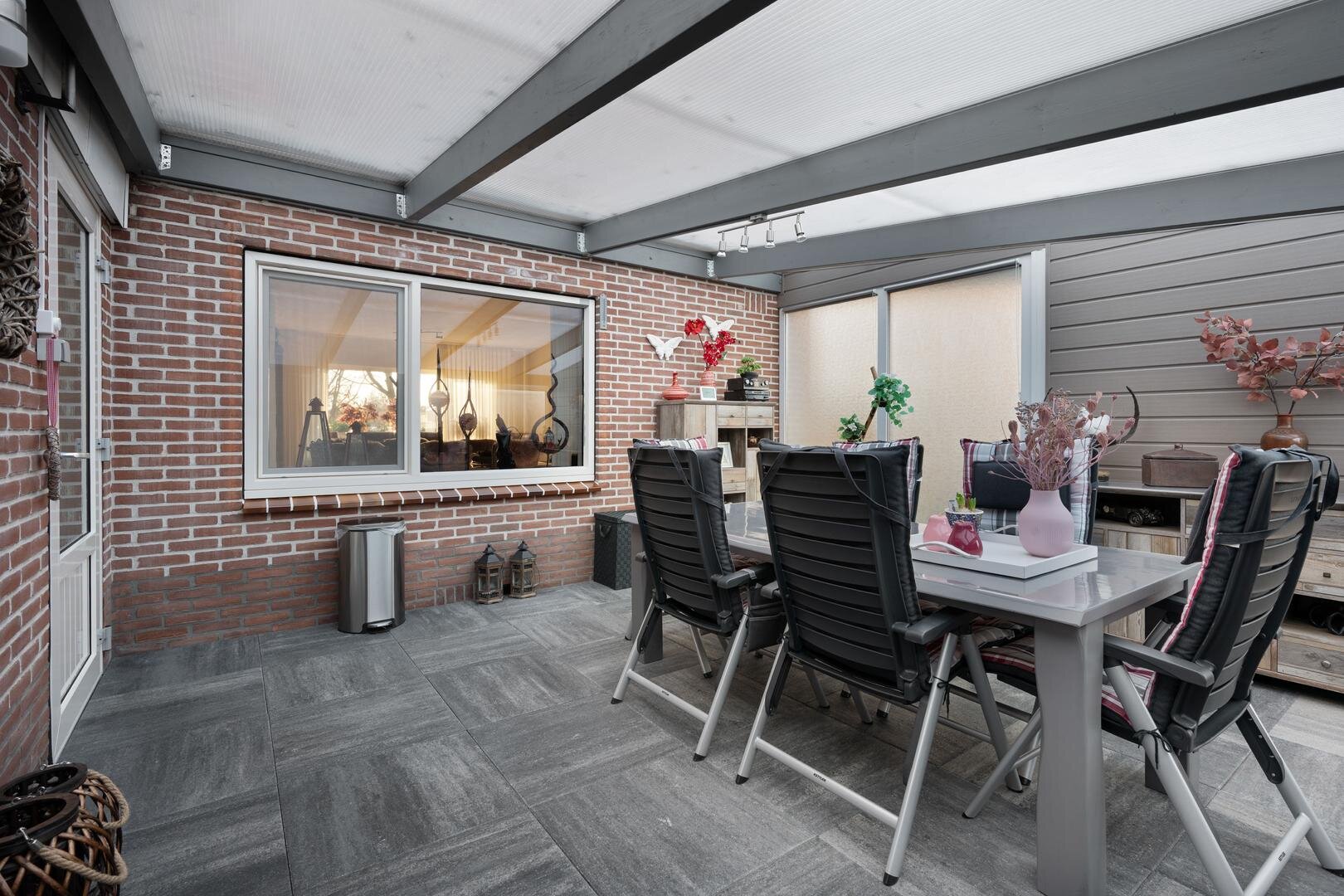 Tuin en bijgebouwen: De woning beschikt over een voortuin die als siertuin is aangelegd. Naast de woning is een inrit aanwezig die toegang geeft tot de achterzijde, waar twee vrijstaande stenen garages met elektrische deur en betonvloer staan en een overkapping, ideaal als caravanstalling. Aan de woning zelf is een overdekte tuinkamer/serre gerealiseerd (2023), eveneens voorzien van een betonvloer en een overdekte zonnescherm. De achtertuin, gelegen op het noorden, is onderhoudsarm ingericht en biedt ruimte voor bijvoorbeeld een moestuintje, verschillende terrassen en een afsluitbare kapschuur met overkapping.
