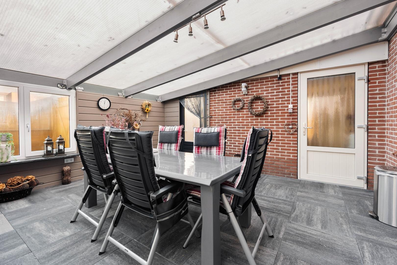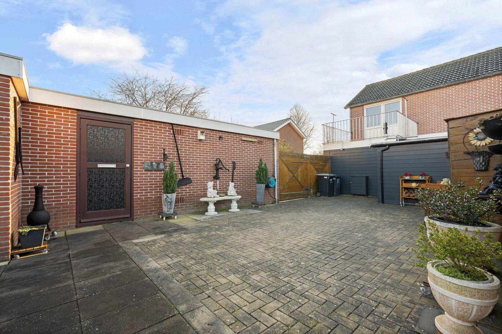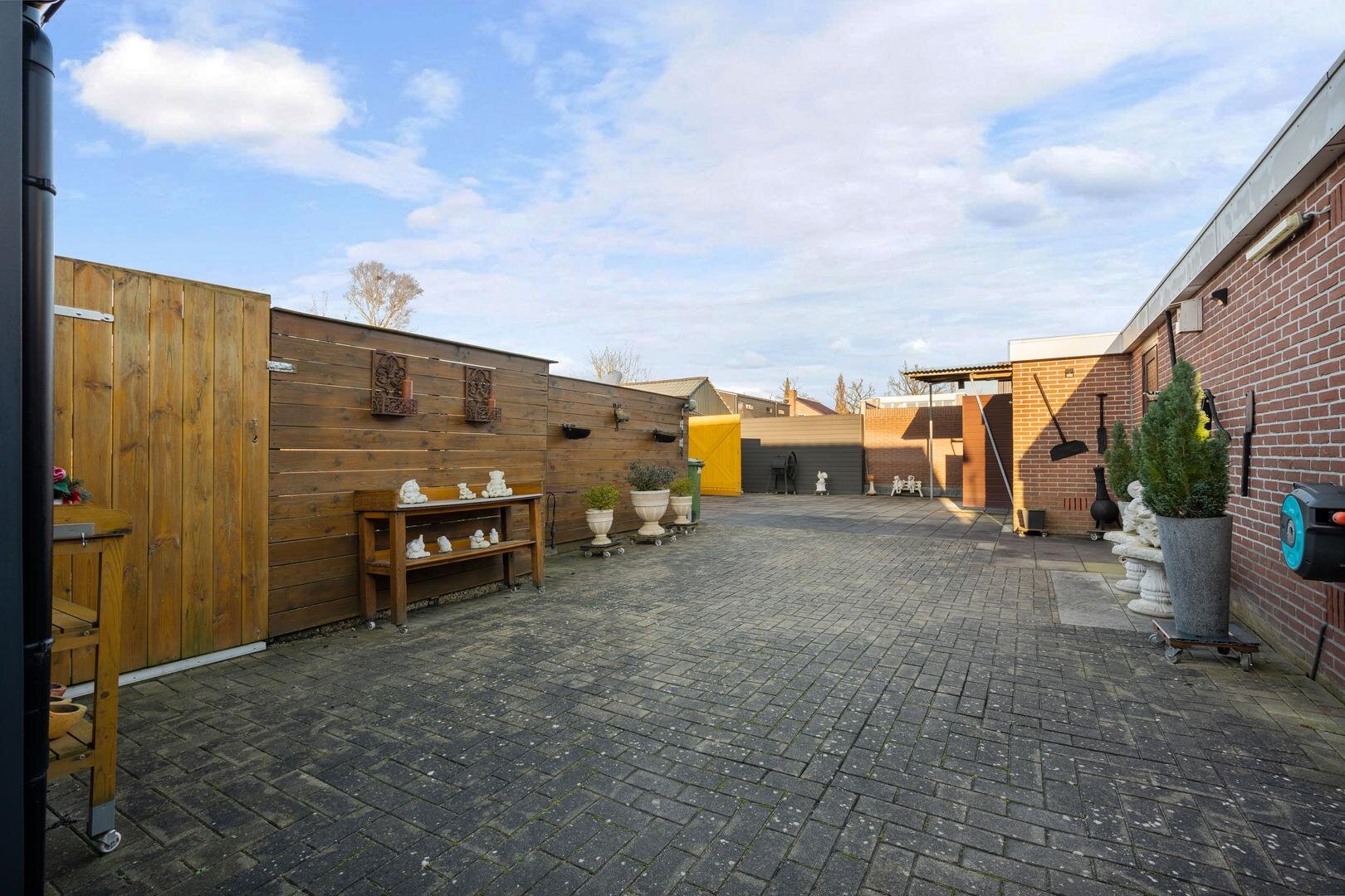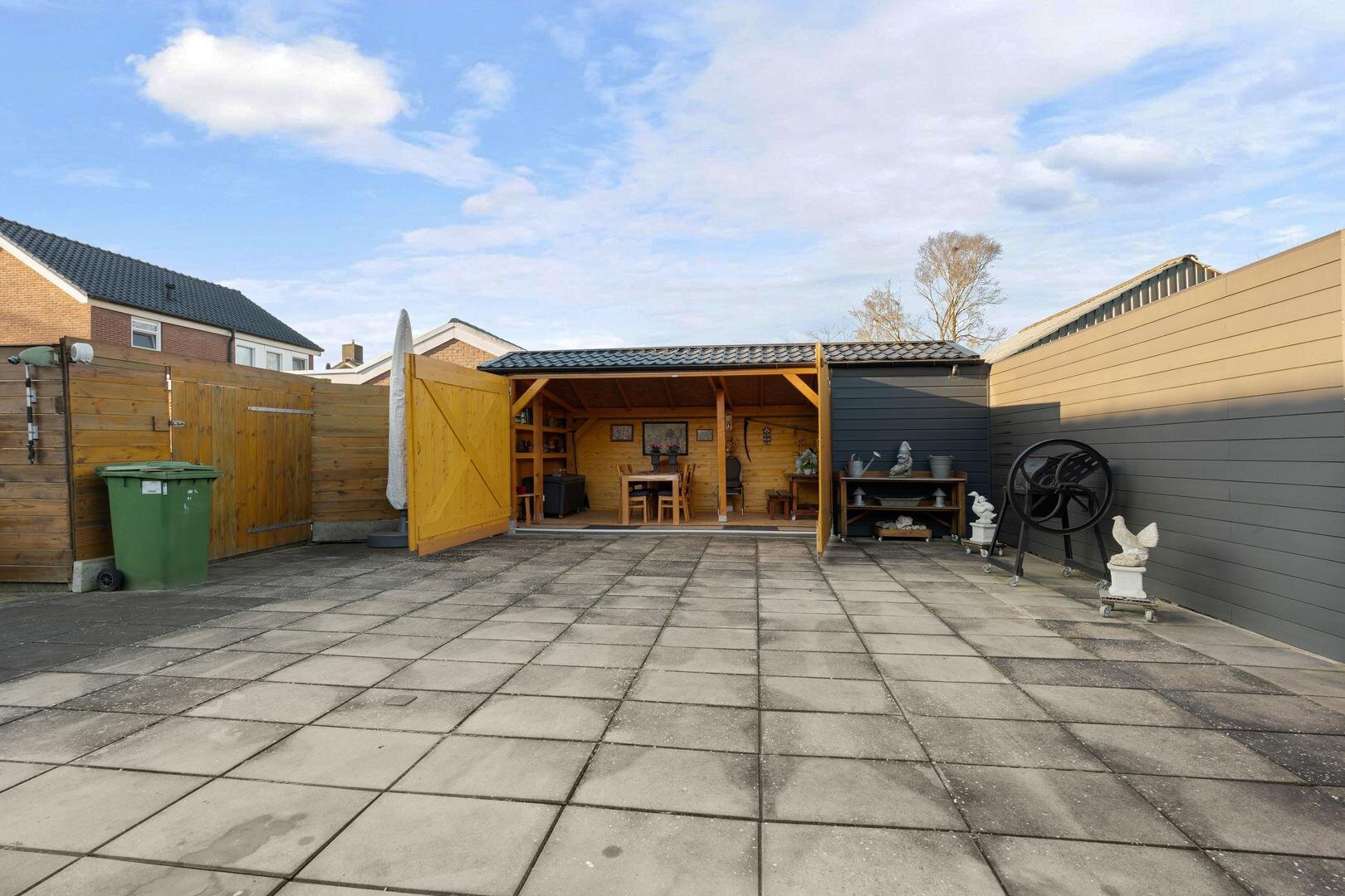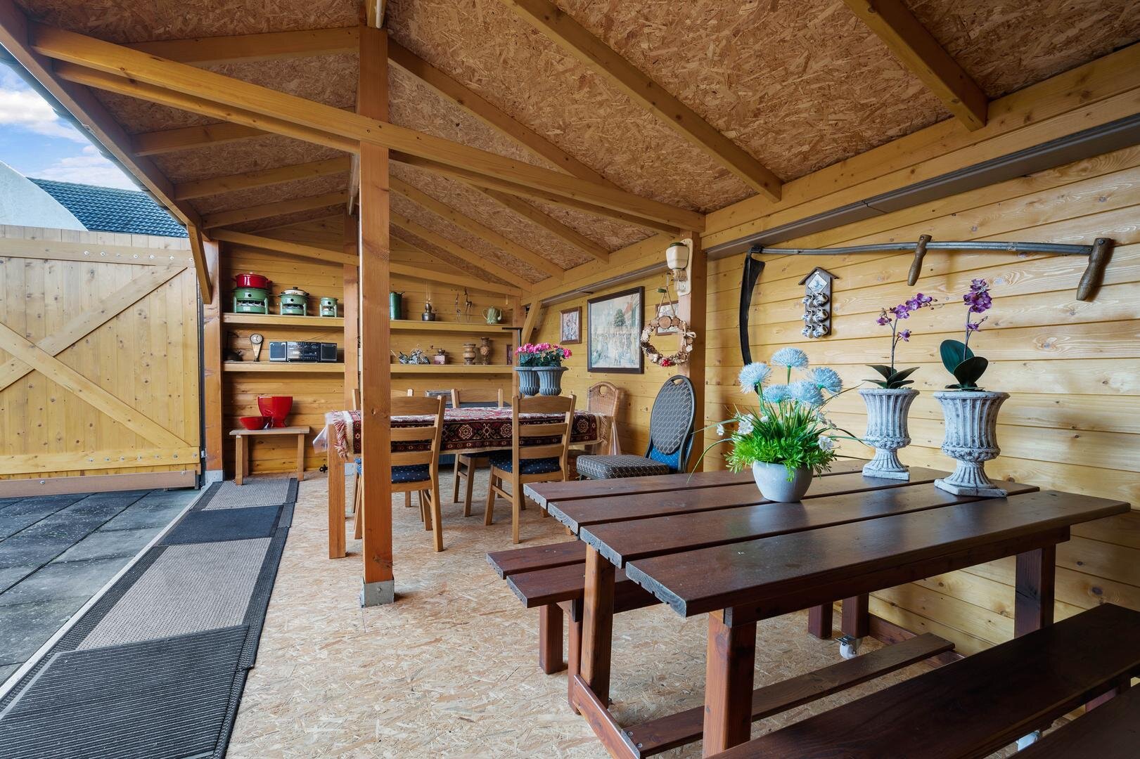 Tuin en bijgebouwen: De woning beschikt over een voortuin die als siertuin is aangelegd. Naast de woning is een inrit aanwezig die toegang geeft tot de achterzijde, waar twee vrijstaande stenen garages met elektrische deur en betonvloer staan en een overkapping, ideaal als caravanstalling. Aan de woning zelf is een overdekte tuinkamer/serre gerealiseerd (2023), eveneens voorzien van een betonvloer en een overdekte zonnescherm. De achtertuin, gelegen op het noorden, is onderhoudsarm ingericht en biedt ruimte voor bijvoorbeeld een moestuintje, verschillende terrassen en een afsluitbare kapschuur met overkapping.
