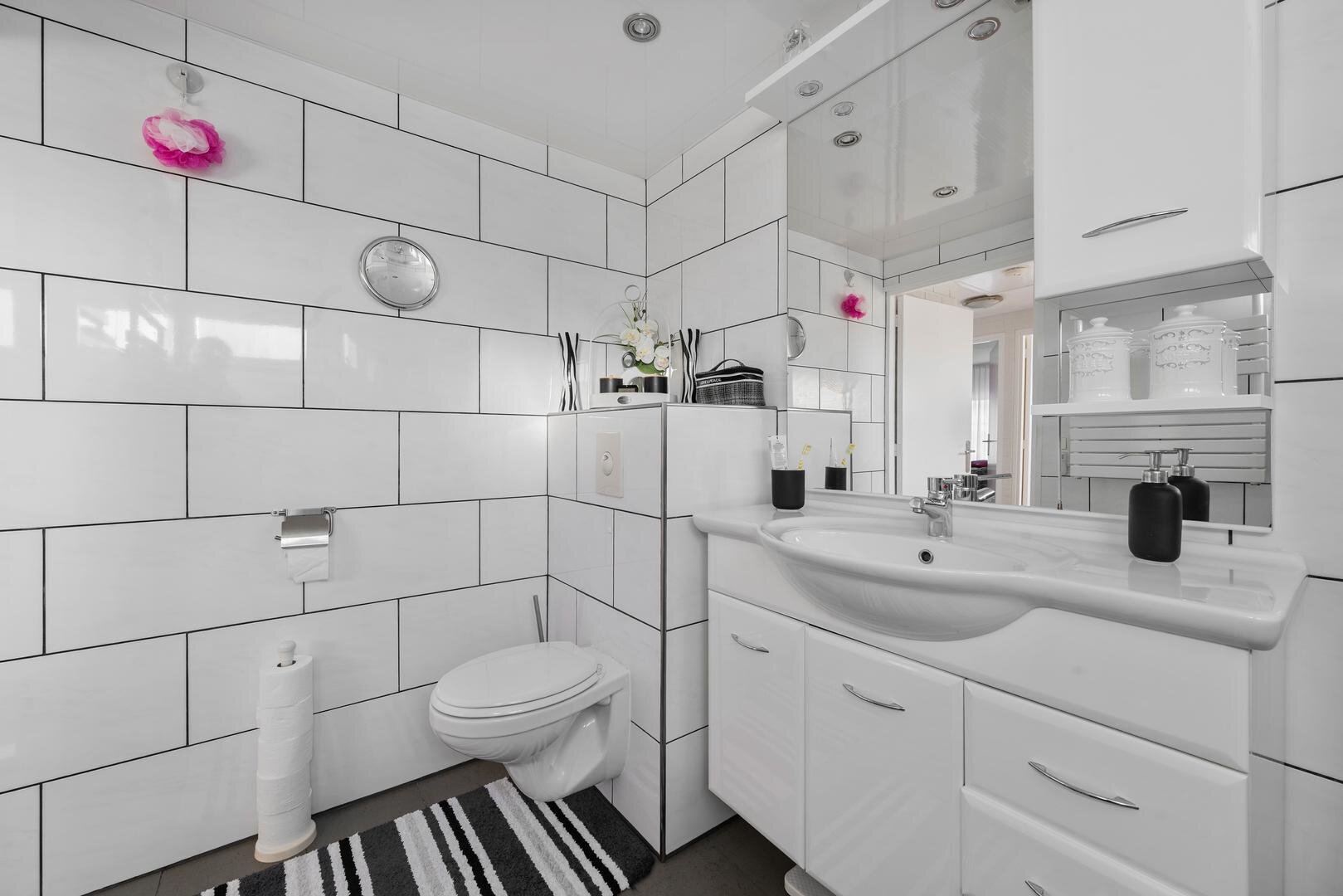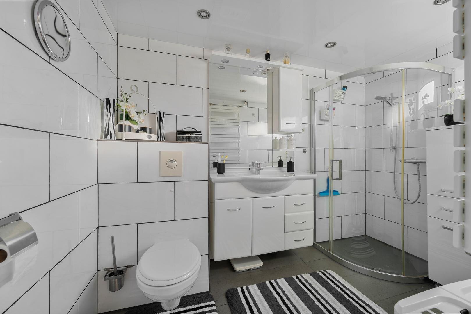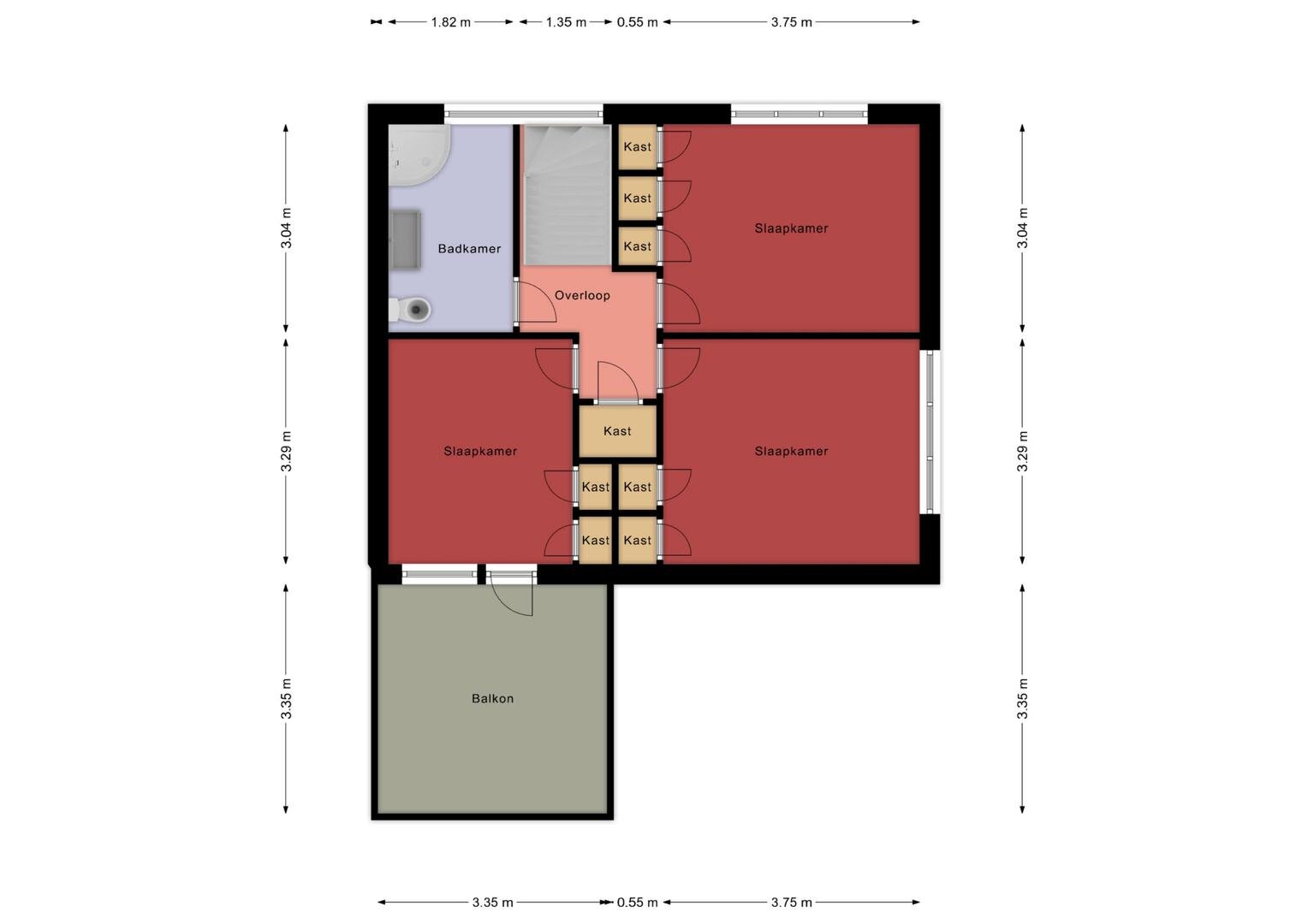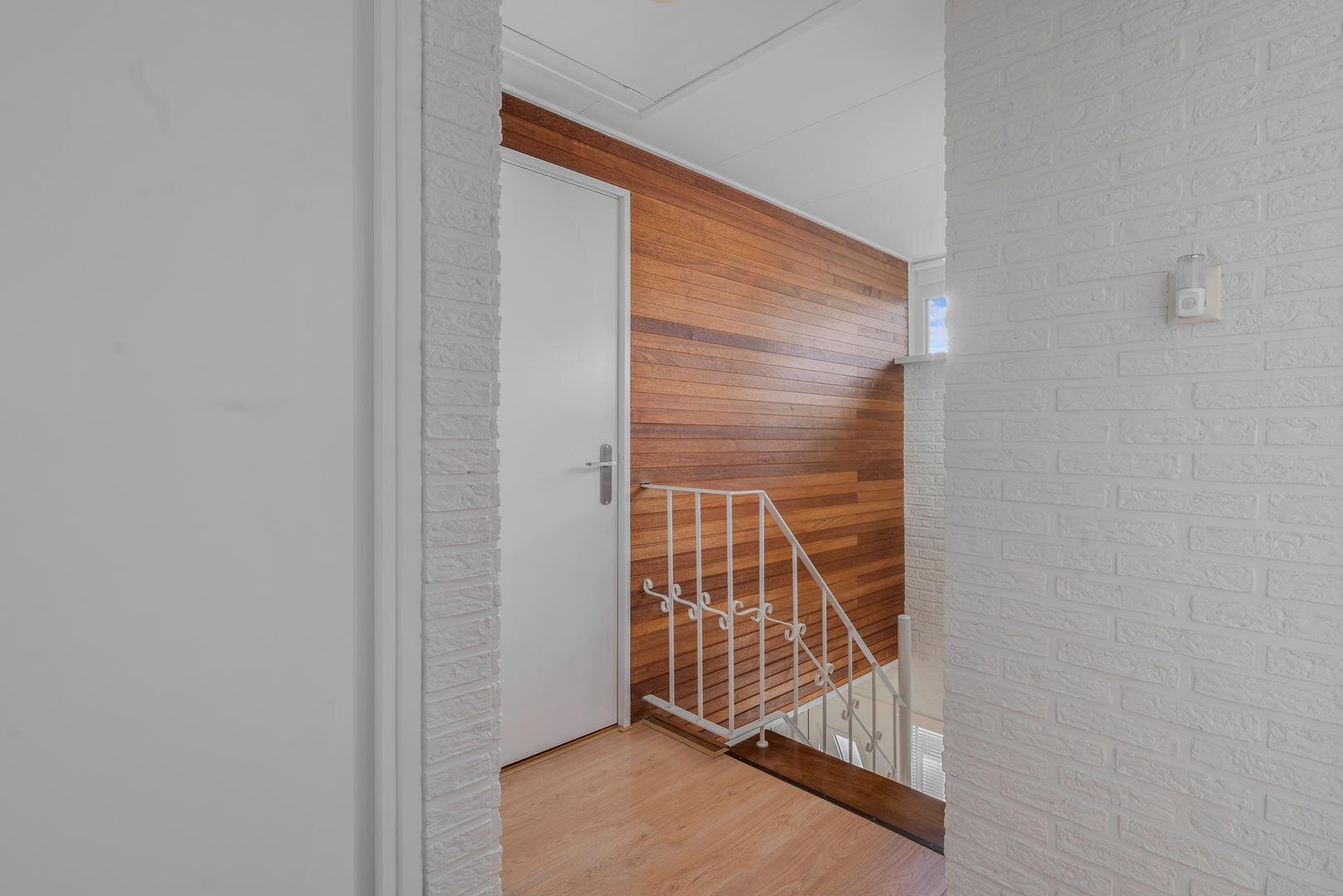 Eerste verdieping: de overloop geeft toegang tot drie ruime slaapkamers, elk voorzien van een vaste kasten die ruime opbergmogelijkheden biedt. De badkamer is compleet ingericht en voorzien van wastafelmeubel, douchecabine, 2e toilet en designradiator. Vanaf de overloop is tevens een dakterras van ca. 11m² bereikbaar.