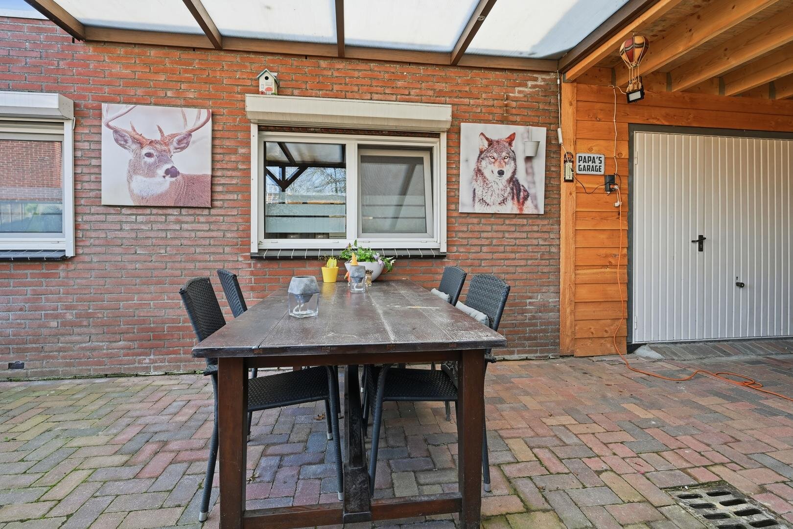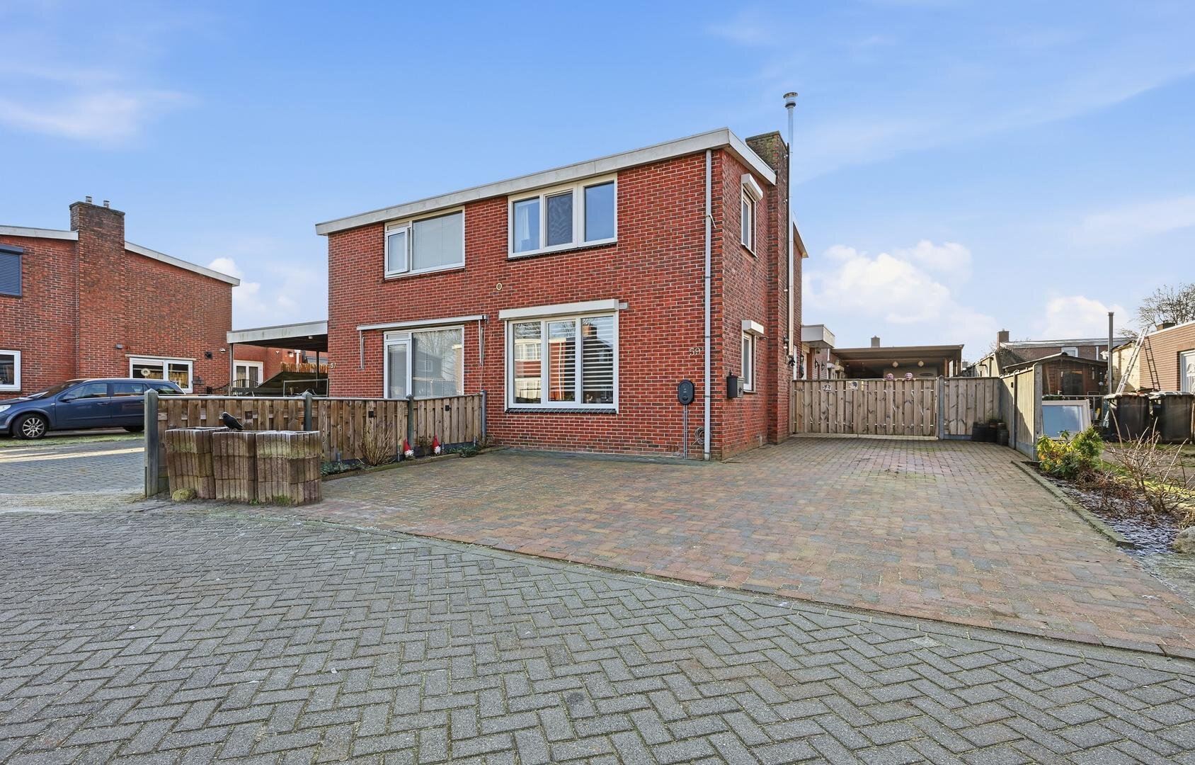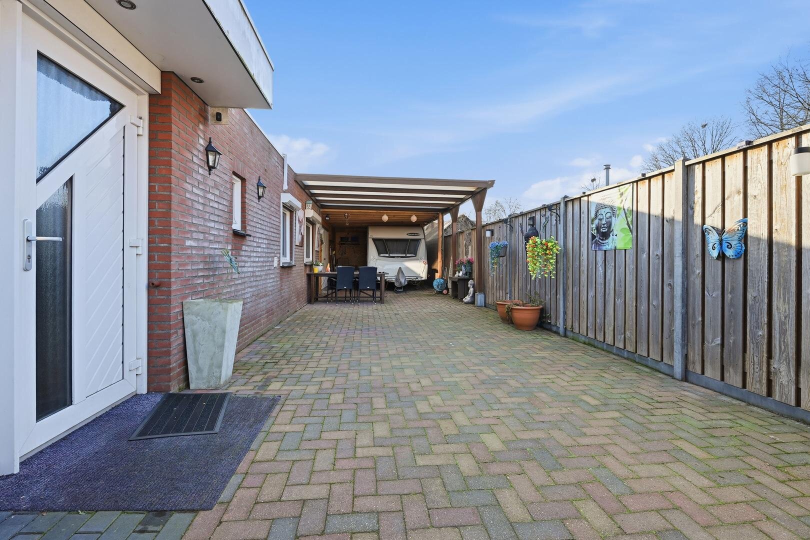 Tuin en bijgebouwen: de woning beschikt over een voortuin en zijtuin, beide voorzien van bestrating en schuttingen. Op het perceel staat een recent gebouwde houten garage, met daaraan grenzend een ruime carport. Het voorste gedeelte van deze overkapping is ingericht als een overdekte veranda, geschikt voor comfortabel en gezellig buiten zitten.