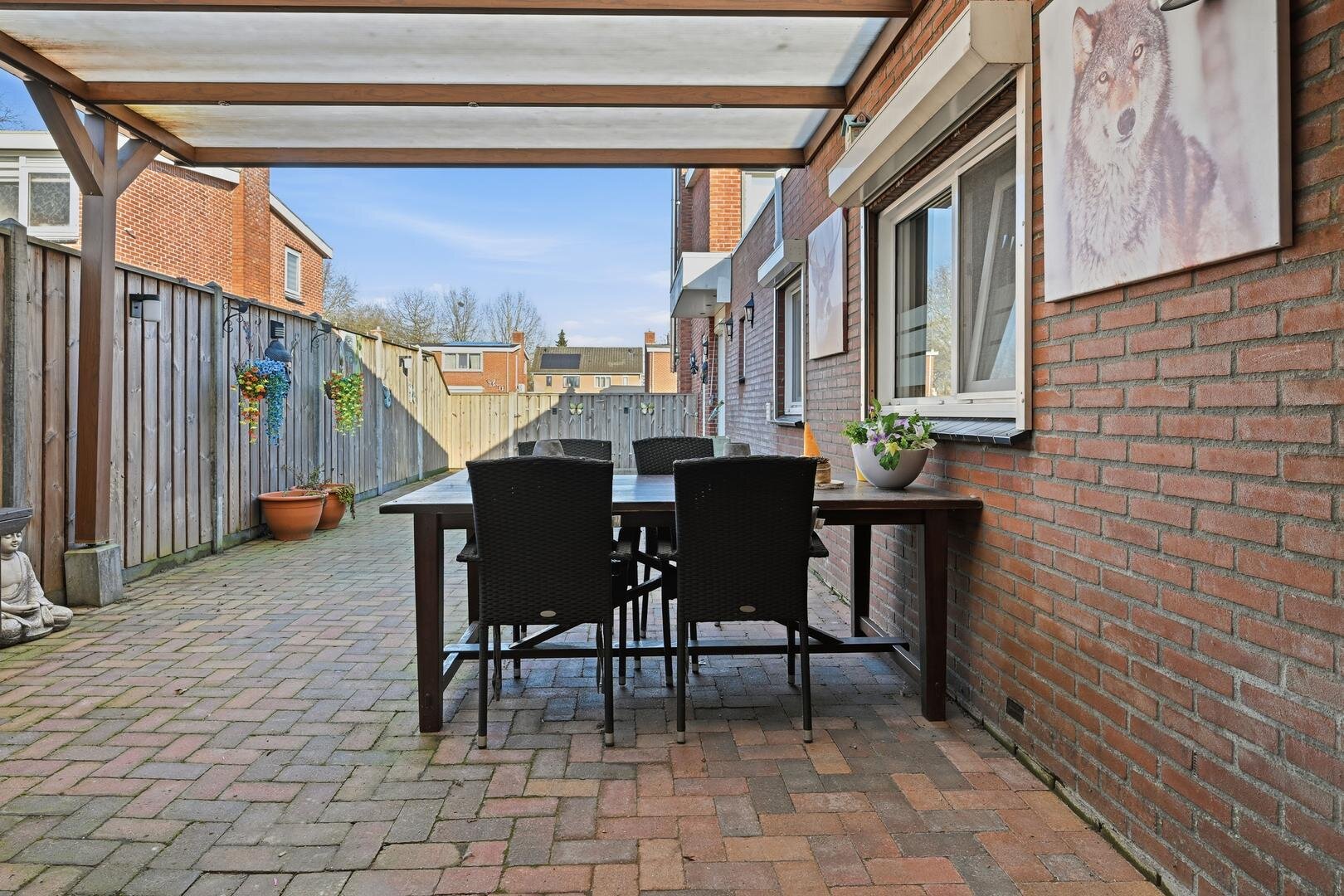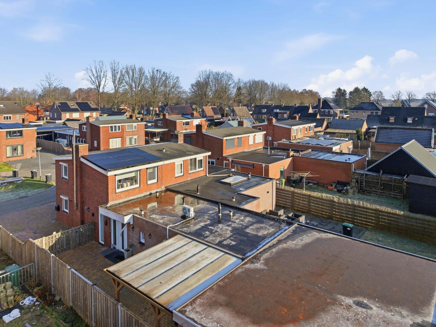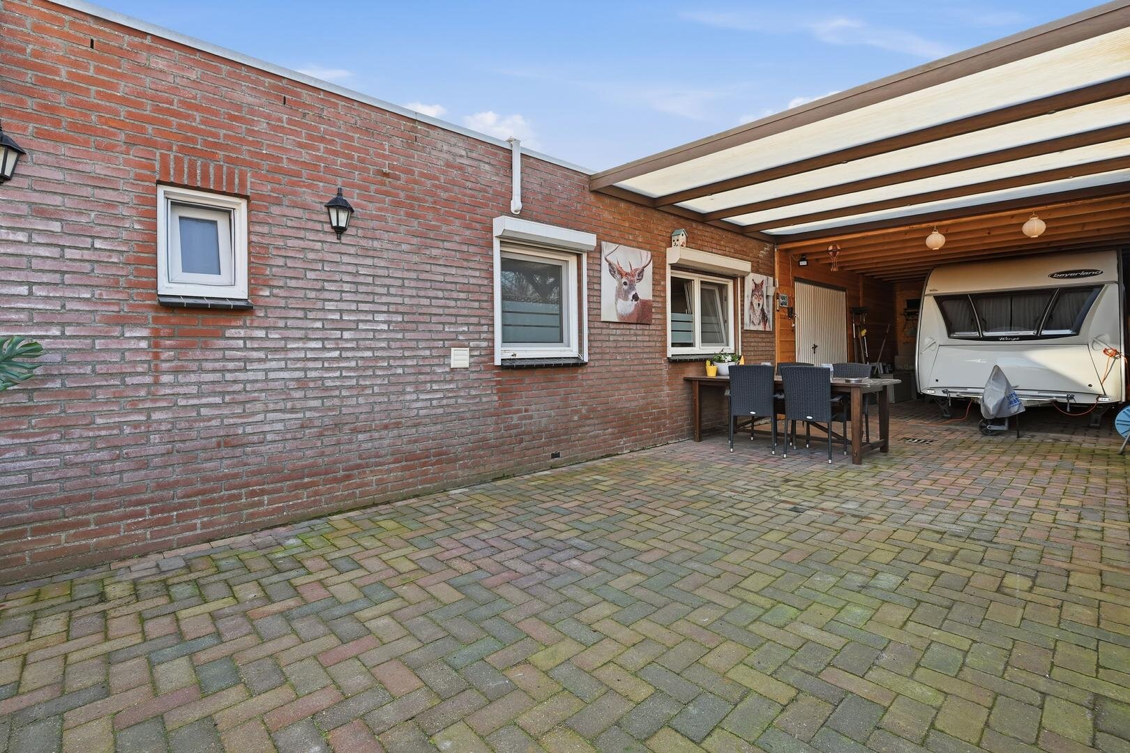 Tuin en bijgebouwen: de woning beschikt over een voortuin en zijtuin, beide voorzien van bestrating en schuttingen. Op het perceel staat een recent gebouwde houten garage, met daaraan grenzend een ruime carport. Het voorste gedeelte van deze overkapping is ingericht als een overdekte veranda, geschikt voor comfortabel en gezellig buiten zitten.
