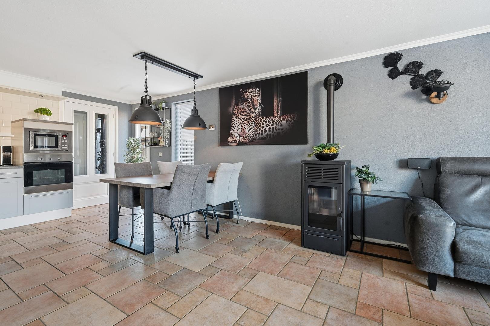 - verwarming via radiatoren, vloerverwarming, pelletkachel, airconditioning en cv-ketel Remeha HRE uit 2021;