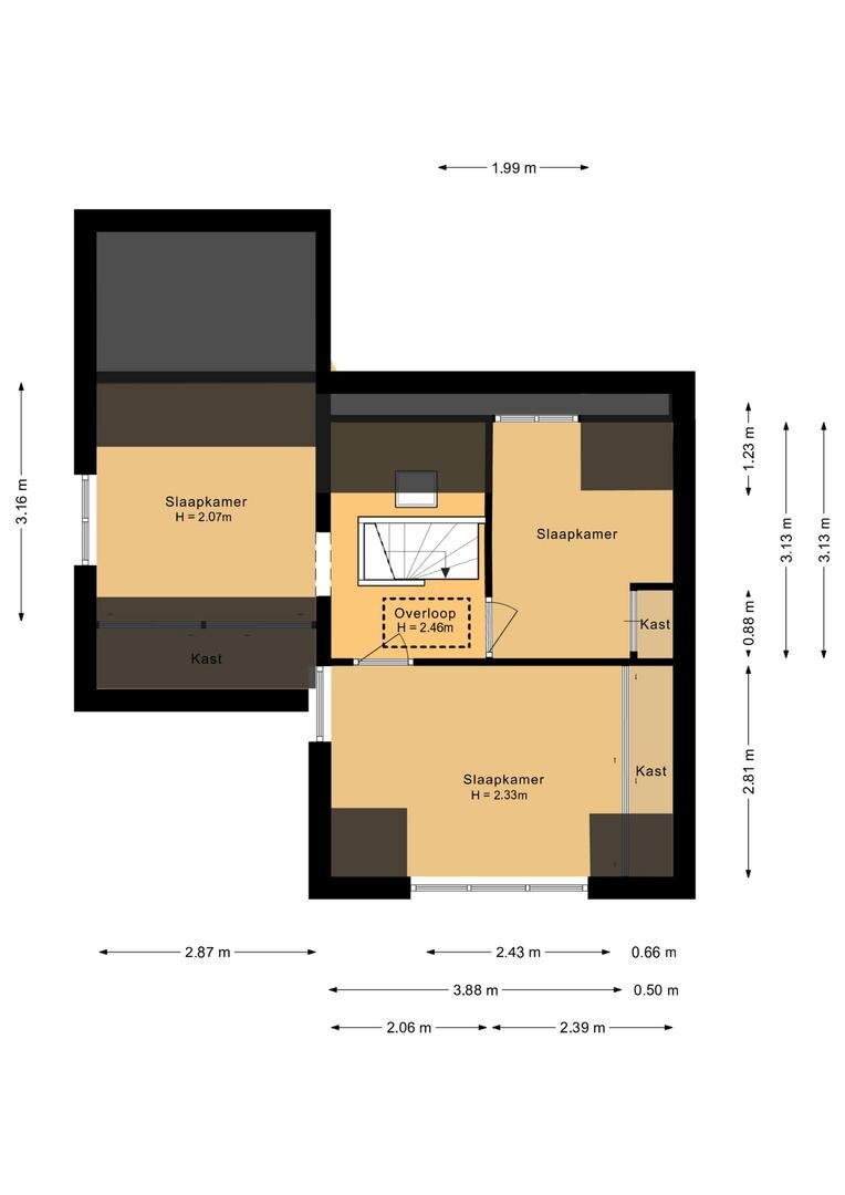Eerste verdieping: de woning heeft een overloop die toegang biedt tot drie slaapkamers: één slaapkamer met een dakkapel en een vaste kast, een tweede slaapkamer met een dakkapel en een volledige vaste kastenwand, en een derde slaapkamer die is voorzien van knieschotten.