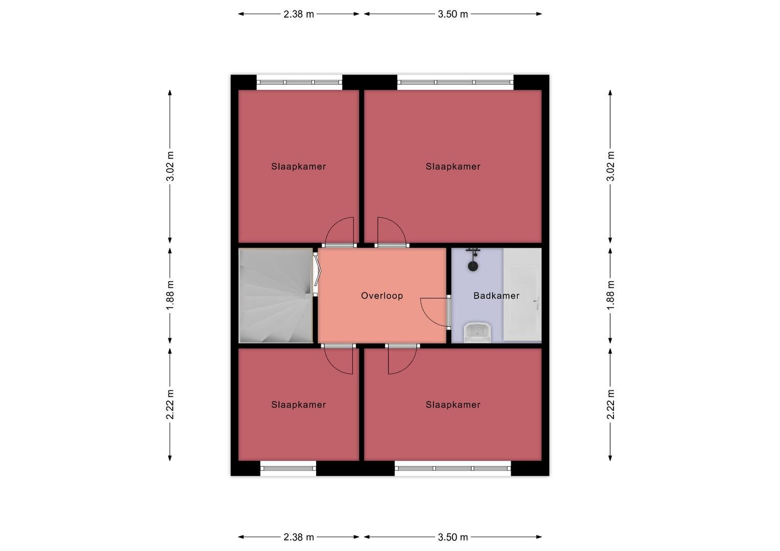 Eerste verdieping: op de overloop zijn 4 prima slaapkamers en de badkamer te bereiken, die is voorzien van een douchehoek, een wastafel en een ligbad. De eerste verdieping kent een praktische en functionele indeling. Vanwege deze indeling en de aanwezigheid van 4 slaapkamers biedt de verdieping bovendien de mogelijkheid om een grote badkamer te realiseren én een vaste trap vanaf de overloop naar zolder aan te brengen.