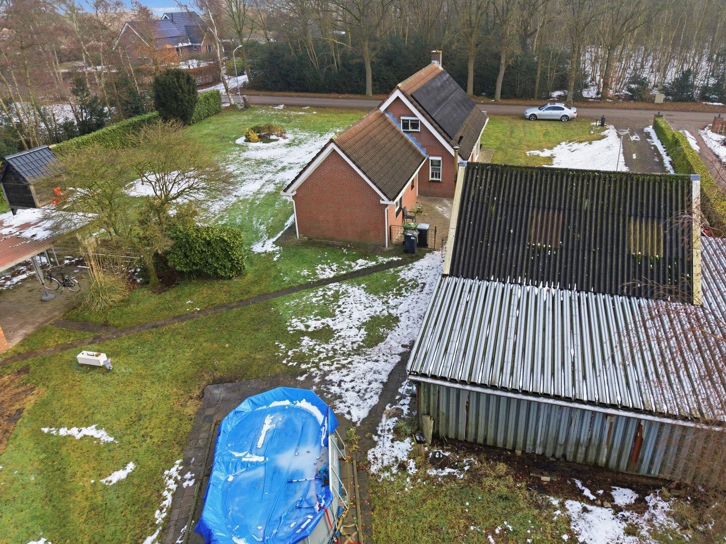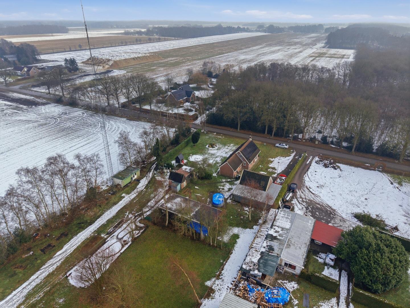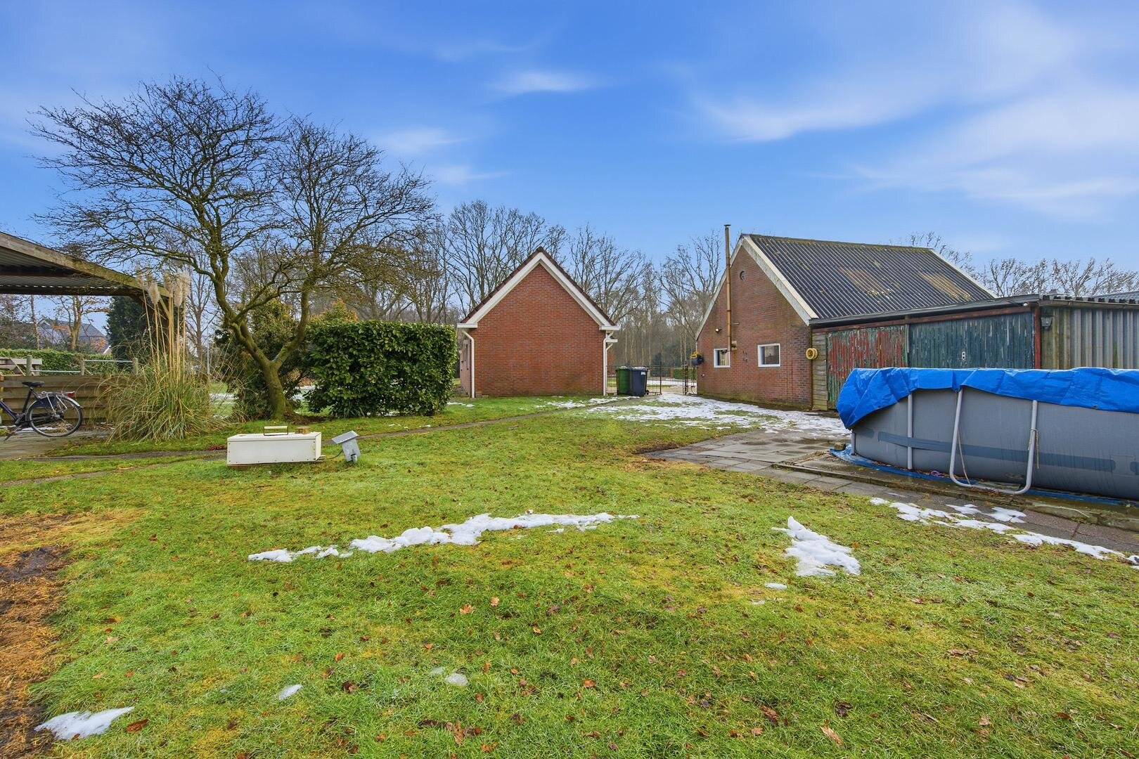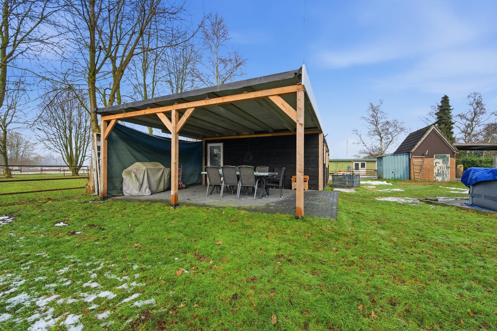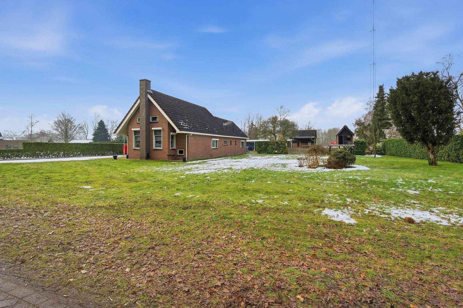 Tuin en bijgebouwen: aan de voorzijde van de woning bevindt zich een prachtig bos, de tuin, die geheel om de woning heen ligt, gaat naadloos over in het weidse landschap, waardoor je het gevoel hebt midden in de natuur te wonen met alle ruimte om je heen. Rondom de woning is er volop mogelijkheid voor opslag en stalling. Zo staat er een royale overkapping, ideaal voor het beschermen van voertuigen of landbouwwerktuigen. Daarnaast is er een ruime, geïsoleerde metalen schuur aanwezig, die zich uitstekend leent voor een werkplaats of vorstvrije opslag. Een kleine stenen schuur met een karakteristiek dakje completeert het geheel en is perfect voor het opbergen van tuingereedschap of brandhout.