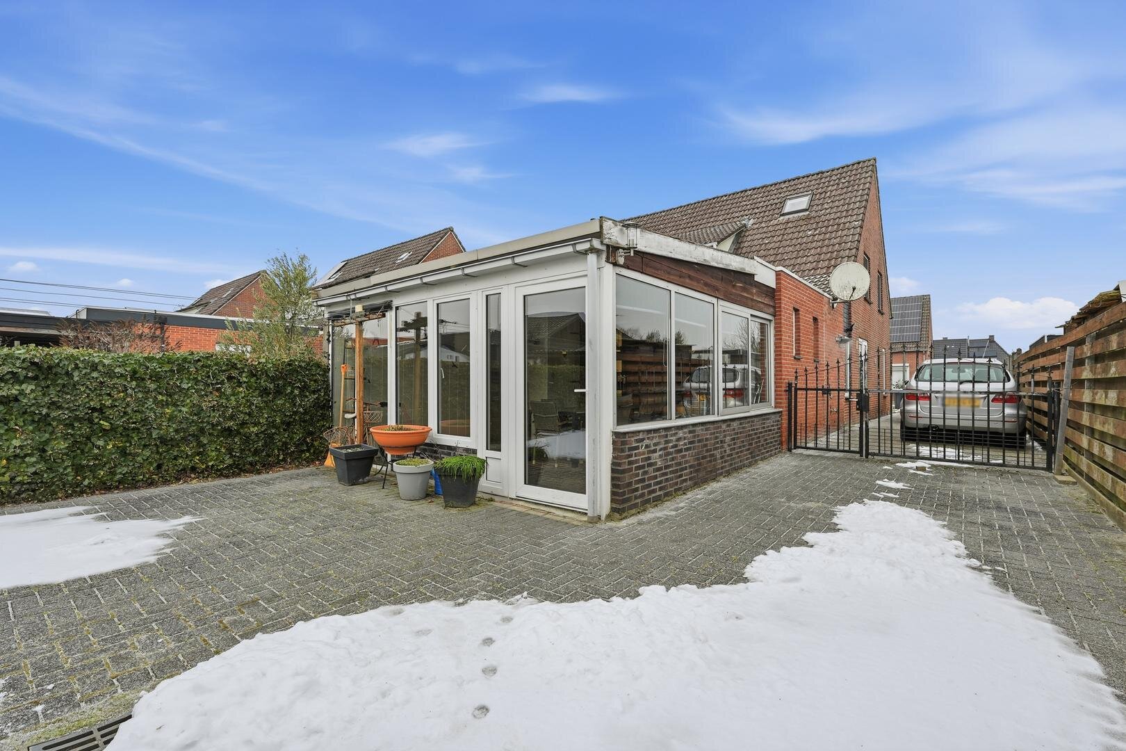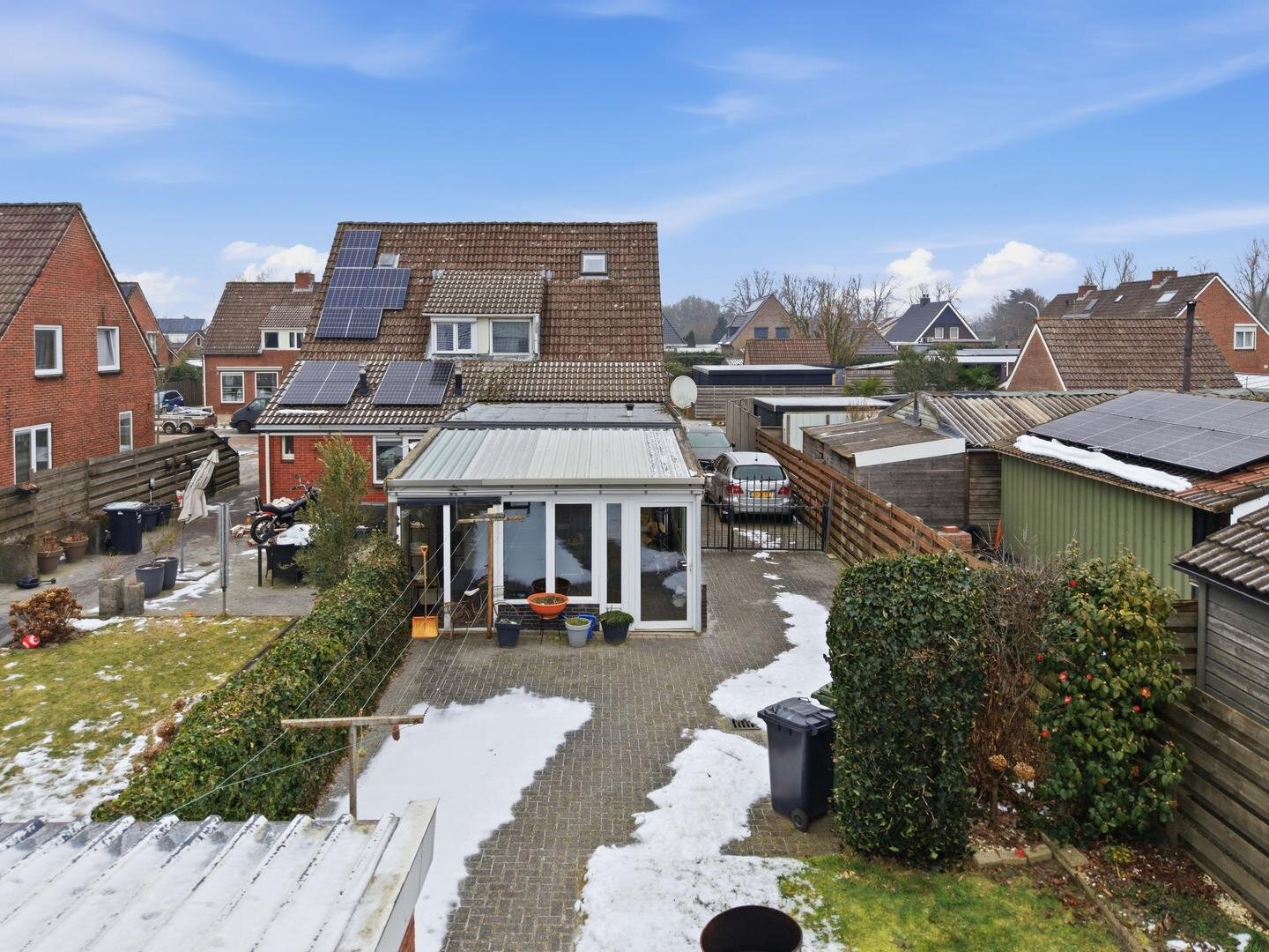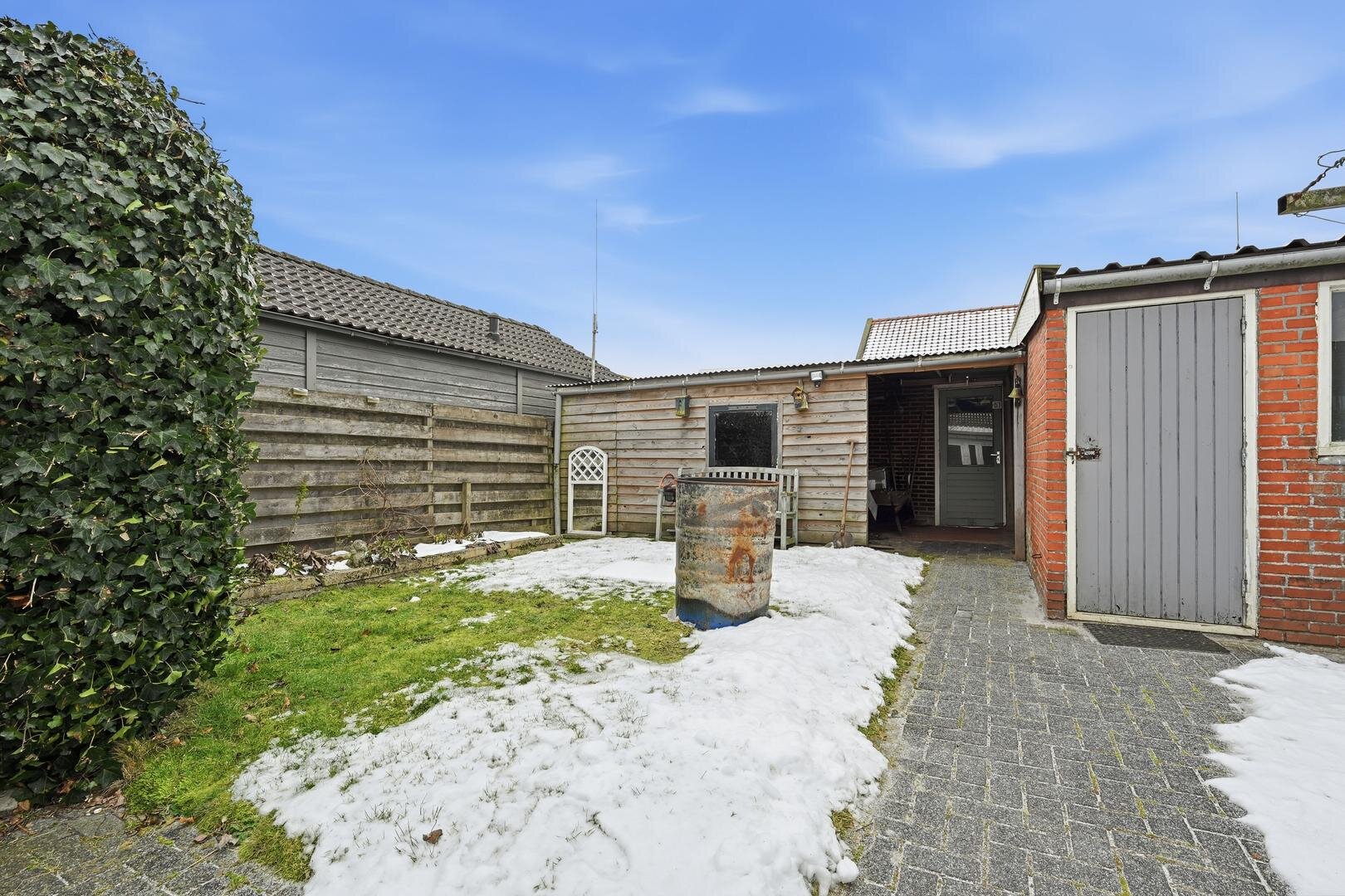 Tuin en bijgebouwen: vanaf de lange oprit bereikt u de ruim opgezette achtertuin, die op het zuiden is gelegen en is voorzien van sierbestrating met een fraai gazon. Direct aan het huis bevindt zich een overdekte tuinkamer van kunststof van ca. 25m², terwijl verder in de tuin zowel een stenen berging met elektra als een houten schuur staan.
