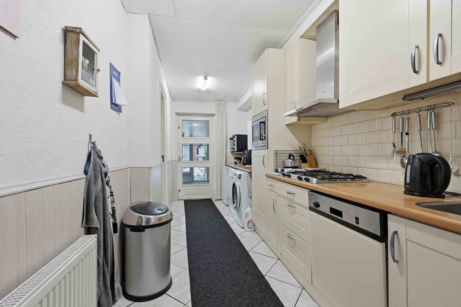 Begane grond: bij binnenkomst in de hal komt u direct in het centrale punt van de woning. Vanuit de hal is de meterkast bereikbaar en heeft u toegang tot de woonkamer. De woonkamer is straatgericht met prima lichtinval en is zeer ruim te noemen, via een open doorgang is de aanbouw te bereiken. In deze aanbouw bevindt zich de dichte keuken, die is ingericht met een functionele inbouwkeuken en apparatuur; koelkast, vaatwasser, gaskookplaat, afzuigkap en combimagnetron. Ook zijn hier de witgoedaansluitingen gerealiseerd. Vanuit de tussenhal bereikt u daarnaast een aparte cv-berging met vaste kast en een separaat toilet. De badkamer is voorzien van een wastafel met bijpassend meubel en een ruime douchehoek.