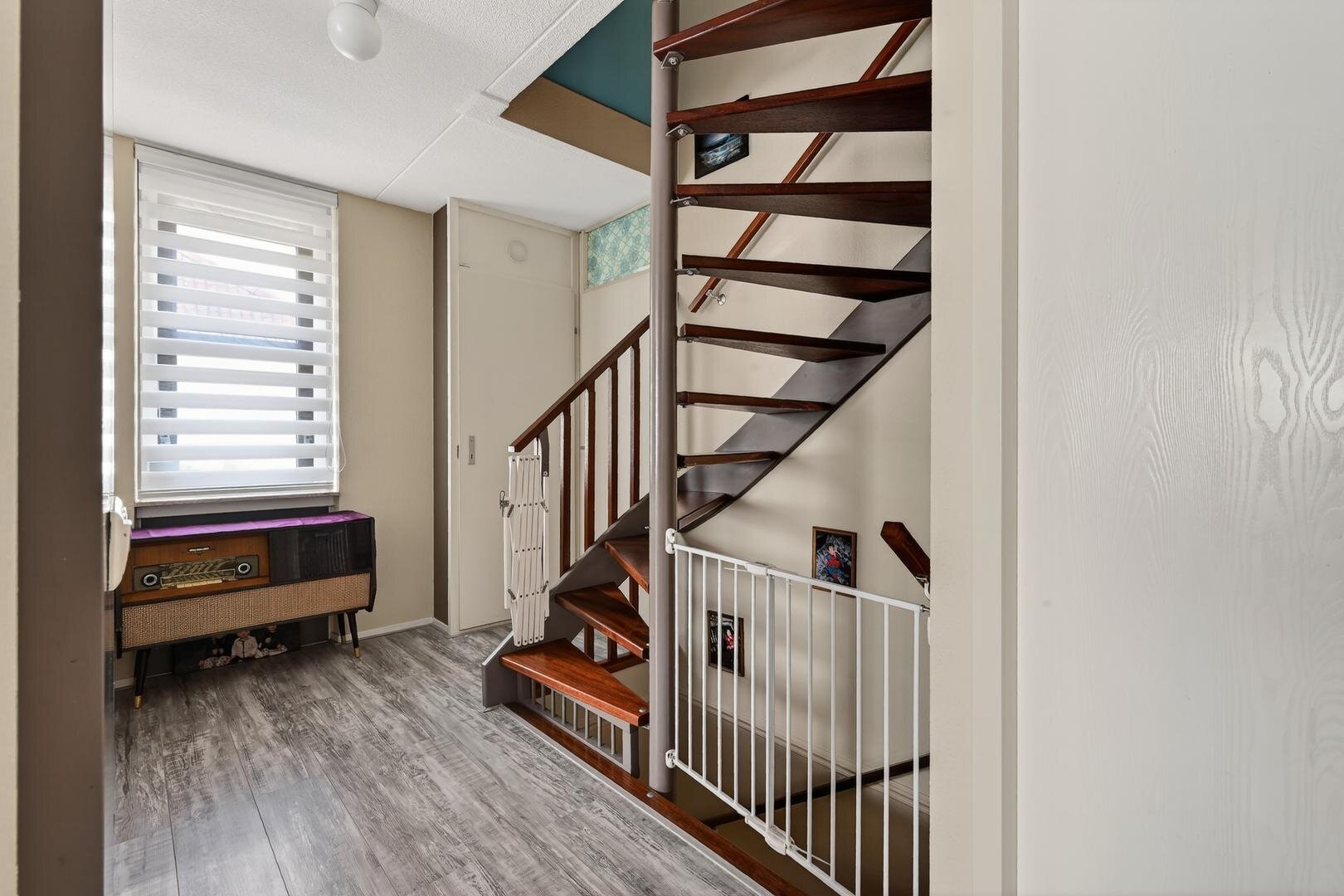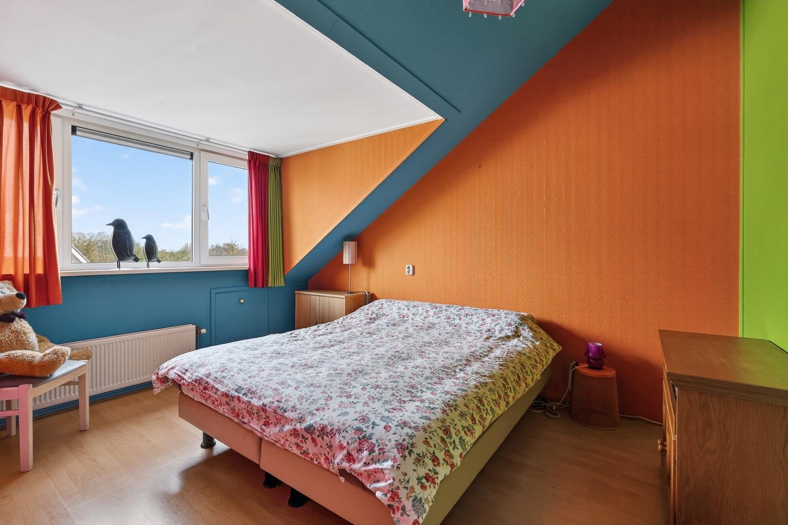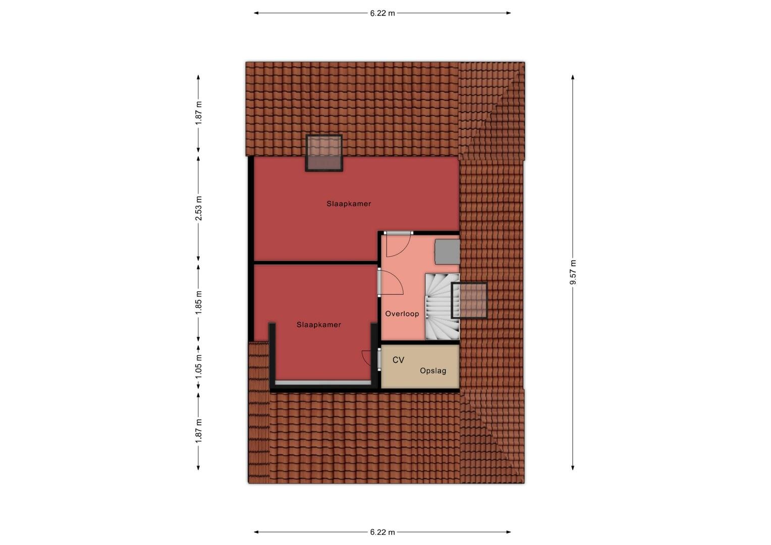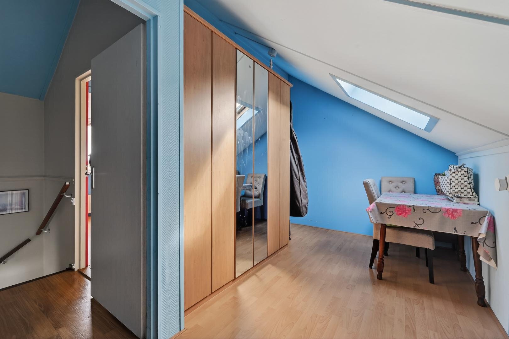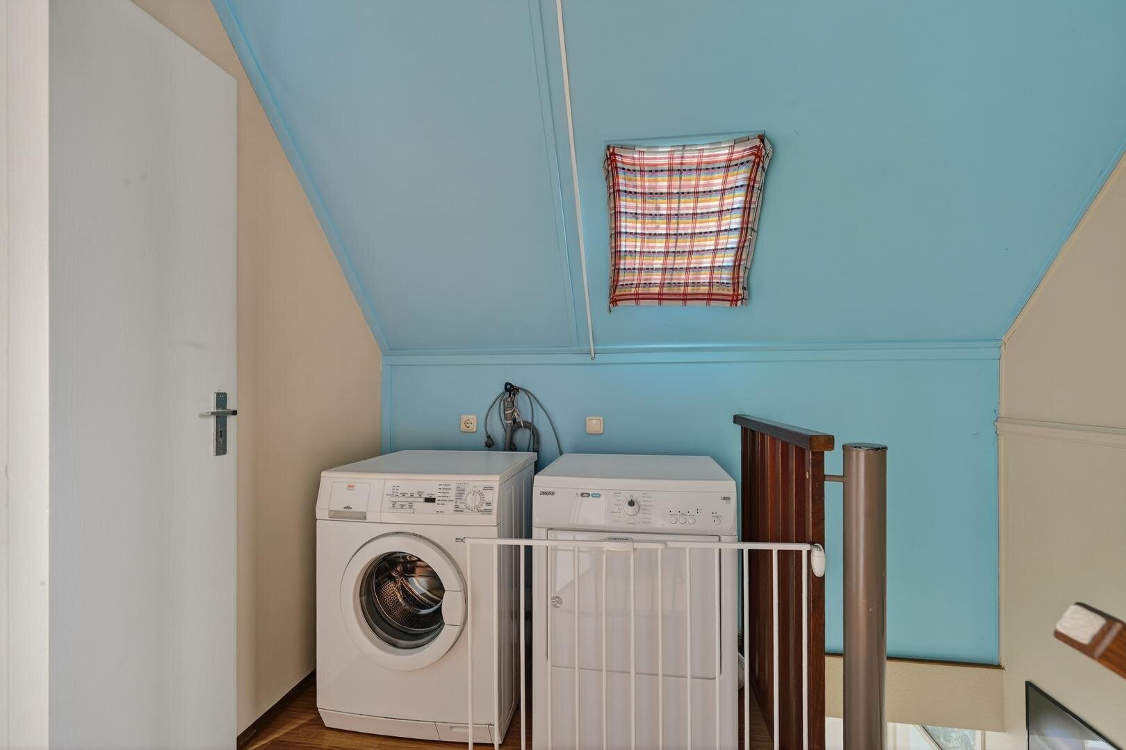 Tweede verdieping: een vaste trap leidt naar de overloop, waar tevens de witgoedaansluitingen zijn gesitueerd. Vanaf de overloop zijn nog eens twee slaapkamers bereikbaar: één slaapkamer is voorzien van een dakraam en praktische knieschotten, de andere slaapkamer beschikt over een ruime dakkapel en een aparte cv-berging. Deze indeling biedt optimaal gebruiksgemak en een doordachte benutting van de ruimte onder de kap.