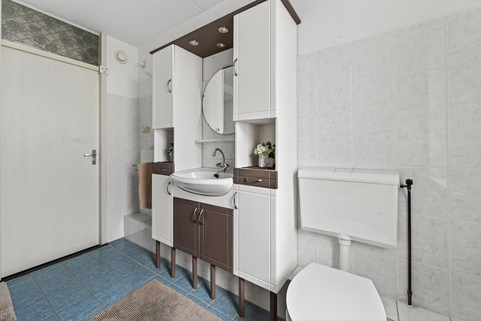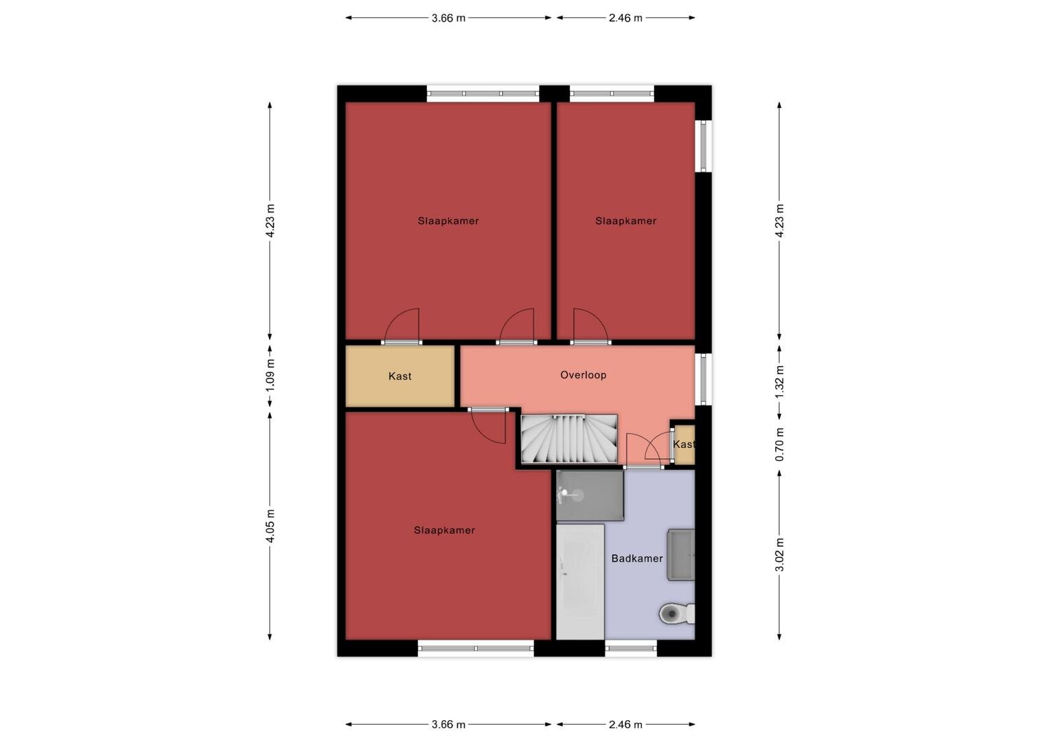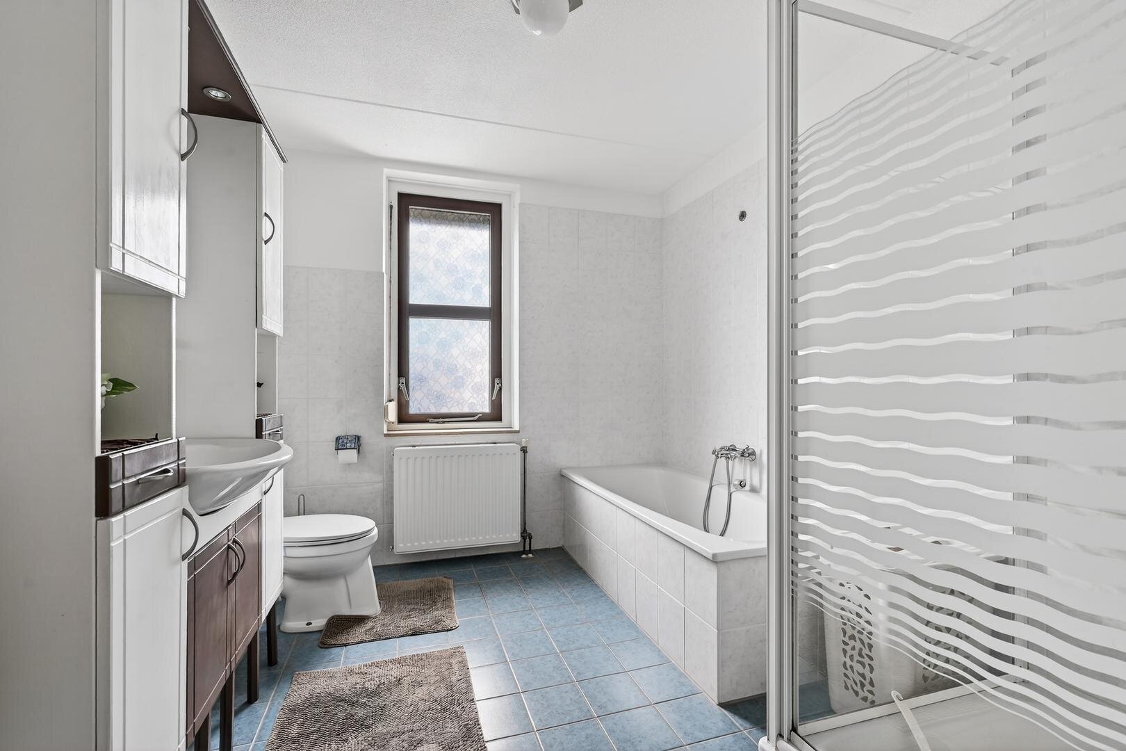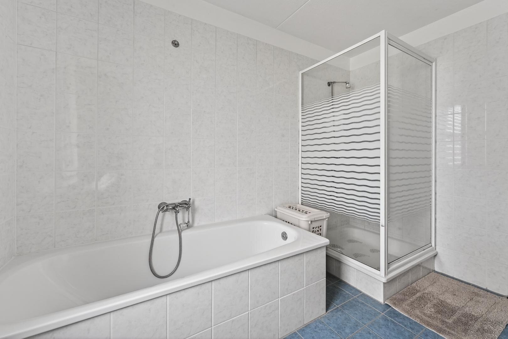 Eerste verdieping: de overloop biedt toegang tot een vaste kast en drie slaapkamers. De functionele badkamer is compleet ingericht met ligbad, een ruime douchecabine, wastafelmeubel en tweede toilet, alles bij elkaar een comfortabele en doordachte indeling die het woongenot op de verdieping compleet maakt.