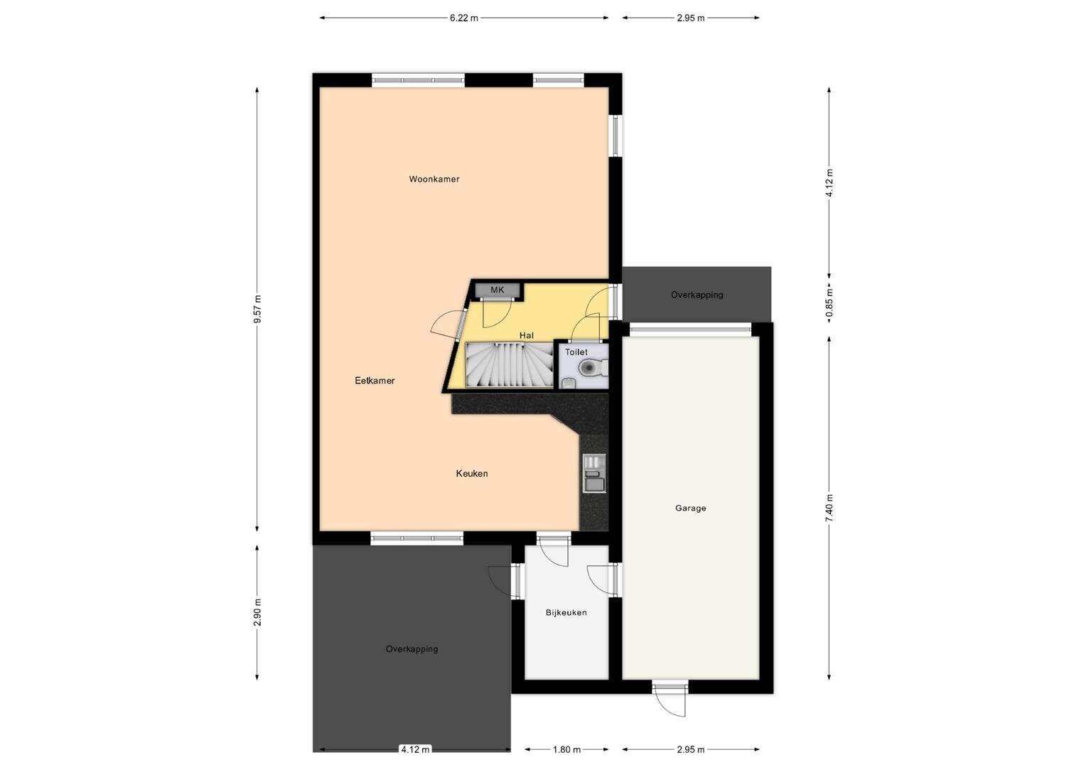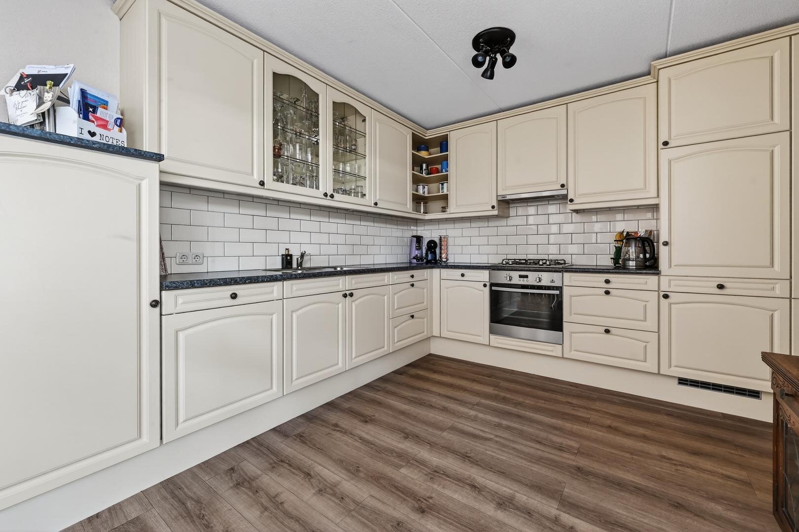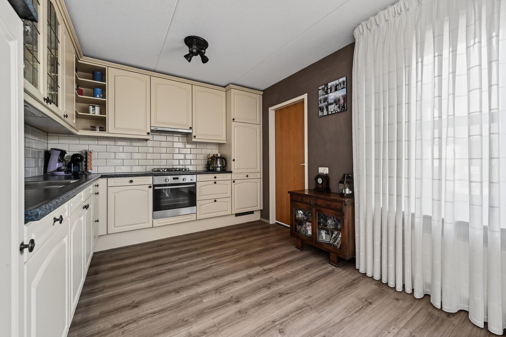 begane grond: de entree vormt de toegang tot de hal, waarin zich de meterkast en een aparte toiletruimte bevinden. Vanuit de hal bereikt u de ruime L-vormige woonkamer, die dankzij de royale raampartijen aan de voorzijde wordt gekenmerkt door een overvloed aan natuurlijk licht. De halfopen keuken sluit naadloos aan op de woonkamer en is voorzien van ingebouwde apparatuur: een koelkast, vaatwasser, 4-pits gaskookplaat, oven en afzuigkap. aansluitend is de handige bijkeuken gelegen, die via een binnendeur directe toegang biedt tot de verlengde garage, een praktische indeling die dagelijks gemak en flexibiliteit combineert.