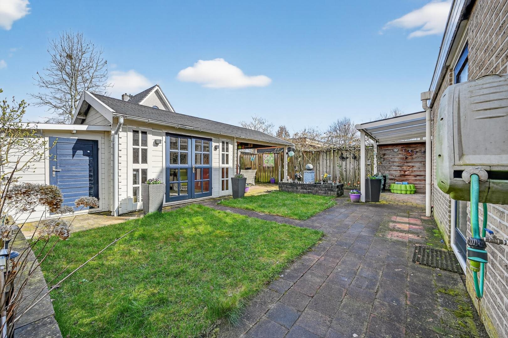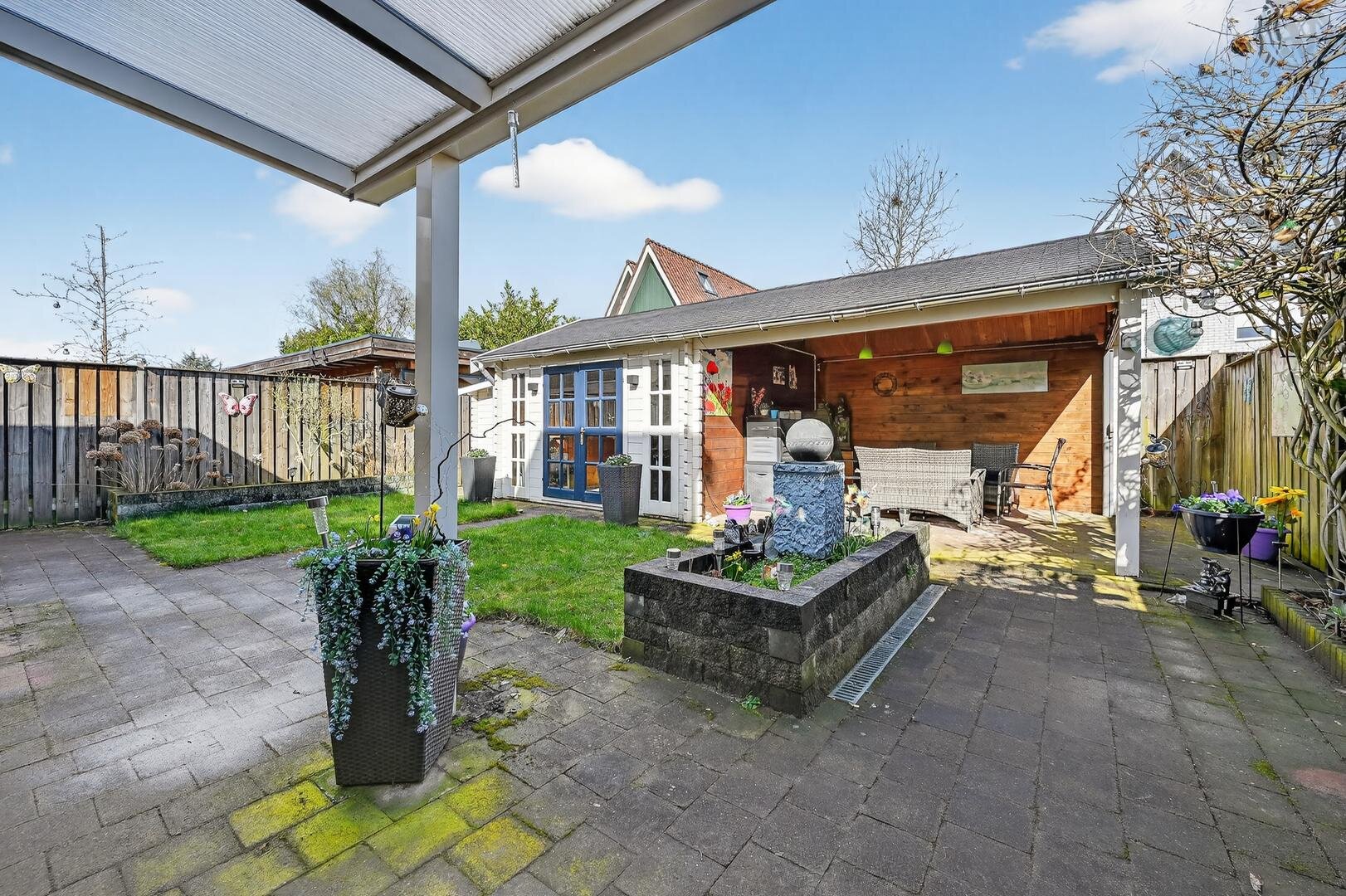 Tuin en bijgebouwen: de achtertuin is gelegen op het noorden, maar kent dankzij de ruimtelijke opzet een prima zonligging. Aan de woning is een aangebouwde stenen garage met elektra en een loopdeur gerealiseerd, evenals een carport. Aan de achterzijde van de woning bevindt zich een aluminium overkapping, terwijl in de tuin een houten vrijstaande blokhut staat, voorzien van een gezellige mancave en een eigen overkapping. Het geheel vormt een sfeervolle tuin om heerlijk in te vertoeven. Via de voorzijde is op ca. 50 meter afstand bovendien natuurschoon en bossingel te bereiken.