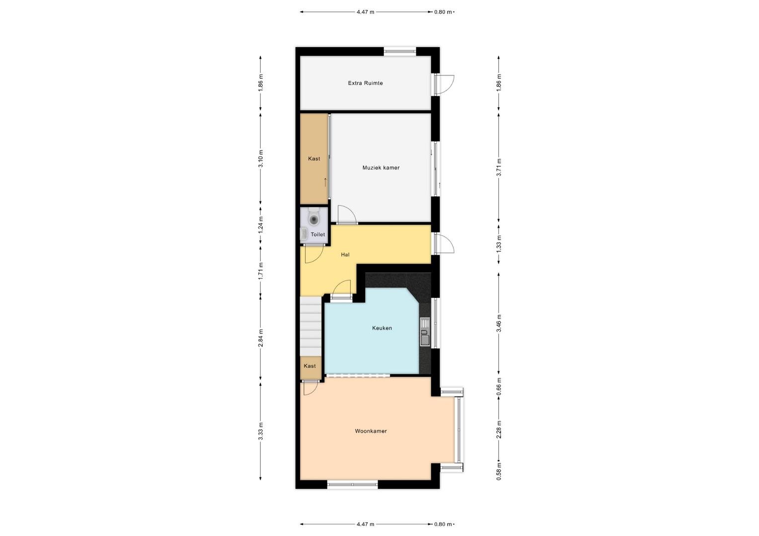 Begane grond: entree/hal, meterkast, toiletruimte (2022) voorzien van wandtoilet en fonteintje, woonkamer voorzien van erker, open keuken (2021) voorzien van keurige inbouwkeuken en apparatuur: koelkast, vaatwasser, inductiekookplaat, afzuigkap en combi oven, provisiekelder, ideaal geschikt voor opslag van boodschappen, slaapkamer of praktijkruimte voorzien van schuifpui, vaste kastenwand, opstelplaats van de CV-ketel en wasmachine aansluiting. De begane grond is netjes afgewerkt, en het geheel is in-stap-klaar te bewonen.