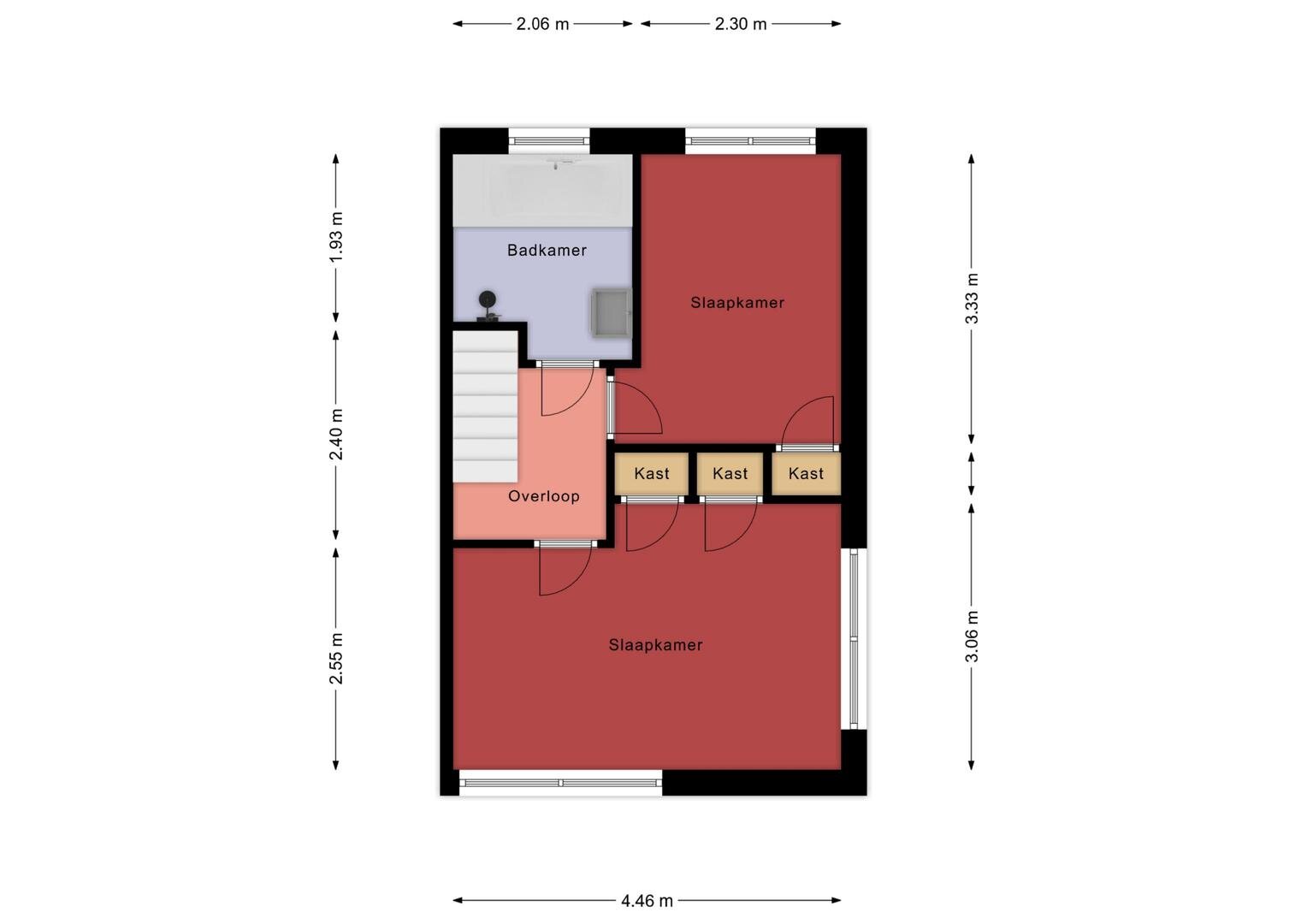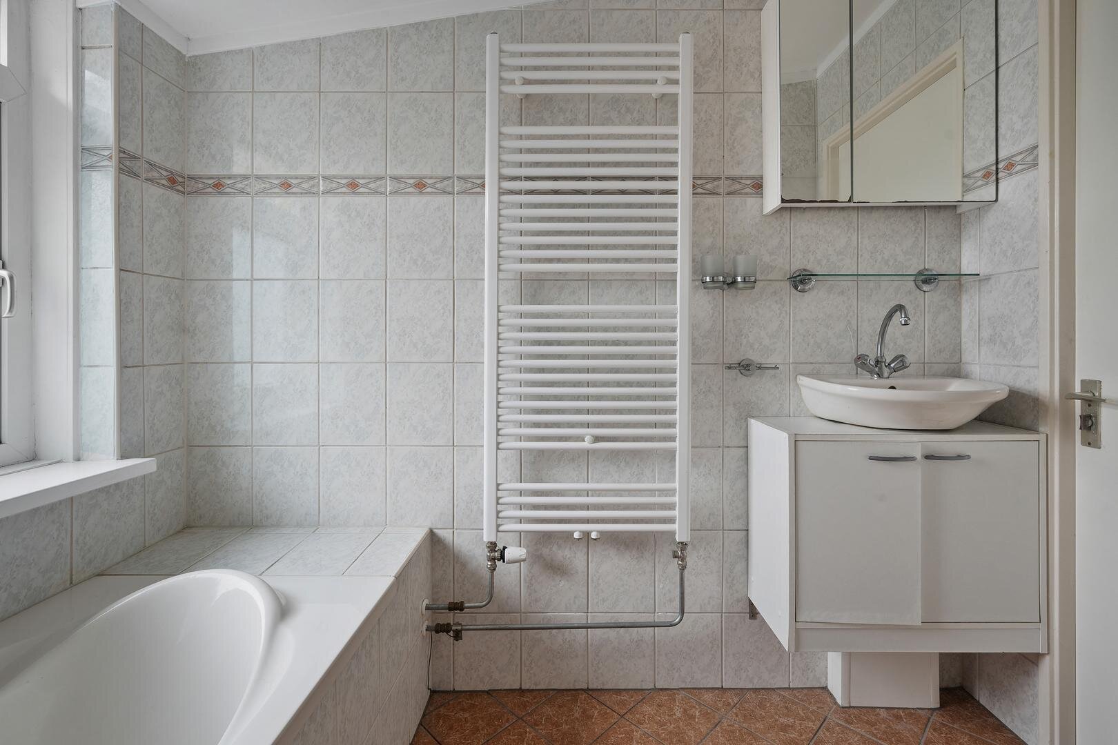 Eerst verdieping: overloop, 2 ruime slaapkamers v.v. vaste kast(en), complete badkamer voorzien van wastafelmeubel, ligbad, douchehoek en designradiator.