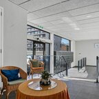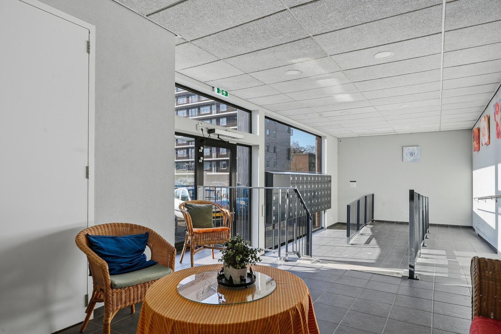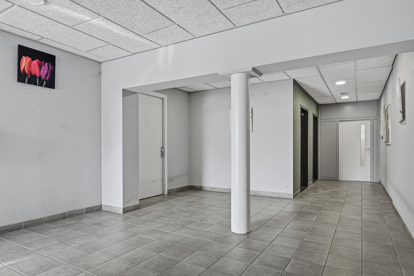 Begane grond: in de ruime, lichte centrale hal van het appartementencomplex bevindt zich de portierintercom voor het ontvangen van bezoek. Vanuit de hal geeft de lift toegang tot alle verdiepingen, en er is tevens een bordestrap aanwezig voor een snelle verbinding naar de appartementen. Tevens is hier de deur naar de gezamenlijke, afsluitbare fietsenberging, waar bewoners hun fietsen veilig en overdekt kunnen stallen. Rondom het complex is voldoende openbare parkeergelegenheid aanwezig, waardoor er altijd een parkeerplek in de directe omgeving beschikbaar is.