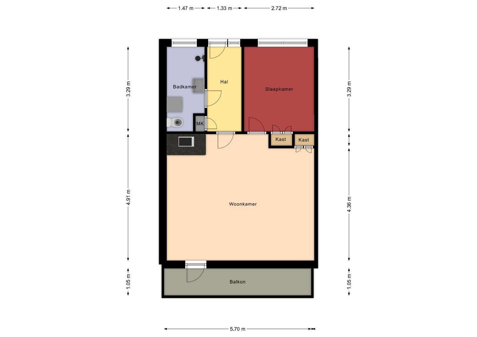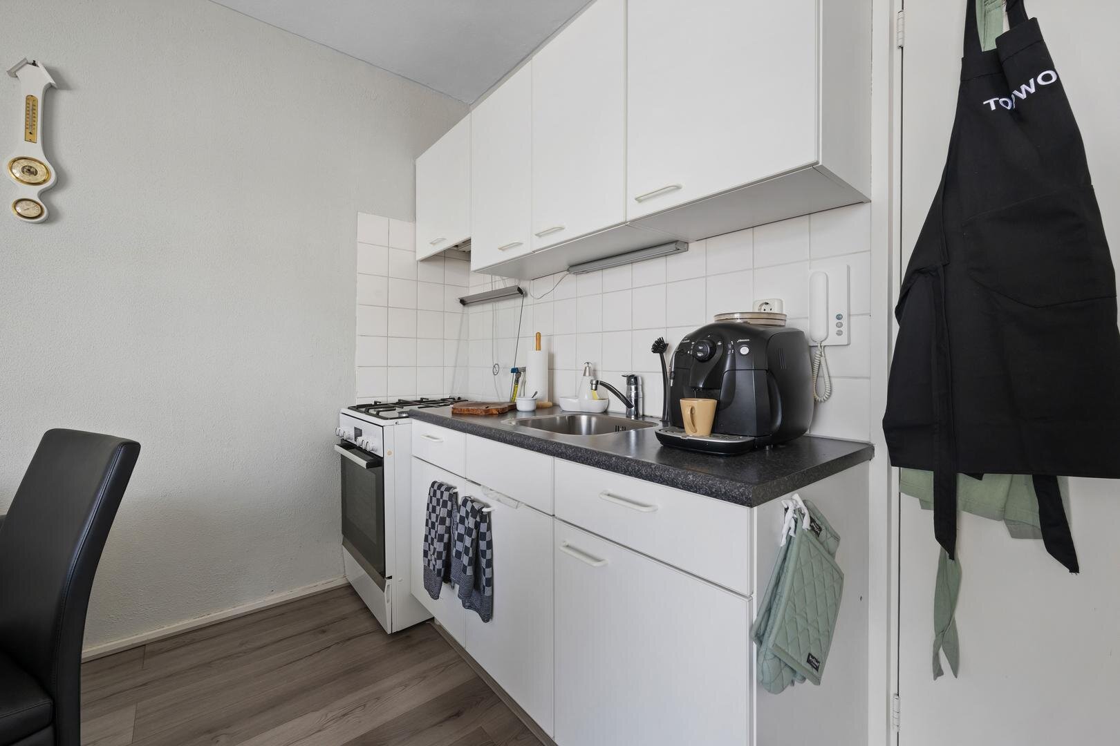 Via entree kom je in de hal voorzien van meterkast, slaapkamer, badkamer voorzien van toilet, douche wastafelmeubel en wasmachine aansluiting, open keuken met keukenblok voorzien een 4-pits gaskookplaat, afzuigkap en oven, en een lichte woonkamer met een deur naar een ruim balkon dat op het zuiden is gelegen met een heerlijk zicht.