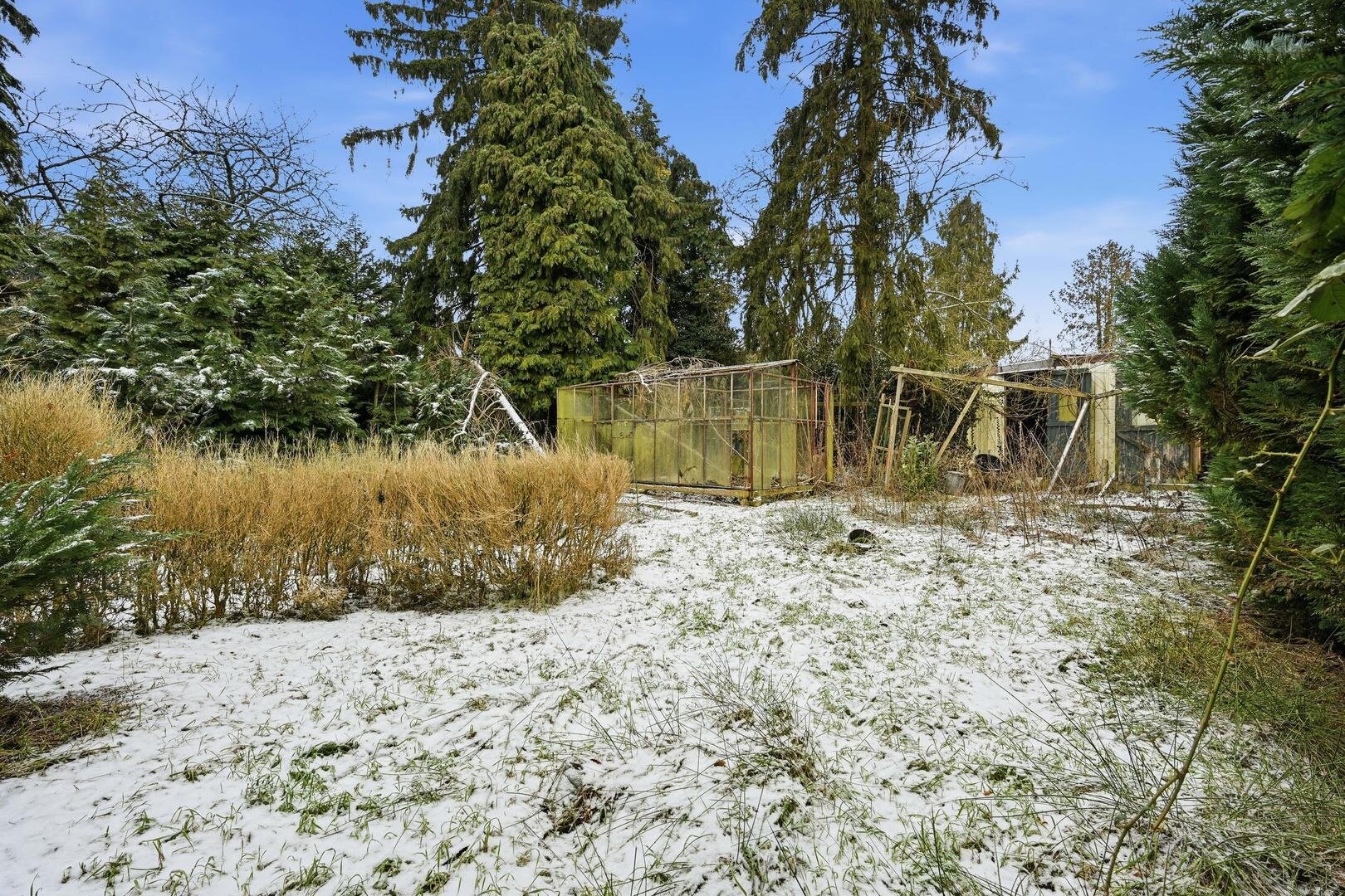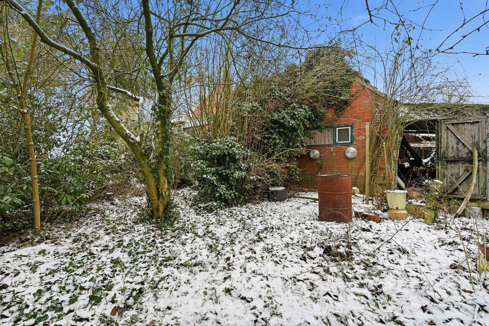 Tuin en bijgebouwen: de voortuin, op het westen gelegen, biedt een geheel vrije en open ligging met weidse uitzichten over de omliggende landerijen, terwijl de diepe achtertuin op het oosten is gesitueerd en enkele kleine, slooprijpe bijgebouwtjes herbergt.