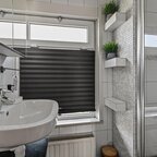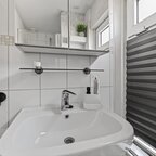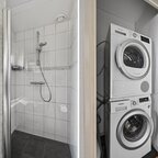 Eerste verdieping: op de overloop bevindt zich een wasmachine bergruimte; verder telt de verdieping drie slaapkamers, waarvan één met een vaste kast, en een moderne badkamer met wastafel en douchecabine.