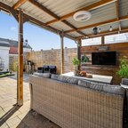 Tuin en bijgebouwen: de voorzijde is netjes bestraat en biedt parkeerruimte, terwijl de achtertuin op het oosten ligt en door de ruime veranda aan het huis een heerlijke plek is om te genieten van de ochtendzon; de tuin zelf is onderhoudsarm, keurig aangelegd en beschikt over een stenen schuur met elektra.