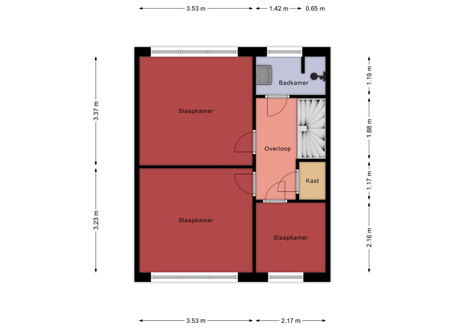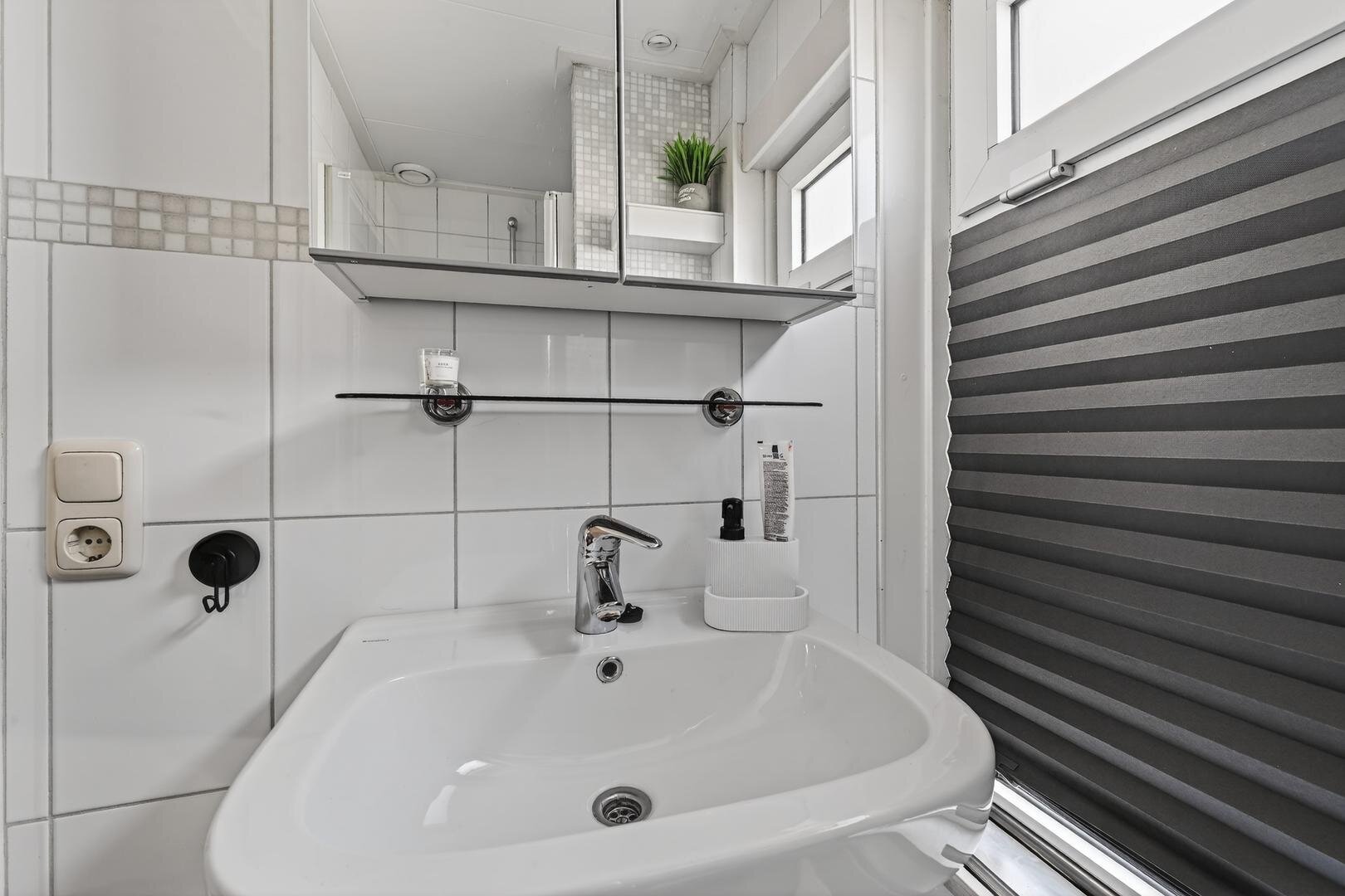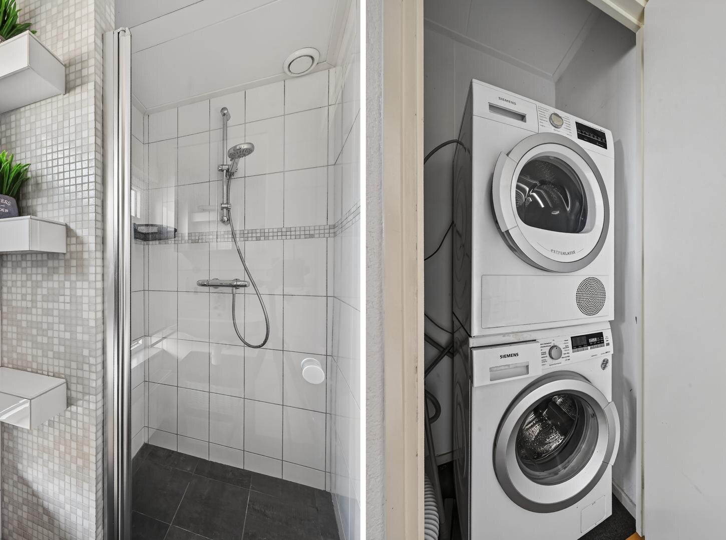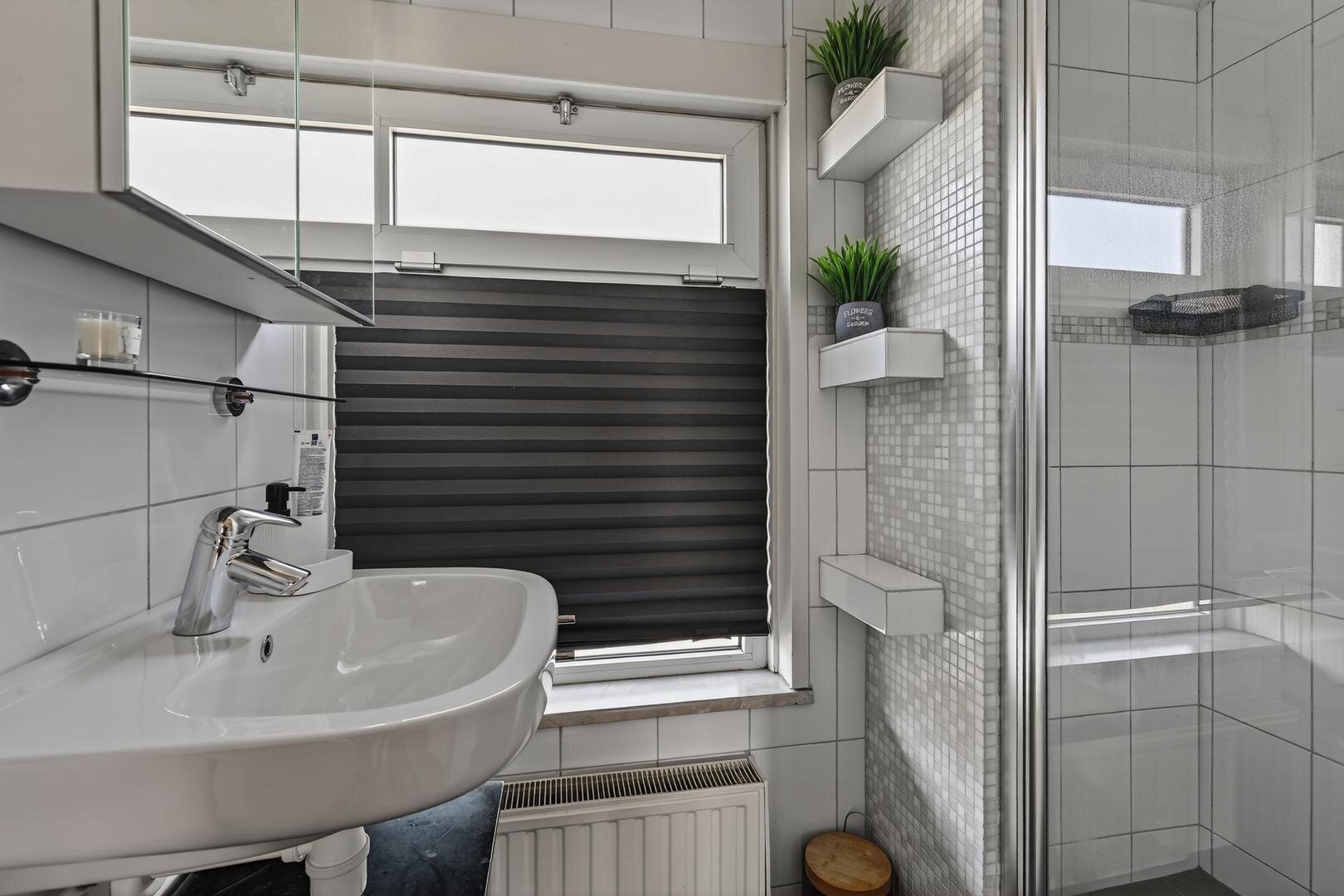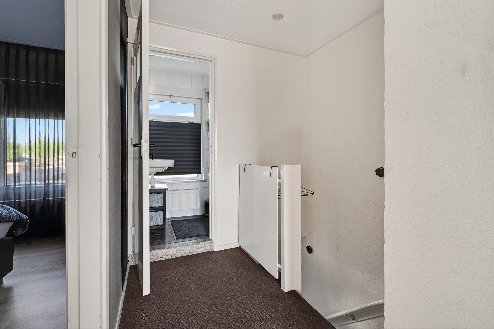 Eerste verdieping: op de overloop bevindt zich een wasmachine bergruimte; verder telt de verdieping drie slaapkamers, waarvan één met een vaste kast, en een moderne badkamer met wastafel en douchecabine.