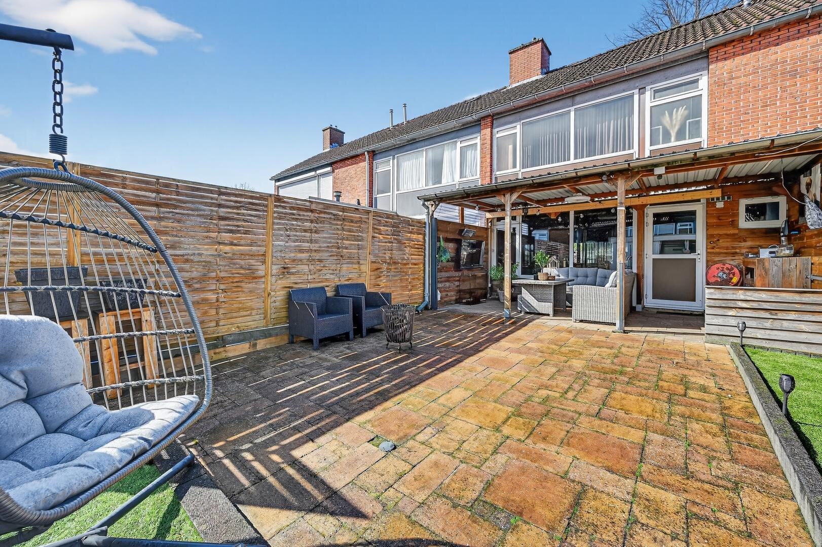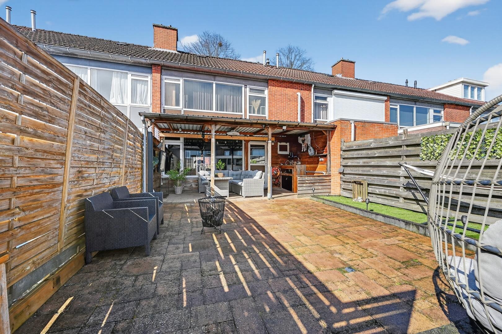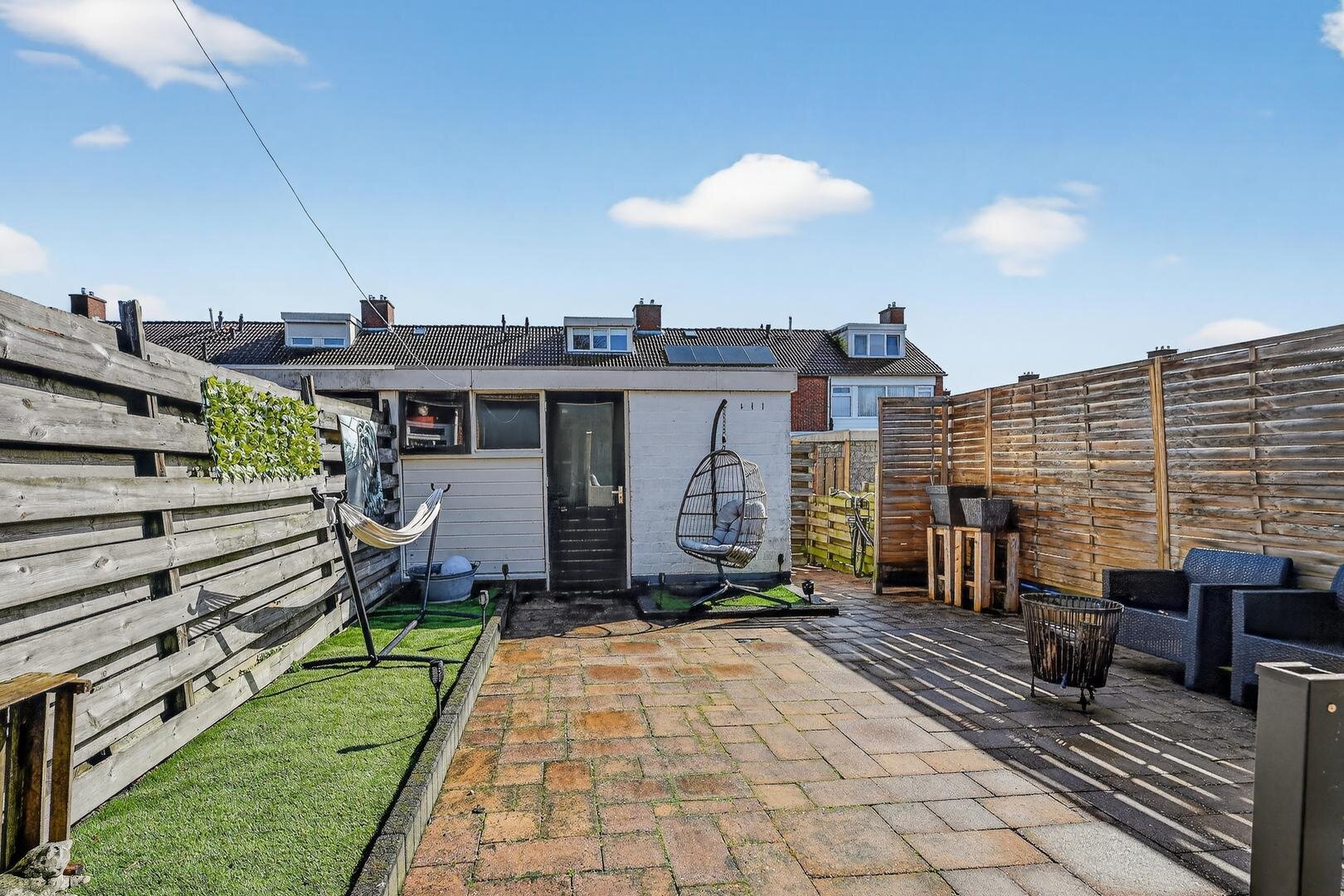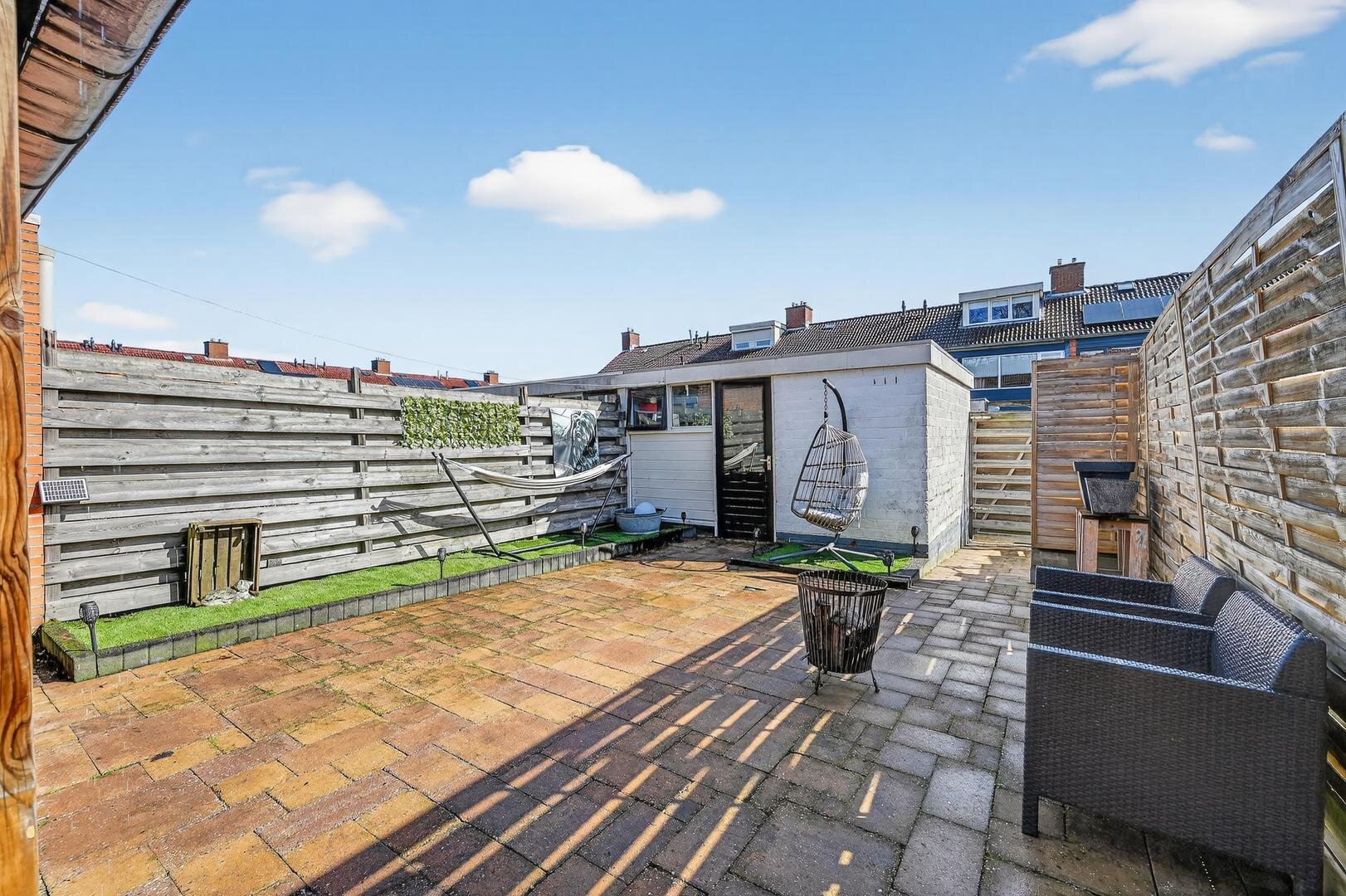Tuin en bijgebouwen: de voorzijde is netjes bestraat en biedt parkeerruimte, terwijl de achtertuin op het oosten ligt en door de ruime veranda aan het huis een heerlijke plek is om te genieten van de ochtendzon; de tuin zelf is onderhoudsarm, keurig aangelegd en beschikt over een stenen schuur met elektra.