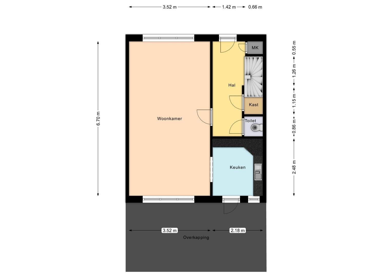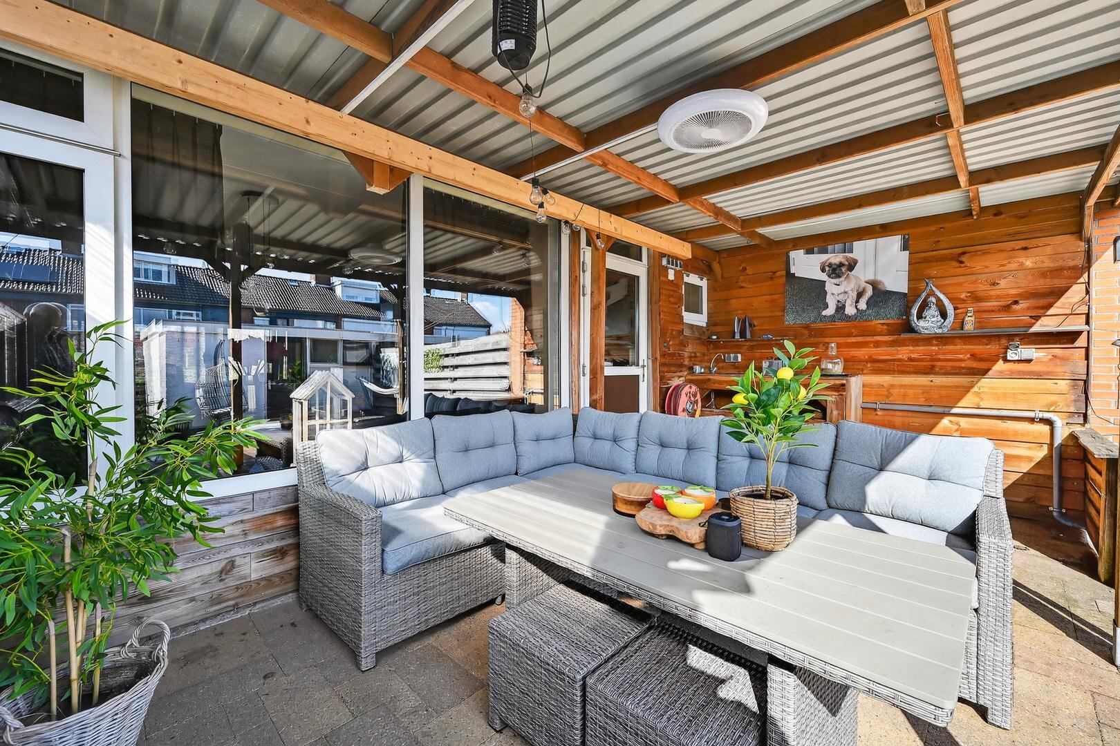 - kunststof kozijnen met dubbele beglazing en gedeeltelijk enkel, kunststof gevelbeplating;