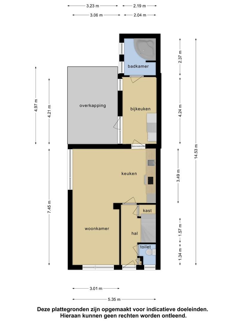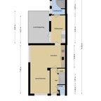 begane grond: hal/entree, toilet, meterkast, provisiekeldertje, L-woonkamer met pelletkachel, open keuken met nieuwe inbouwkeuken en apparatuur, bijkeuken met wasmachineaansluiting en tenslotte naar de nieuwe badkamer.