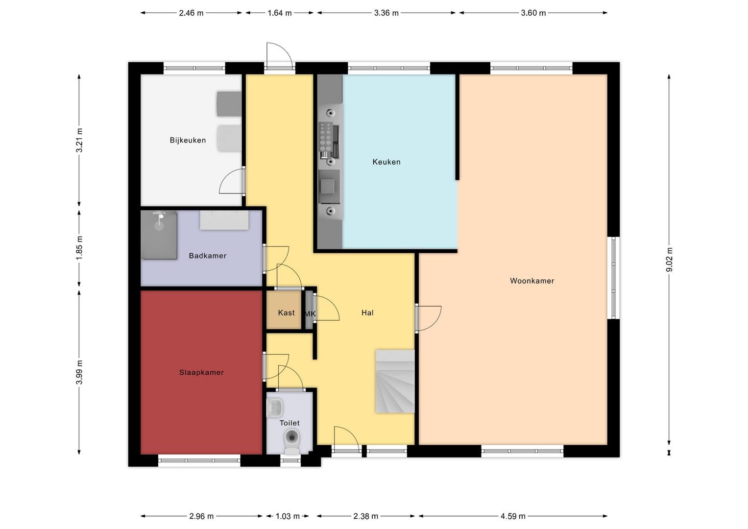 Begane grond: via de entree betreedt u de ruime hal, die direct toegang biedt tot alle vertrekken. Direct links bevindt zich de moderne toiletruimte (2024), voorzien van een wandtoilet en een handig fonteintje. Hiernaast ligt de ruime slaapkamer. Verder in de hal een nisje voor de garderobe, meterkast en een praktische vaste kast. Iets verderop komt u bij de complete badkamer (2024). Deze is voorzien van een dubbele wastafel met spiegel, een ruime douchecabine en een designradiator voor extra comfort en sfeer. Het hart van de woning is de lichte woonkamer, die voorzien is van airconditioning voor een perfect binnenklimaat in elk seizoen. De half open keuken is gezellig met de woonkamer verbonden en is voorzien van een vaatwasser, een gasfornuis met afzuigkap en een dubbele oven, ideaal voor de culinaire liefhebber. Via de hal heeft u toegang tot de bijkeuken, waar de witgoedaansluitingen zich bevinden voor de wasmachine en droger. De begane grond is keurig afgewerkt, modern ingericht en in-stap-klaar te noemen!
