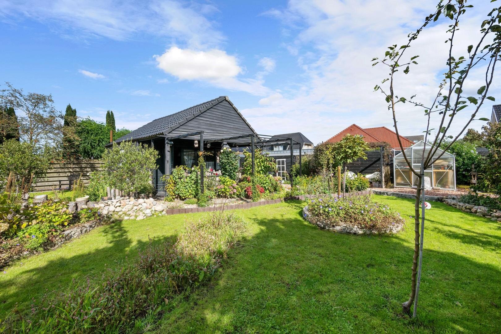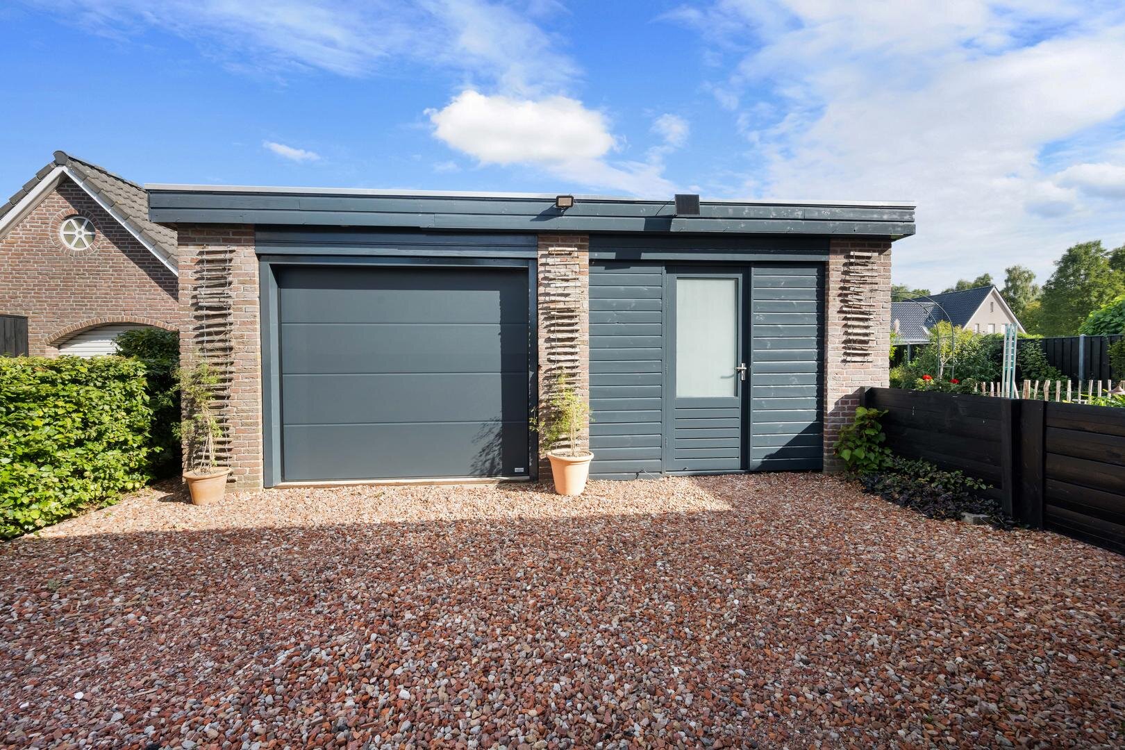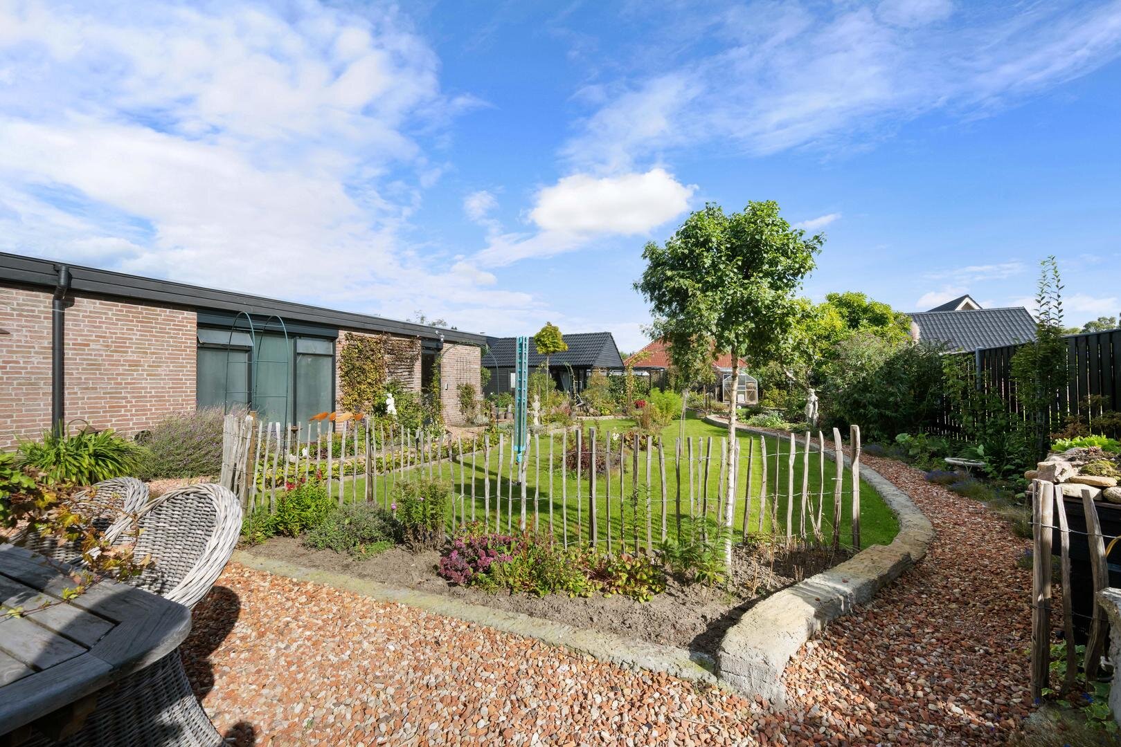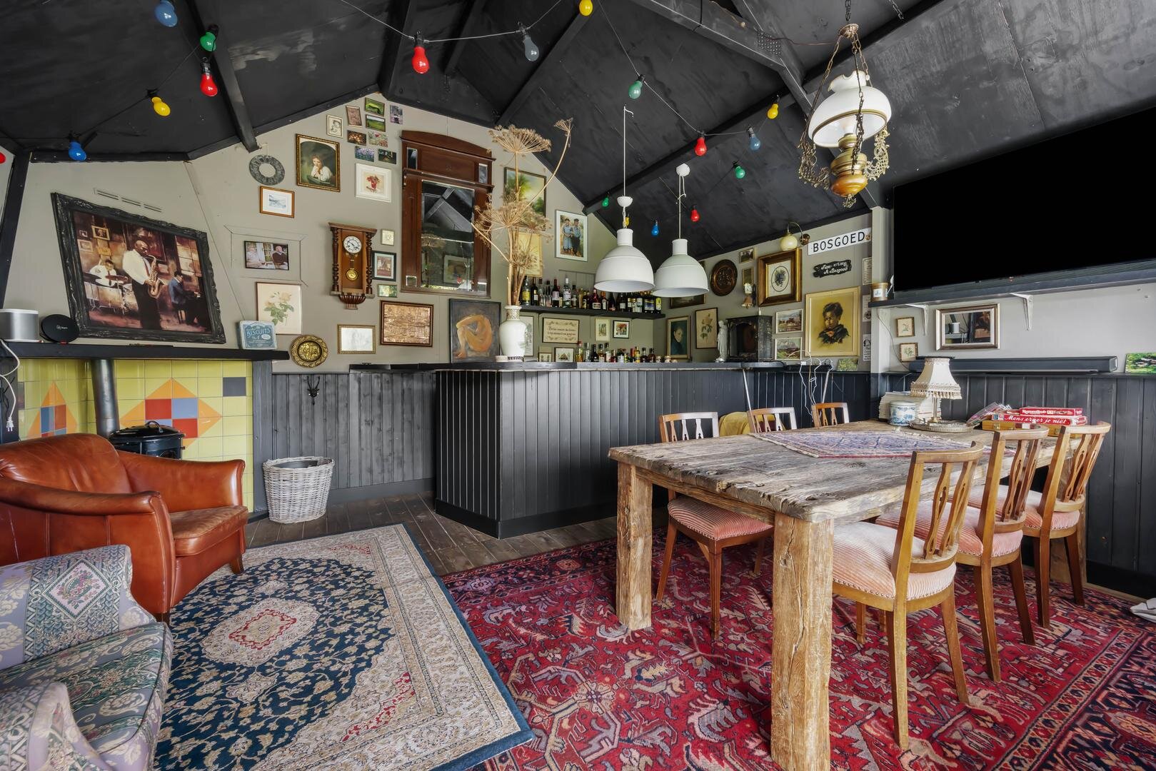 Tuin en bijgebouwen: geniet van een ruime oprit met gazon en een vrijstaande garage voorzien van een betonvloer, nieuwe elektrische deur en een complete hobbyruimte/salon met gasaansluiting en werkplaats; de prachtige, op het oosten gelegen achtertuin is sfeervol aangelegd met nieuwe schuttingen, diverse terrassen, een gazon, bloemborders, een houten Mancave met zoldertje, houtkachel, veranda en tv, en beschikt tevens over een eigen well voor de watervoorziening.