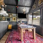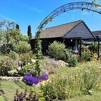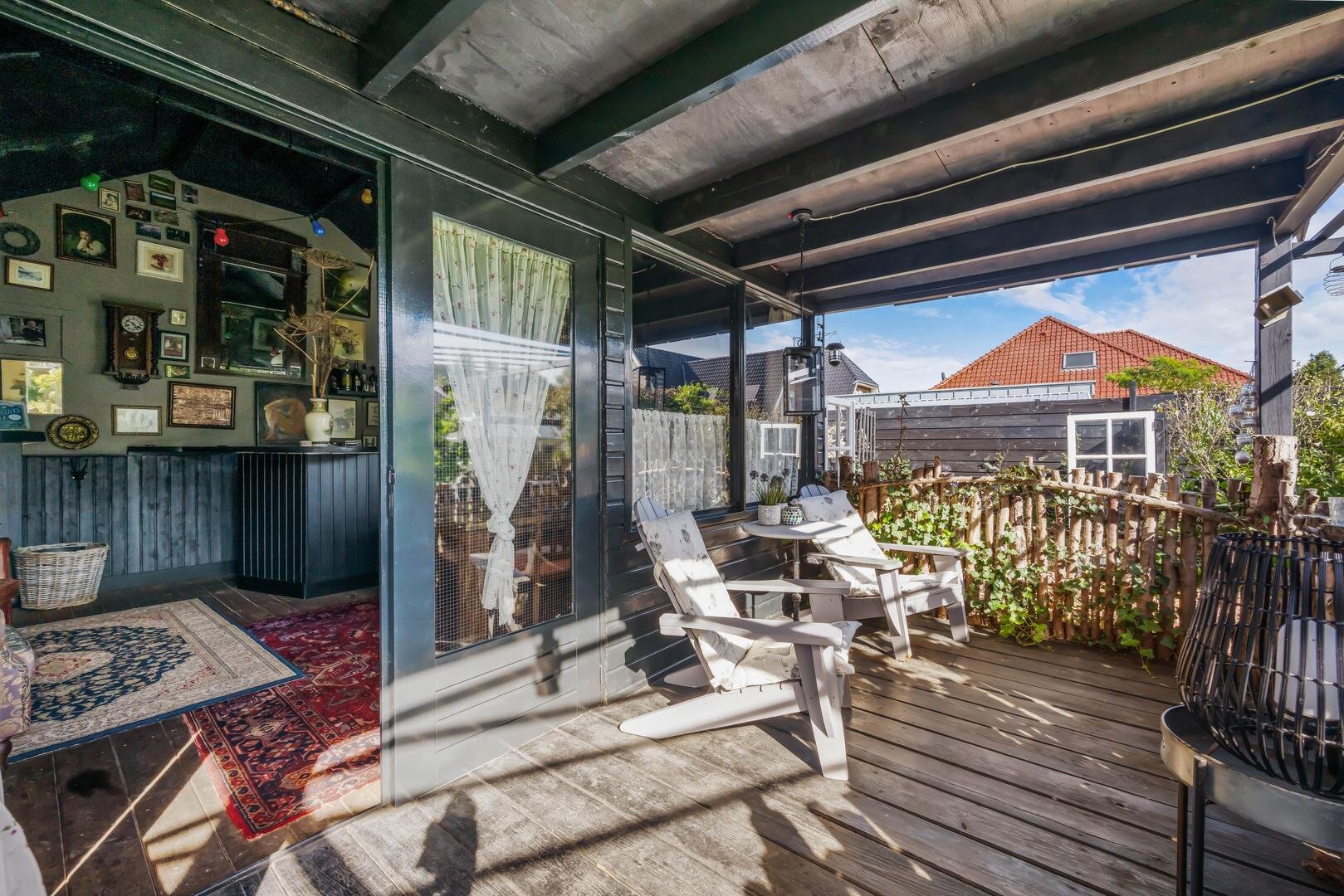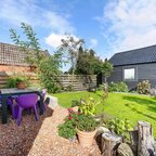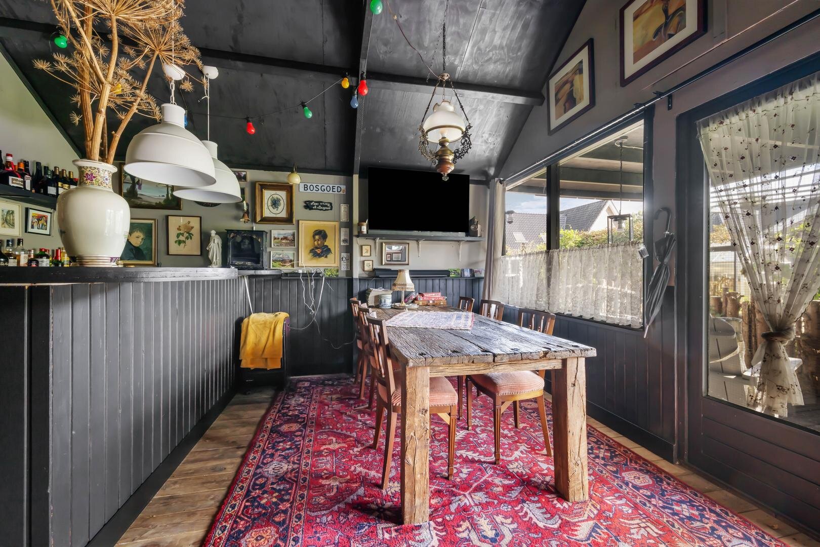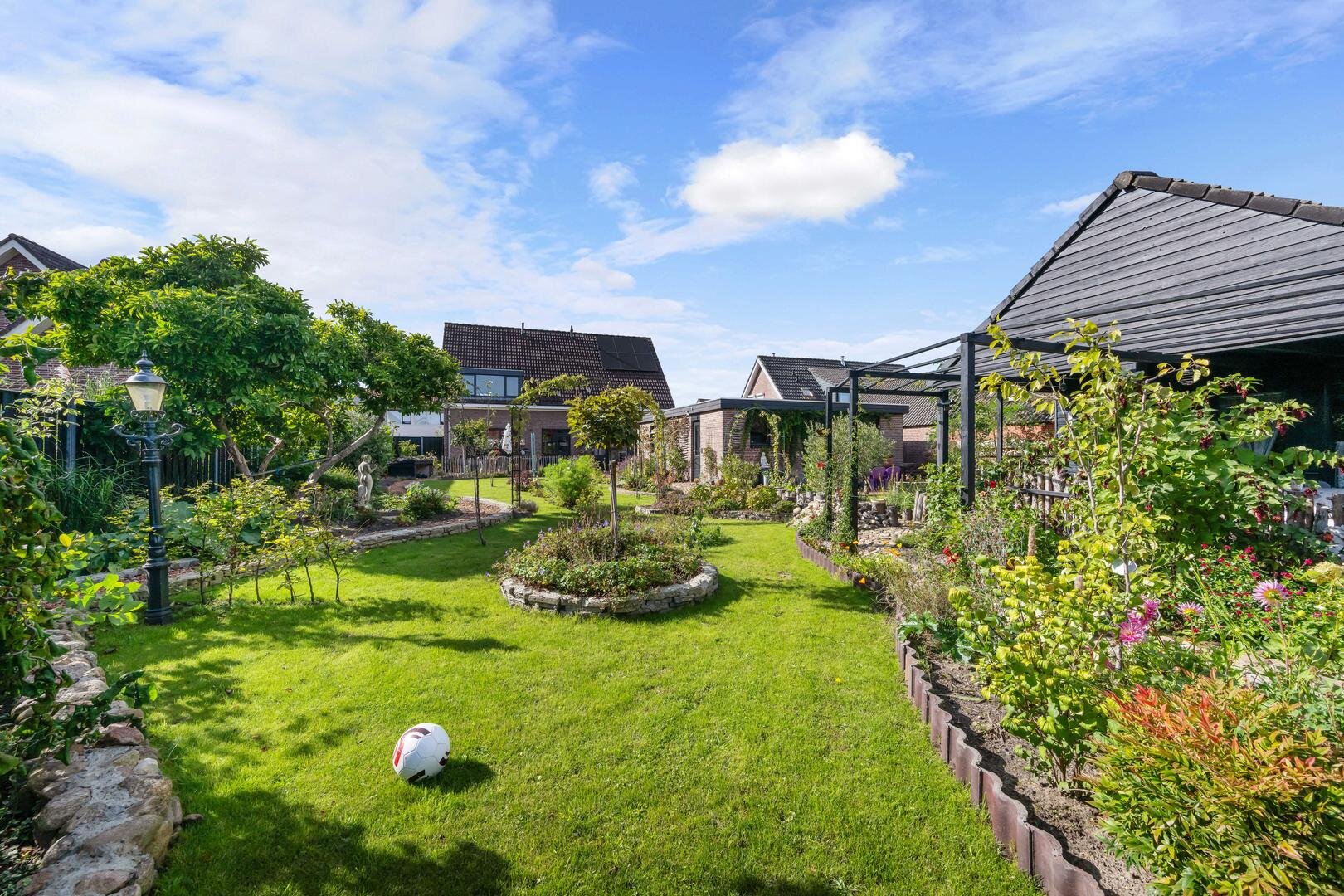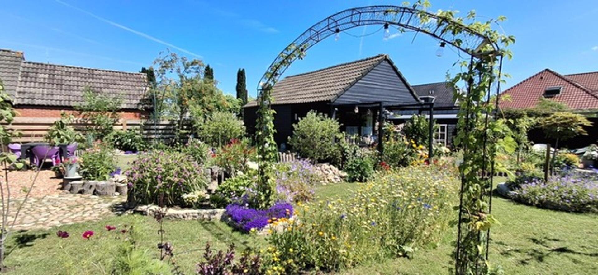 Tuin en bijgebouwen: geniet van een ruime oprit met gazon en een vrijstaande garage voorzien van een betonvloer, nieuwe elektrische deur en een complete hobbyruimte/salon met gasaansluiting en werkplaats; de prachtige, op het oosten gelegen achtertuin is sfeervol aangelegd met nieuwe schuttingen, diverse terrassen, een gazon, bloemborders, een houten Mancave met zoldertje, houtkachel, veranda en tv, en beschikt tevens over een eigen well voor de watervoorziening.