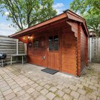 Tuin en bijgebouwen: de tuin, die op het oosten aan de Brinkenweg ligt en beschikt over een achterom, bevat een klein vijvertje en sierborders, en wordt aan de woningzijde begrensd door een aluminium veranda, terwijl in de achtertuin een houten blokhut met elektravoorziening is gesitueerd. Aan de voorzijde is tevens een houten berging/schuur, ideaal voor extra opslag.
