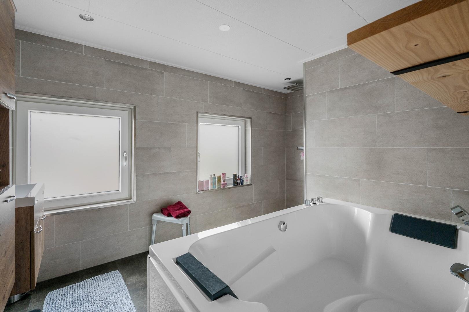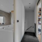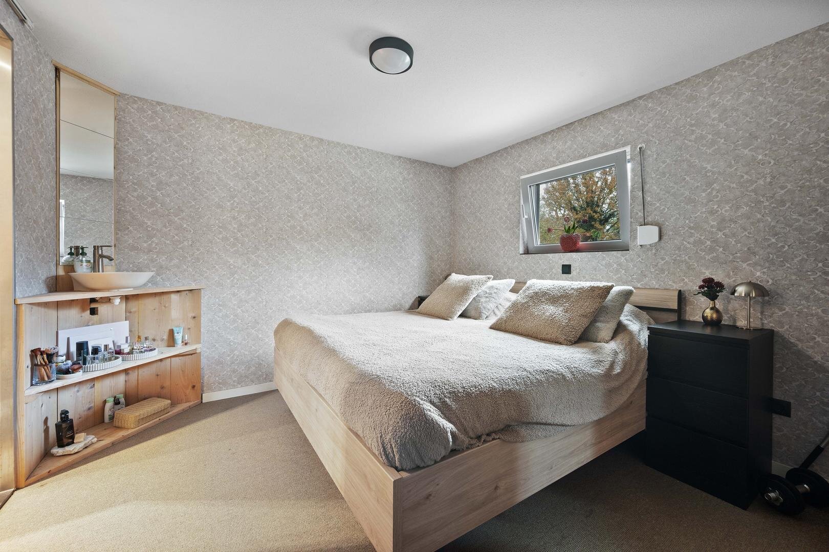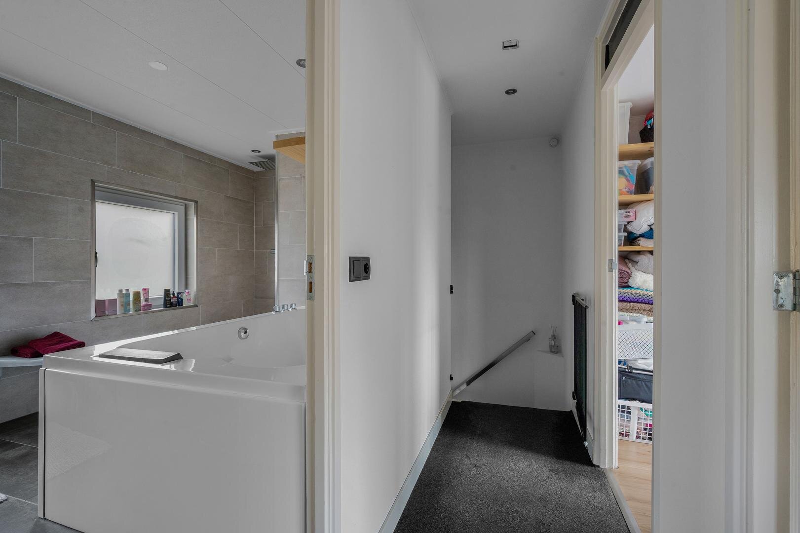 Eerste verdieping: op de overloop vindt u drie ruime slaapkamers, waarvan één voorzien van airconditioning, en één voorzien van een aansluiting voor wasmachine, een ruime, moderne badkamer uit 2020, uitgerust met een groot ligbad voor twee personen, een ruim wastafelmeubel, een aparte douchehoek en een designradiator.