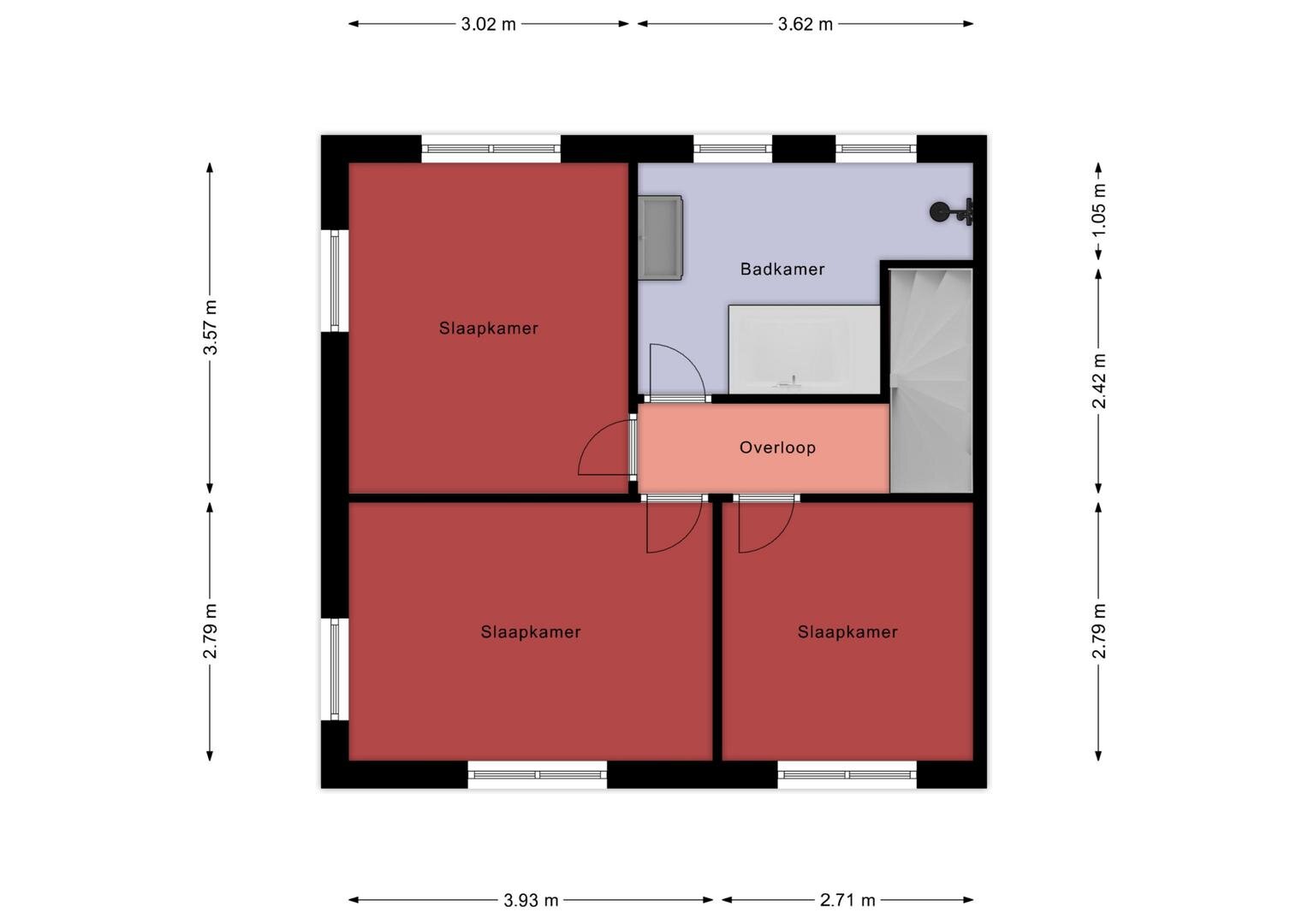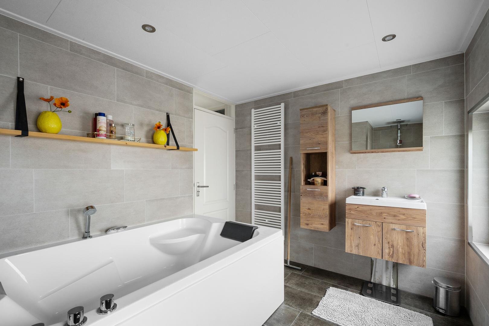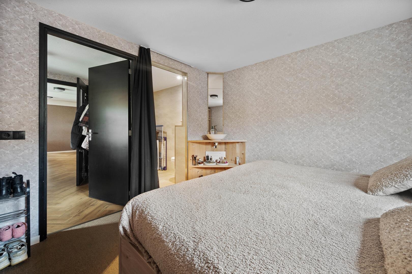 Eerste verdieping: op de overloop vindt u drie ruime slaapkamers, waarvan één voorzien van airconditioning, en één voorzien van een aansluiting voor wasmachine, een ruime, moderne badkamer uit 2020, uitgerust met een groot ligbad voor twee personen, een ruim wastafelmeubel, een aparte douchehoek en een designradiator.
