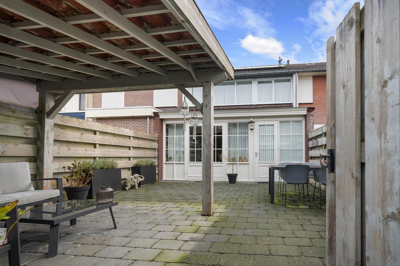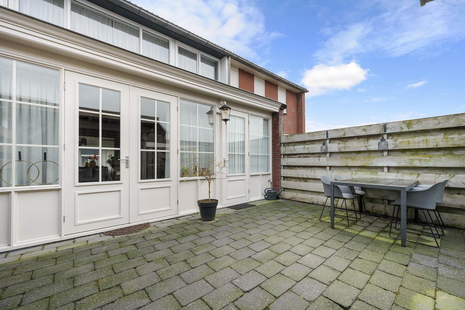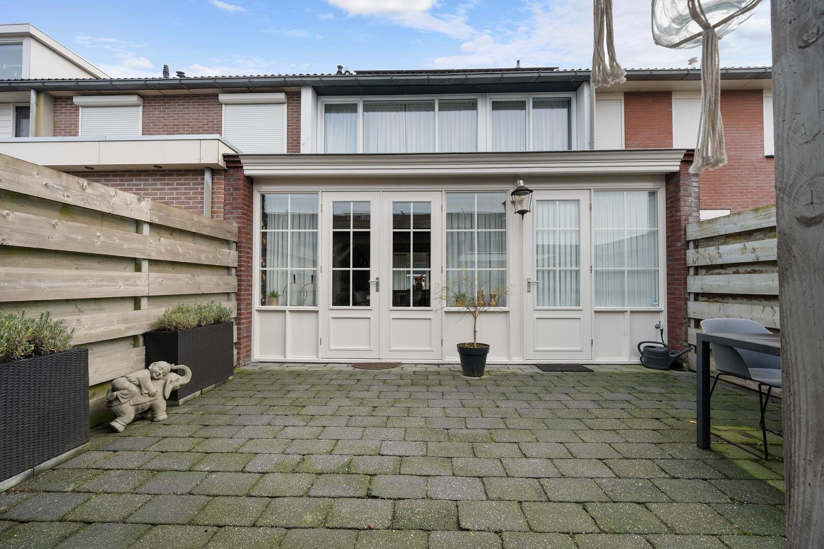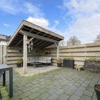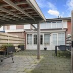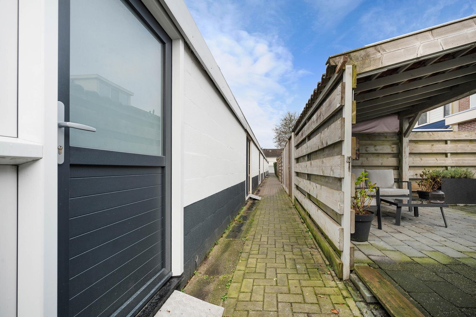 Tuin en bijgebouwen: de woning heeft aan de voorzijde, grenzend aan een looppad en groenstrook, een voortuin met sierbestrating, terwijl de op het westen gelegen achtertuin veel privacy biedt dankzij de omheinende schuttingen en een overkapping; via een achterom bereikt u de stenen berging met betonnen vloer, kunststof kozijnen en elektra, geheel in onderhoudsvrije afwerking.