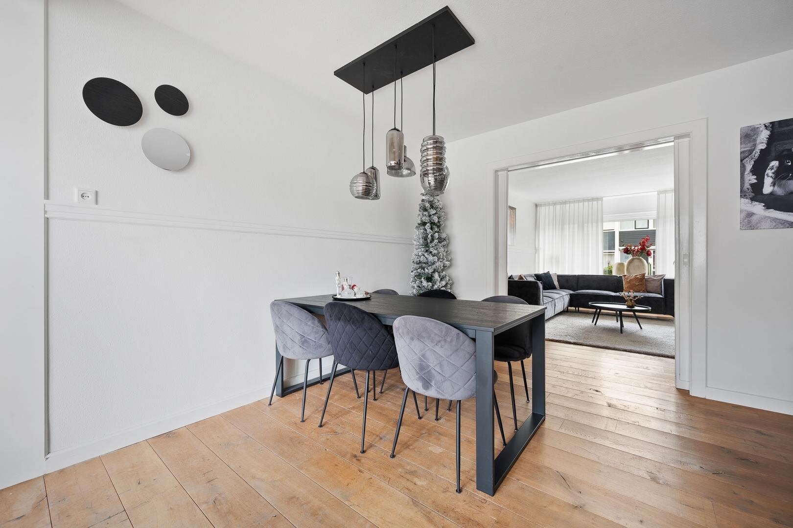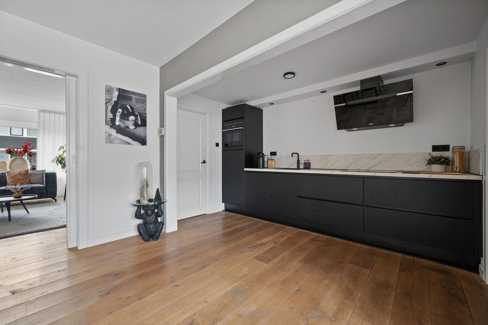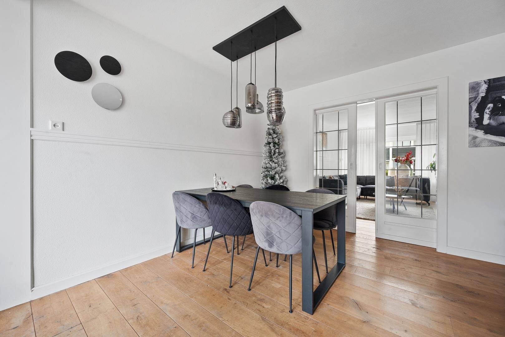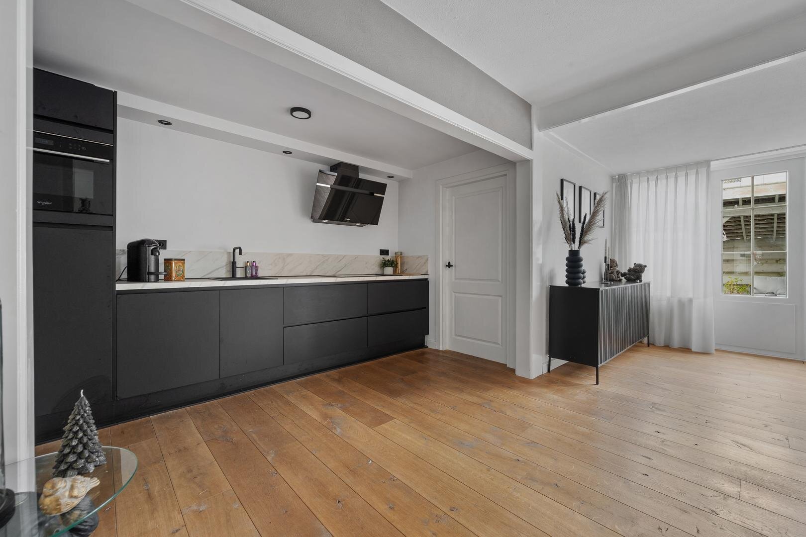 Begane grond: via de entree betreedt u de ruime hal met aansluitend een provisiekast en vernieuwde meterkast, gevolgd door een nette toiletruimte (2023). De doorzonwoonkamer met suitedeuren en houten plankenvloer loopt vloeiend over in een zeer ruime eetkamer met open keuken, voorzien van een nieuwe inbouwkeuken met apparatuur; koelkast, vaatwasser, inductie kookplaat, afzuigkap en combi-oven. De keuken is tevens voorzien van openslaande terrasdeuren naar de achtertuin. Aansluitend bevindt zich een ruime bijkeuken met de witgoedaansluitingen. De begane grond is keurig afgewerkt, praktisch ingericht en compleet te noemen.
