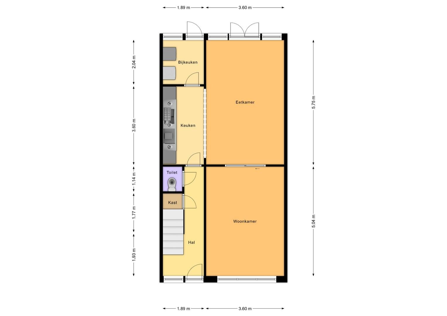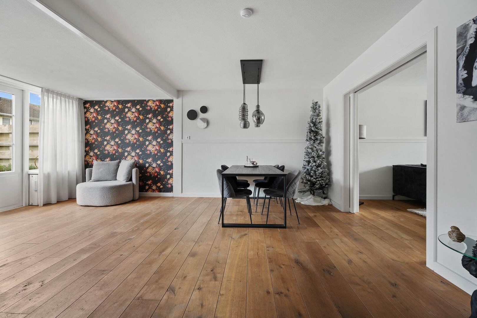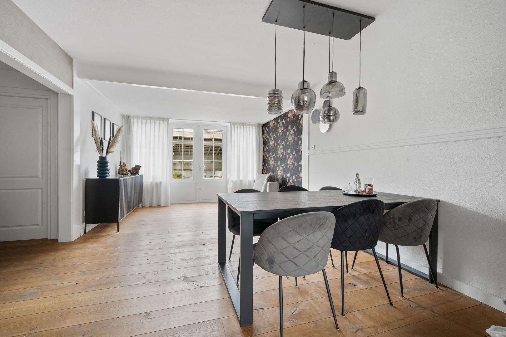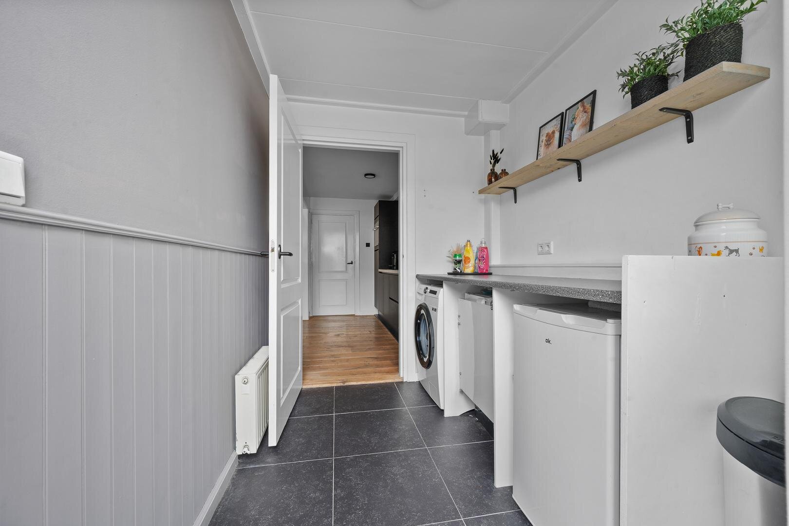 Begane grond: via de entree betreedt u de ruime hal met aansluitend een provisiekast en vernieuwde meterkast, gevolgd door een nette toiletruimte (2023). De doorzonwoonkamer met suitedeuren en houten plankenvloer loopt vloeiend over in een zeer ruime eetkamer met open keuken, voorzien van een nieuwe inbouwkeuken met apparatuur; koelkast, vaatwasser, inductie kookplaat, afzuigkap en combi-oven. De keuken is tevens voorzien van openslaande terrasdeuren naar de achtertuin. Aansluitend bevindt zich een ruime bijkeuken met de witgoedaansluitingen. De begane grond is keurig afgewerkt, praktisch ingericht en compleet te noemen.