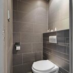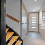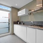 Begane grond: de entree/hal geeft toegang tot de meterkast, een vaste kast en een nette toiletruimte met wandtoilet, gevolgd door een dichte moderne keuken met apparatuur voorzien van koelkast, vaatwasser, 5-pits gaskookplaat, afzuigkap en combi-oven. Vandaaruit is de doorzonkamer met vrij uitzicht op het grasveld. De benedenverdieping is voorzien van een gietvloer.