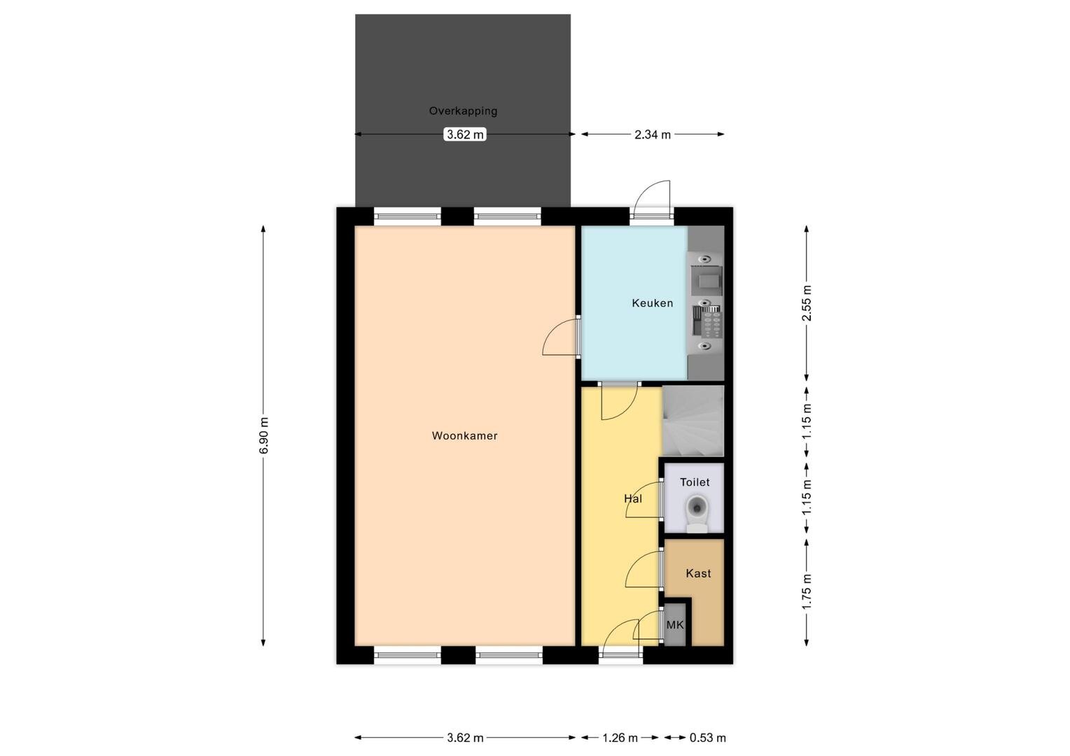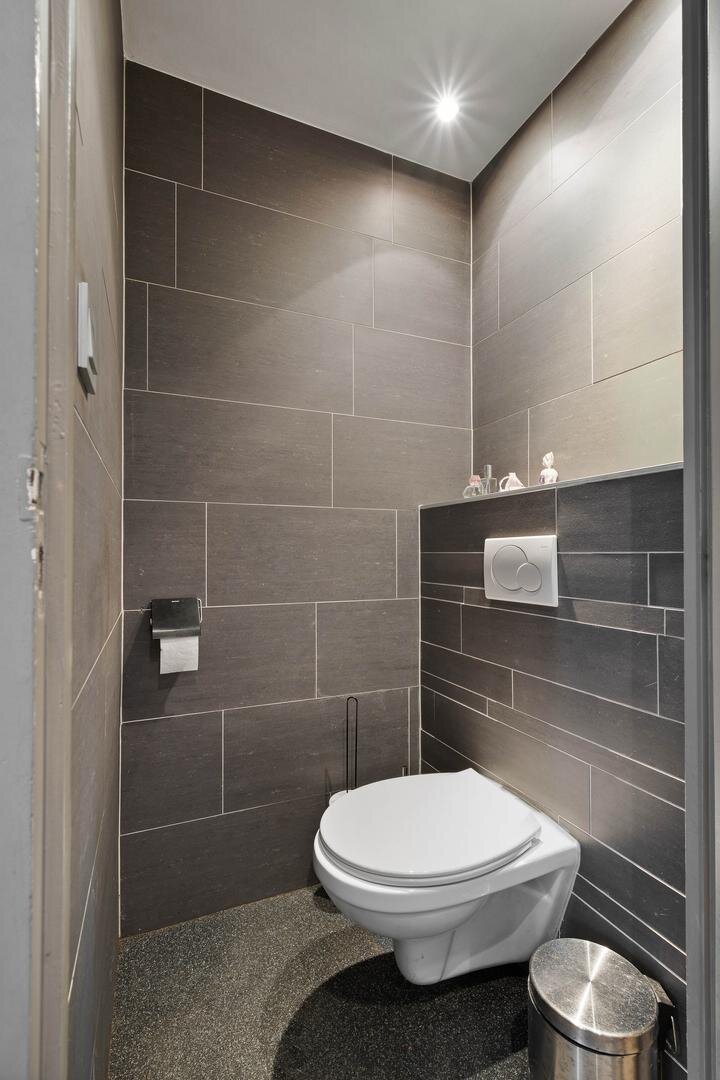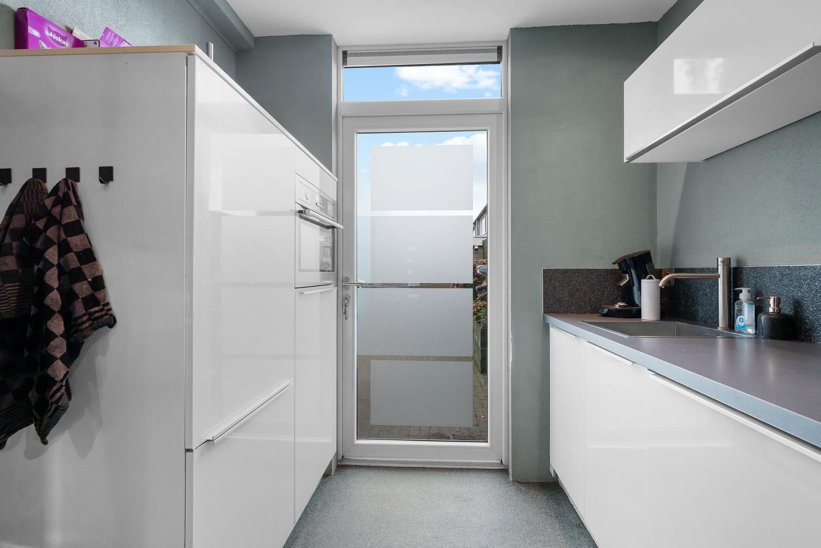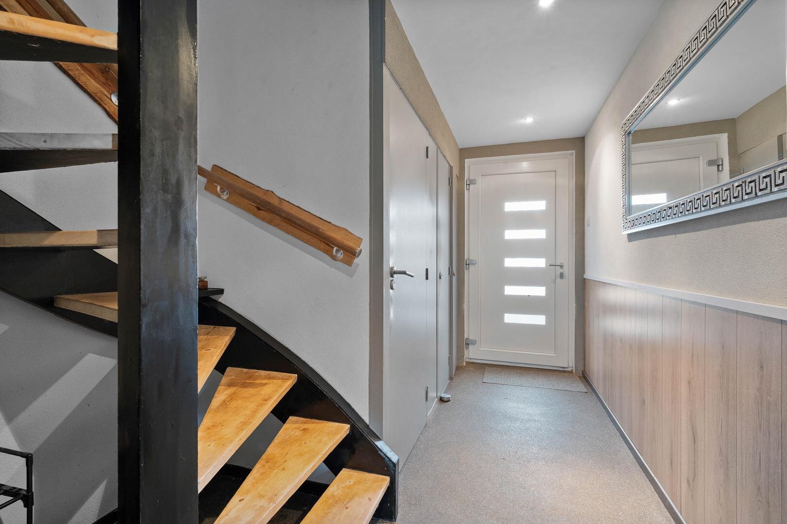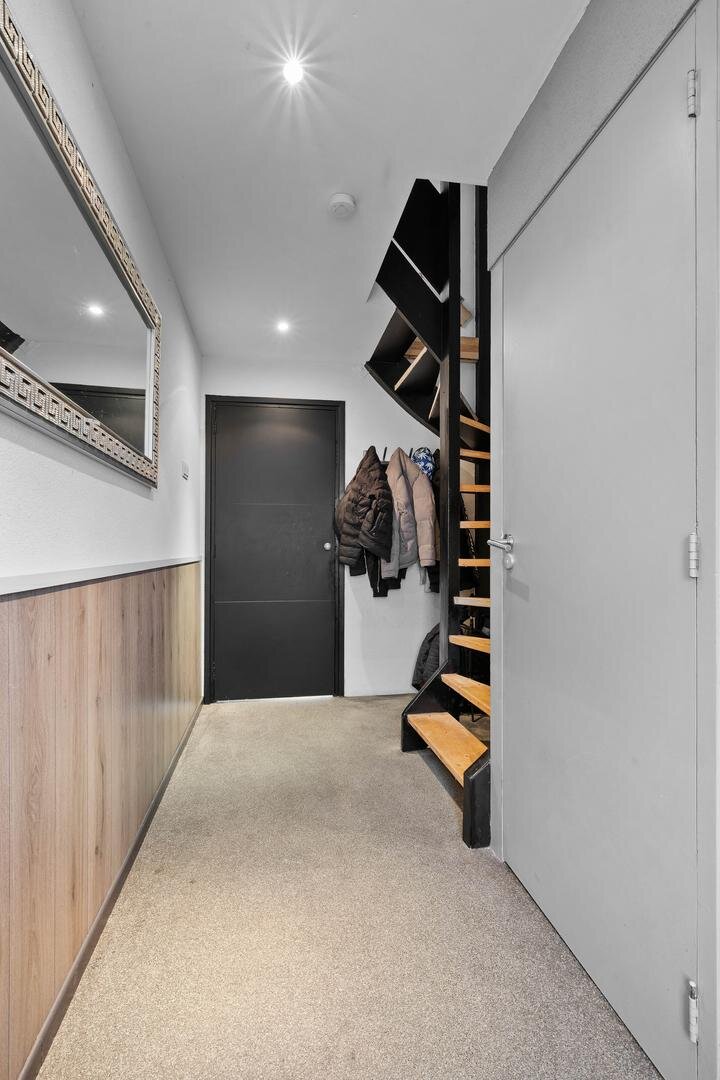 Begane grond: de entree/hal geeft toegang tot de meterkast, een vaste kast en een nette toiletruimte met wandtoilet, gevolgd door een dichte moderne keuken met apparatuur voorzien van koelkast, vaatwasser, 5-pits gaskookplaat, afzuigkap en combi-oven. Vandaaruit is de doorzonkamer met vrij uitzicht op het grasveld. De benedenverdieping is voorzien van een gietvloer.