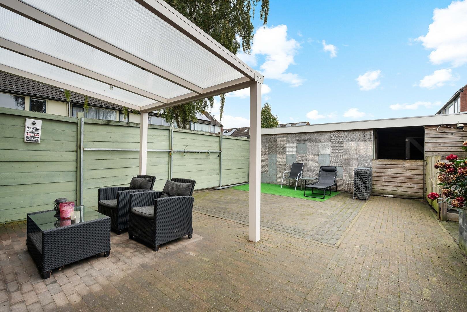 Tuin en bijgebouwen: de voortuin is voorzien van bestrating met parkeren voor de deur! De achtertuin is gelegen op het noordoosten en v.v. overkapping tegen het huis, sierbestrating, een bloemenborder en een vrijstaande stenen berging met een achterom.