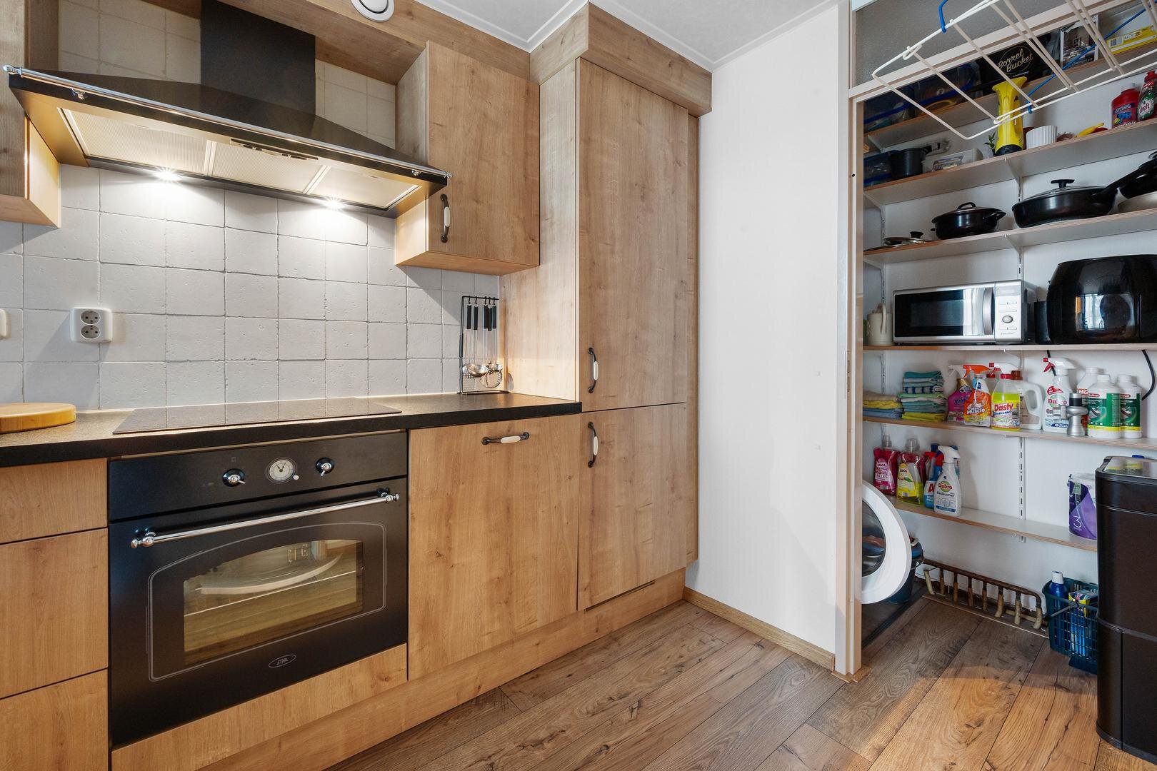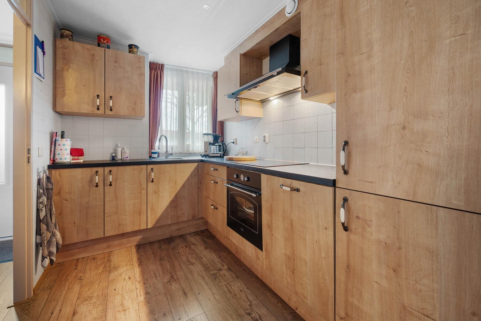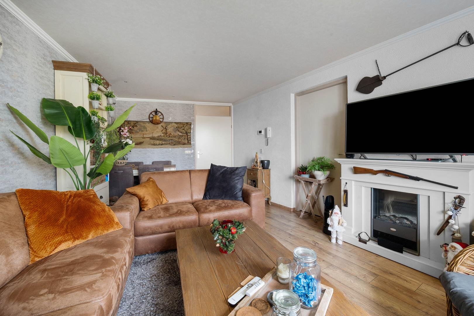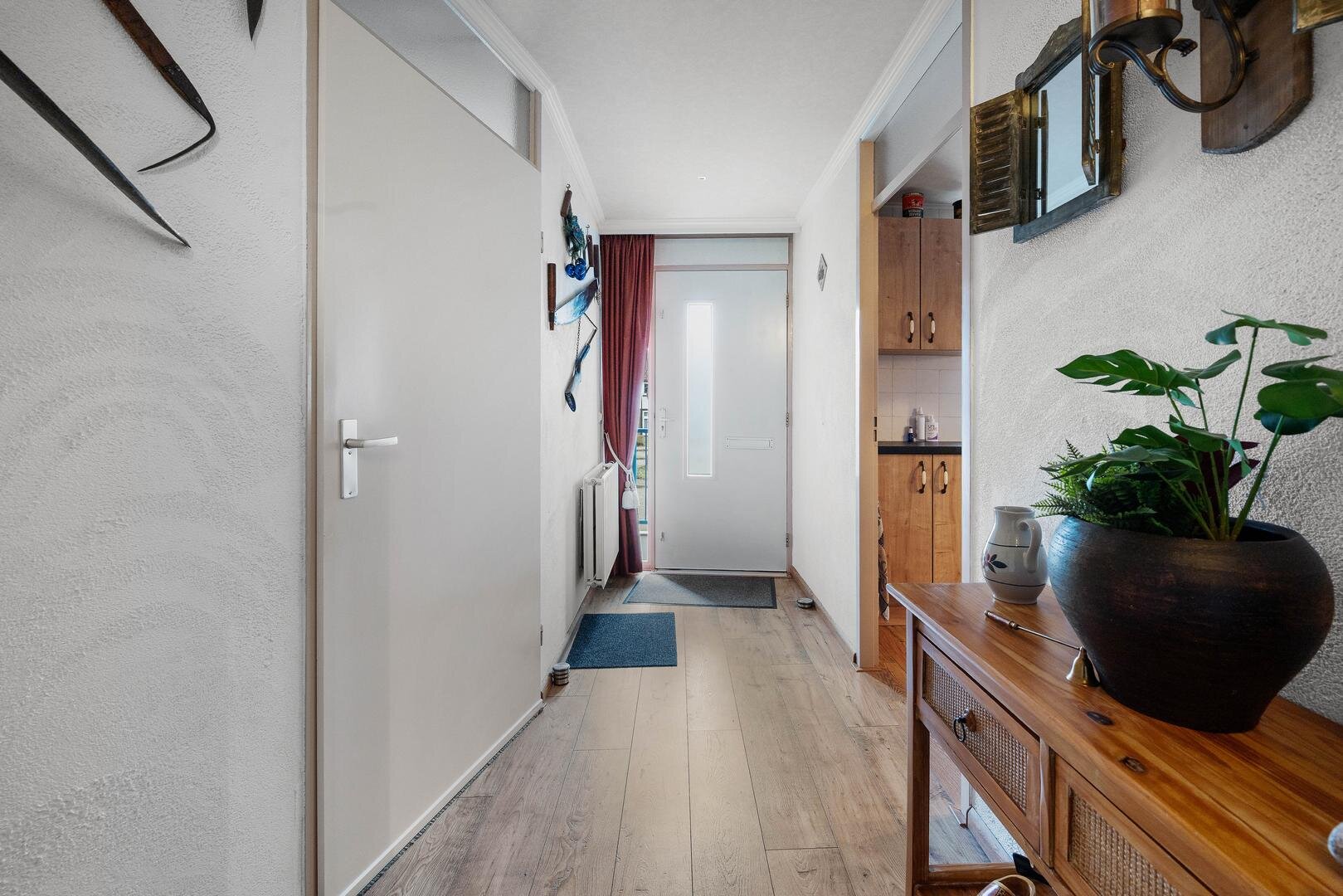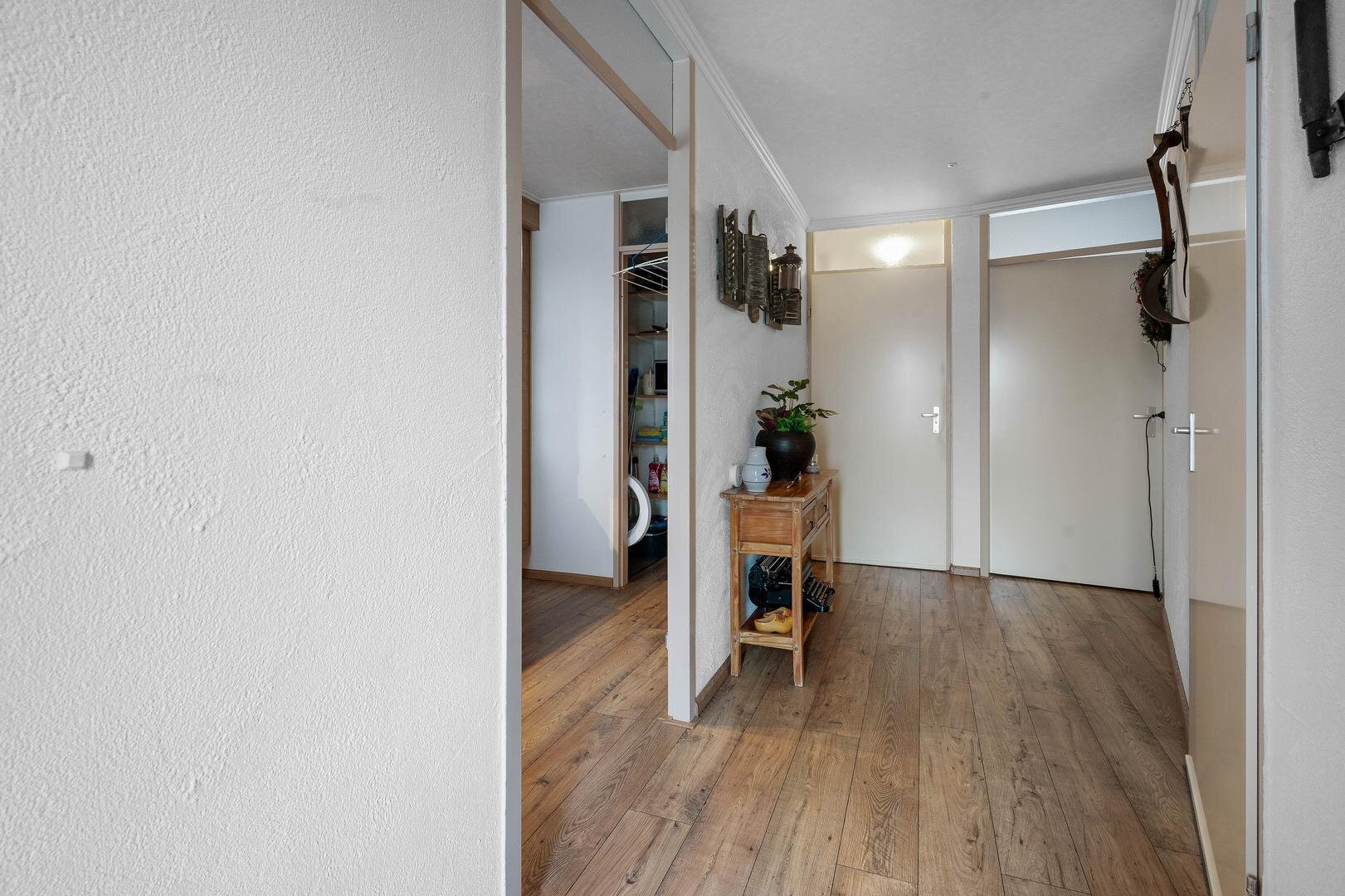 Appartement: hal/entree, toiletruimte, dichte keuken met moderne inbouwkeuken en apparatuur: koelkast, vaatwasser, vriezer, inductiekookplaat, afzuigkap en oven, berging met cv-ruimte en witgoedaansluitingen. De woonkamer biedt veel lichtinval en is tevens v.v. balkon op het zuiden, waarbij het laminaat en het spanplafond (beide uit 2020) zorgen voor een frisse en complete afwerking. Er zijn 2 prima slaapkamers, aansluitend is de badkamer te bereiken voorzien van wastafelmeubel, douchecabine en radiator.