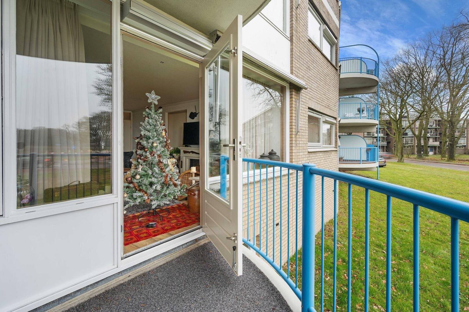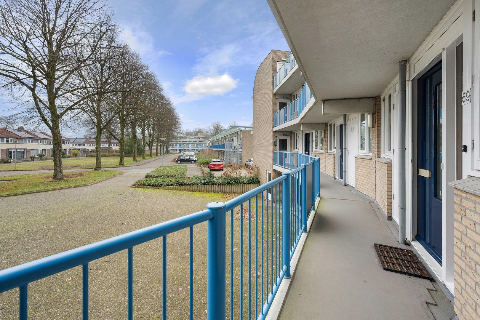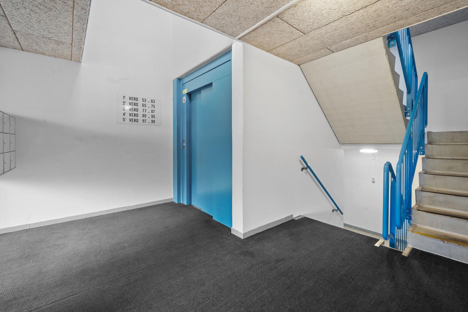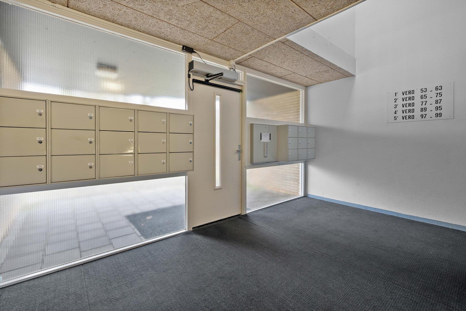 Begane grond: vanuit de afgesloten centrale hal met intercom bereikt u via de liftinstallatie of het trappenhuis met bordestrap naar de eerste verdieping, waarna u over de galerij bij de entree van het appartement komt.
